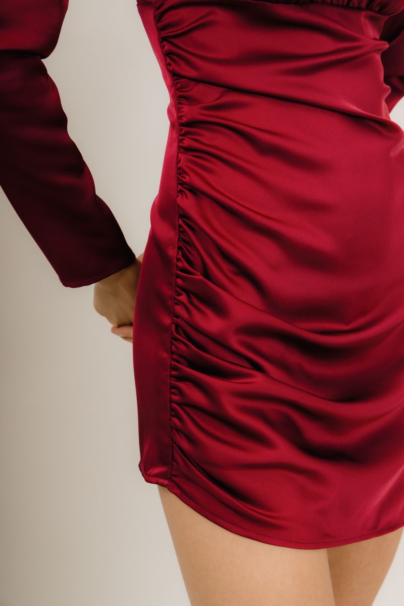 Isabel Dress fra Urban Pioneers. Isabel Dress er nydelig kjole laget i en luksuriøs satengblanding med sin elegante høye hals, flatterende lange ermer og draperinger som ender i en moderne asymmetrisk fald. Tilgjengelig i burgunder og svart – to farger som understreker kjolens elegante uttrykk. Et perfekt valg for alt fra festlige anledninger til kvelder der du vil skinne litt ekstra. Normal i størrelsen.