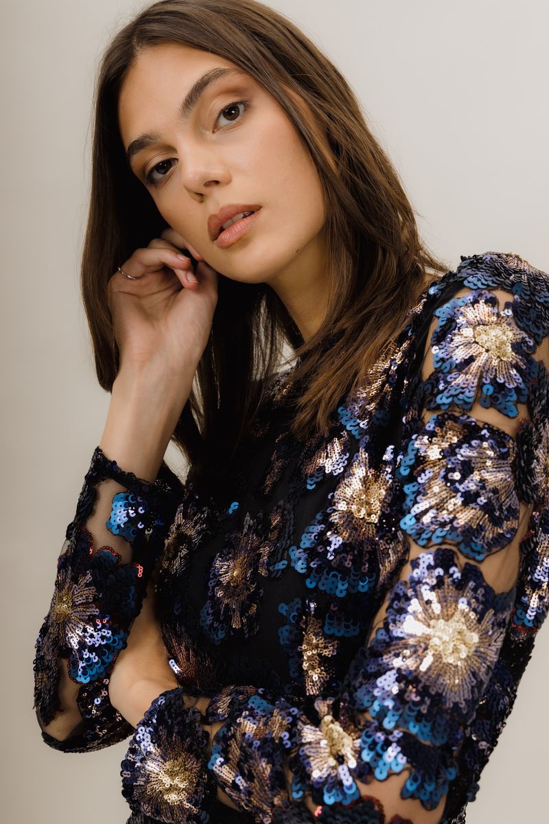 Kiara Dress fra Urban Pioneers. Kiara Dress er en nydelig kjole med en flatterende silhuett og glitrende blomsterdetaljer i delikat perlearbeid. De lange ermene og det elegante designet gjør den perfekt til fest og spesielle anledninger. Normal i størrelsen.