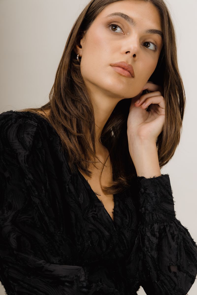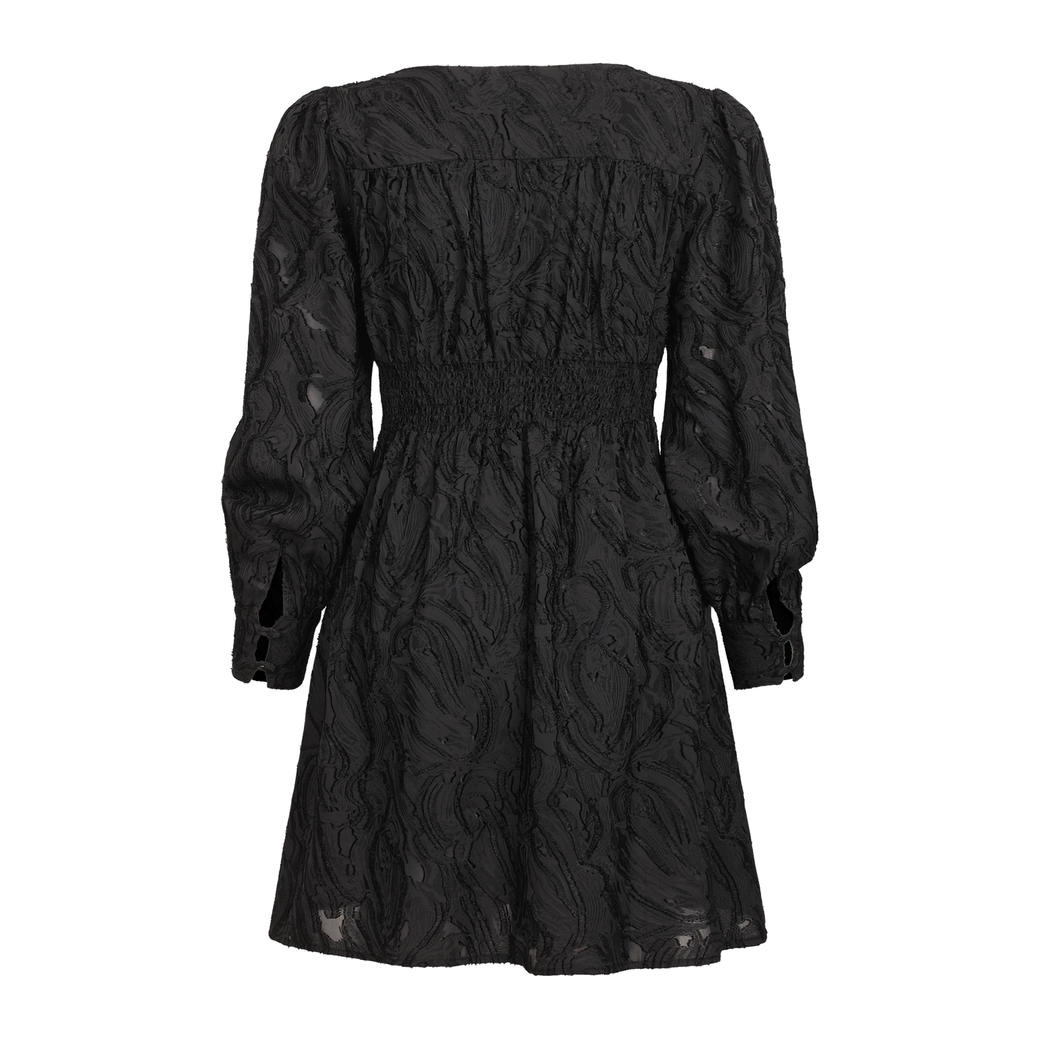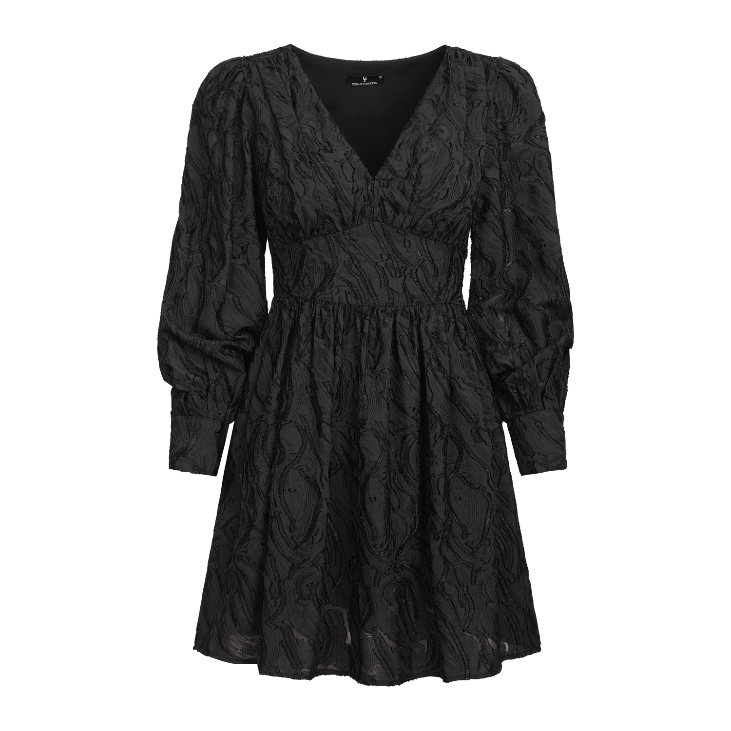 Kaylee Dress fra Urban Pioneers. Kaylee Dress er en kort jacquardkjole med intrikat, teksturert mønster som tilfører dybde og eleganse. Designet har en flatterende silhuett med lange ermer, ideell for kveldsbruk og spesielle anledninger. Normal i størrelsen.