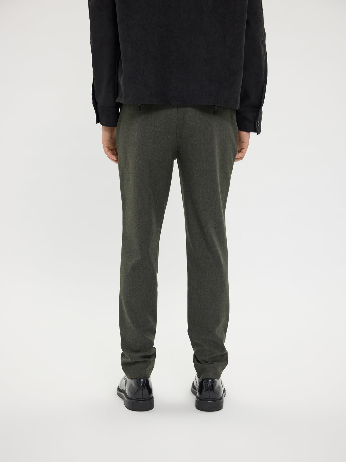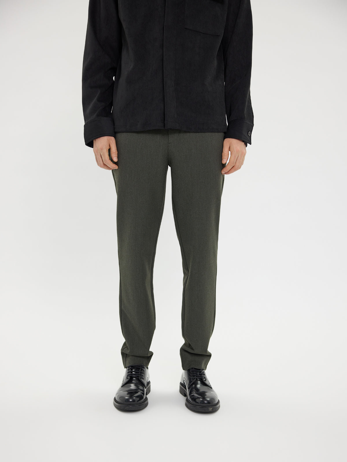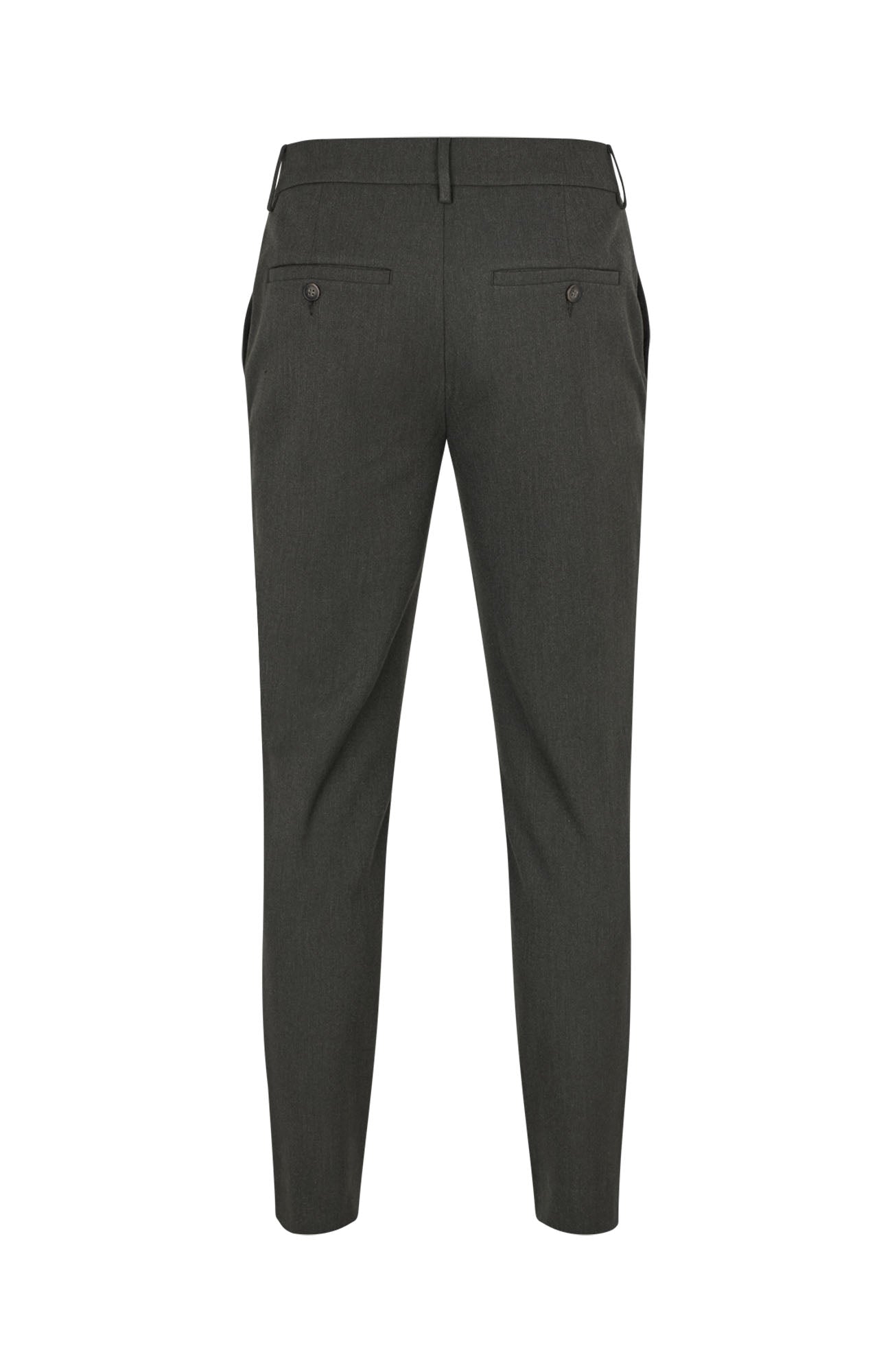 JoshPL 075 fra Plain. JoshPL 075 er formelle bukser i en dyp skogsmelertone, perfekte for å heve antrekket ditt ved spesielle anledninger. Buksen har slim fit, mid-waist og regular lengde med fleksibel midje. Normal i størrelsen.