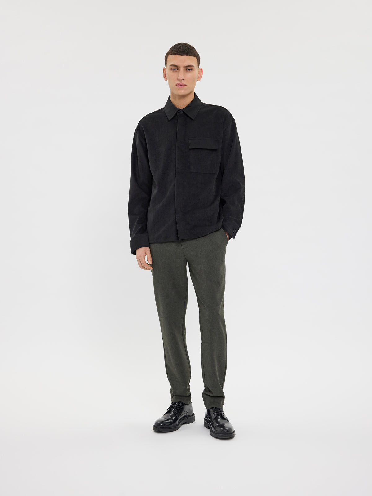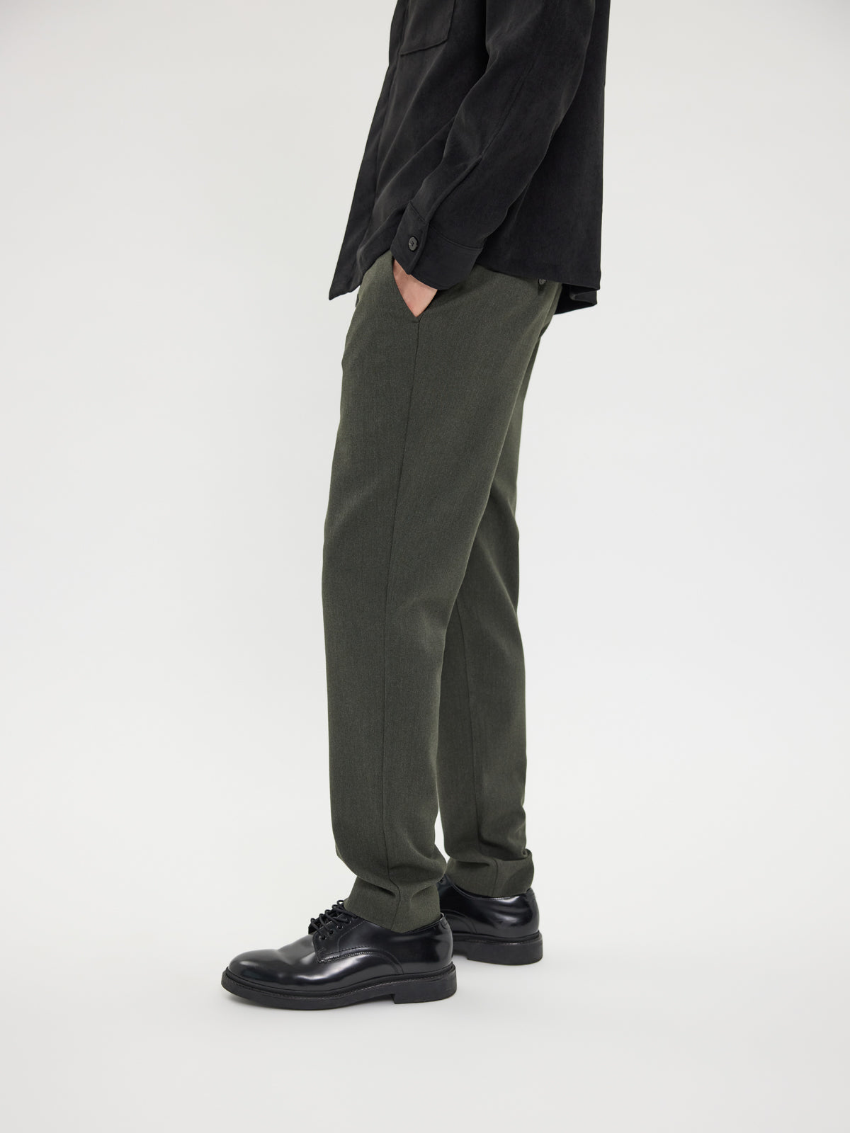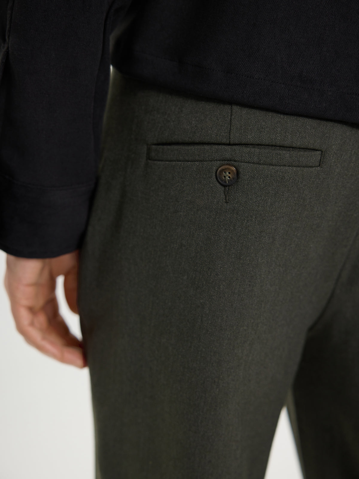 JoshPL 075 fra Plain. JoshPL 075 er formelle bukser i en dyp skogsmelertone, perfekte for å heve antrekket ditt ved spesielle anledninger. Buksen har slim fit, mid-waist og regular lengde med fleksibel midje. Normal i størrelsen.