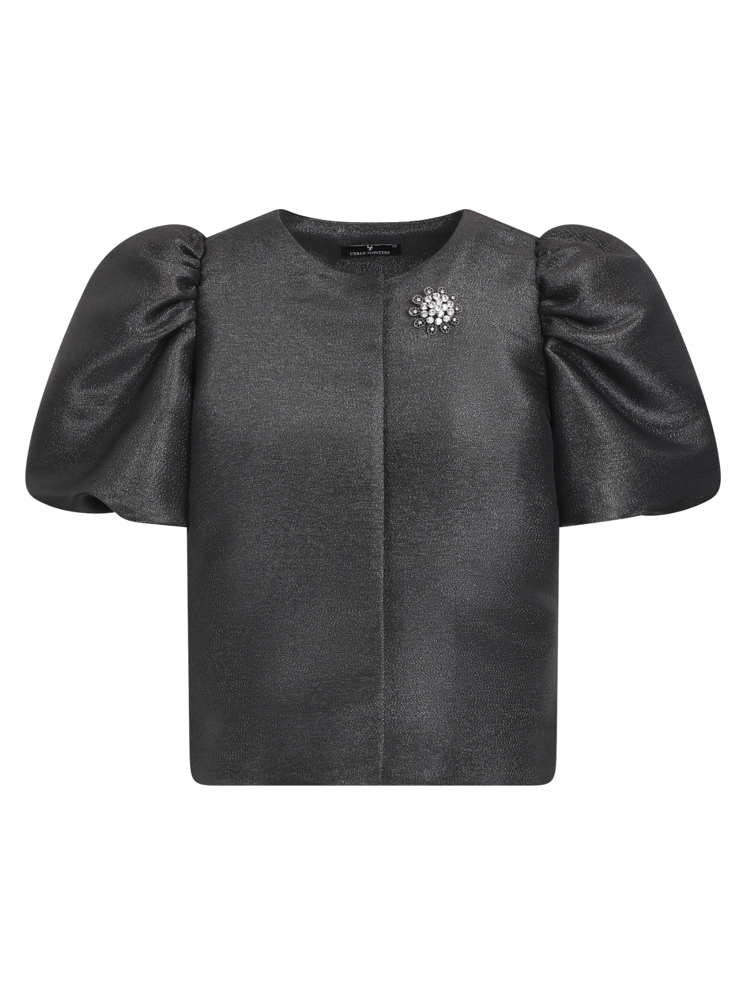 Floris Jacket fra Urban Pioneers. Floris Jacket er en elegant cropped jakke med et delikat metallic shimmer som gir antrekket det lille ekstra. Jakken er designet med puffede ermer og lukkes med diskrete hemper i front. En liten pin-detalj på brystet tilfører et unikt og moderne preg. Perfekt både til festlige anledninger og for å løfte hverdagslooken. Normal i størrelsen.