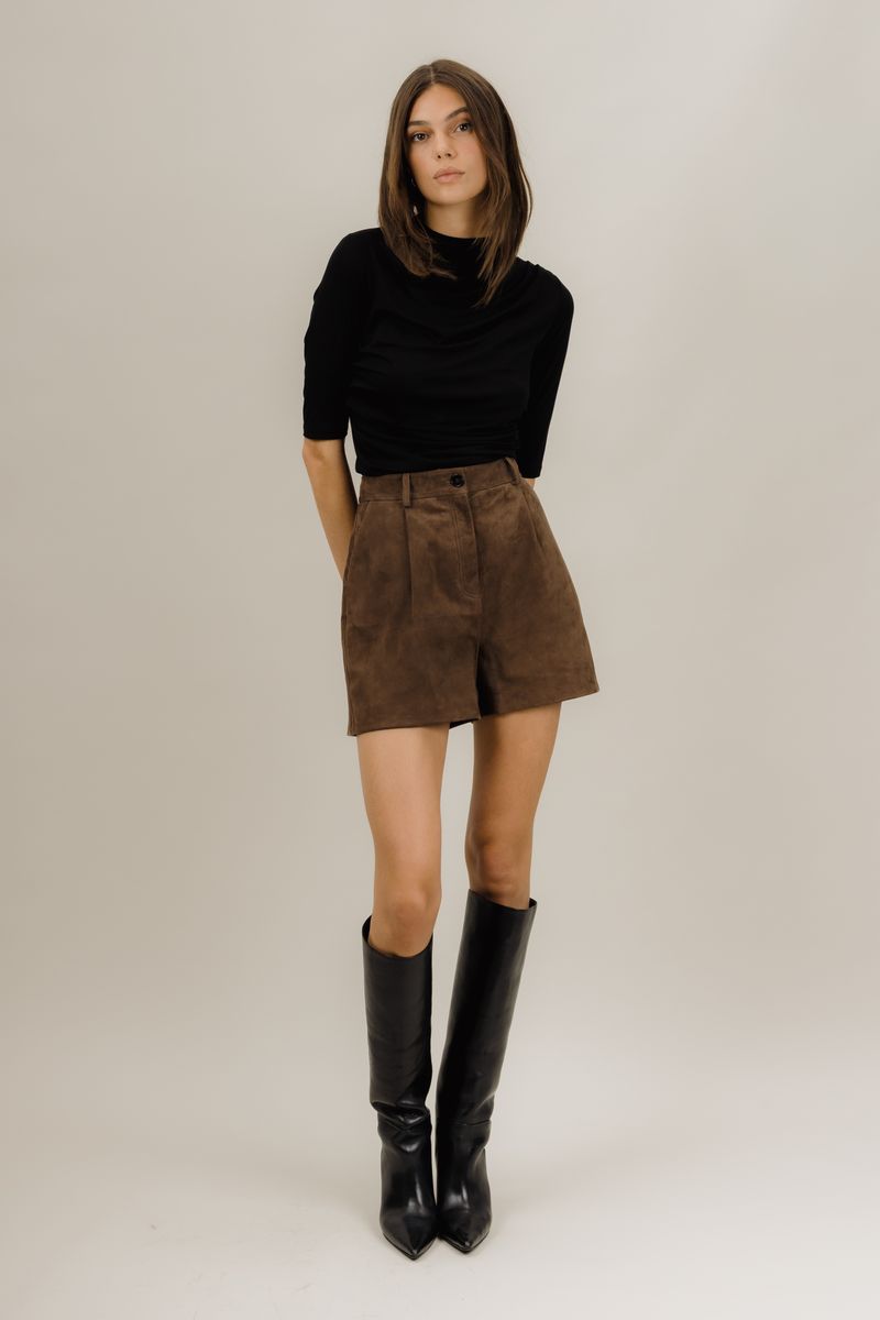 Jayla Suede Shorts fra Urban Pioneers Atelier. Jayla Suede Shorts er et par stilrene og tidløse skinnshorts laget av 100% mykt geiteskinn. De har en komfortabel passform og et allsidig snitt som gjør dem like fine til pyntede anledninger med strømpebukse som til stilige hverdagsantrekk. Normal i størrelsen.