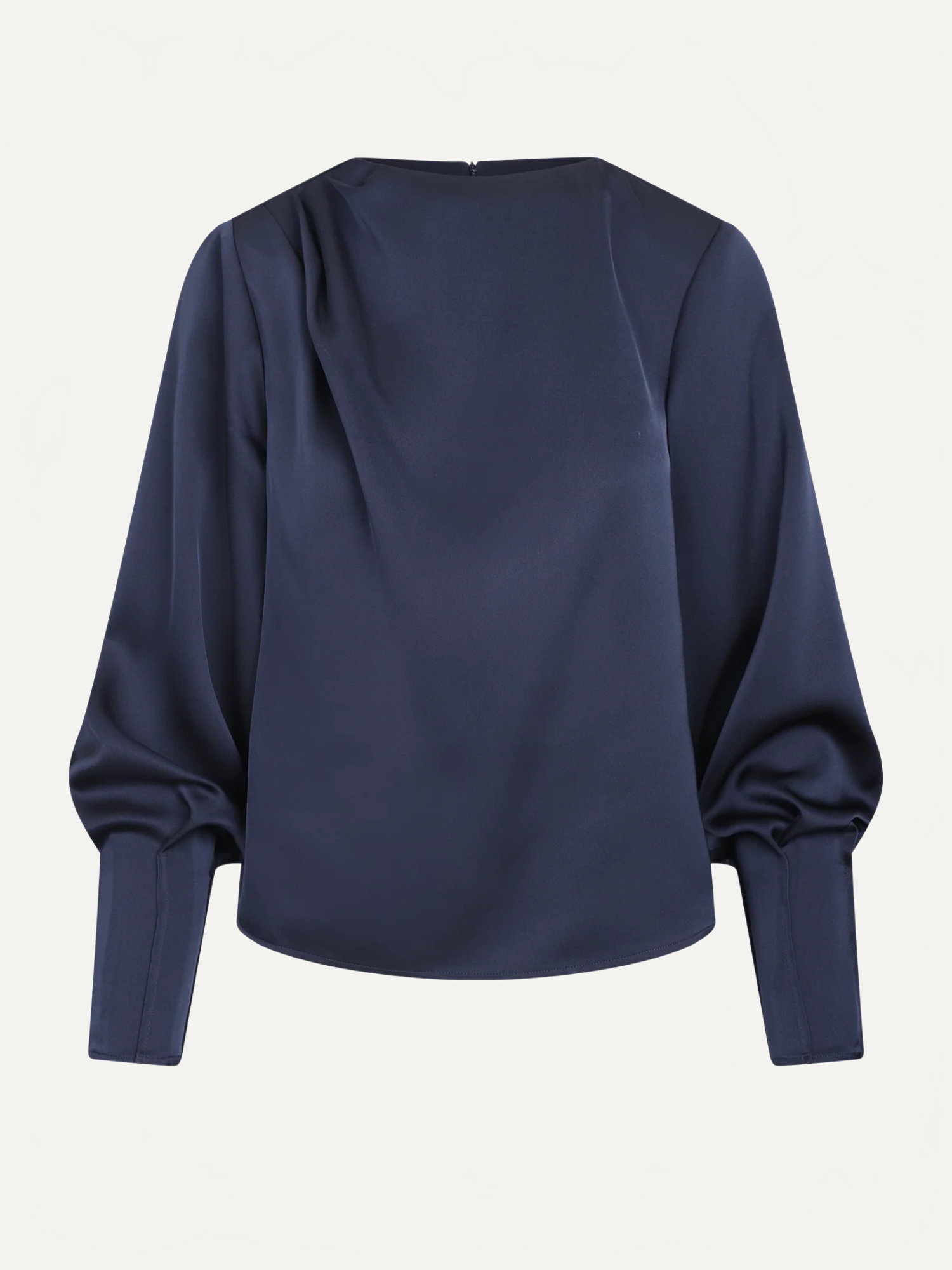 Kirstine Blouse fra Urban Pioneers. Kirstine Blouse er en elegant satengbluse med en delikat drapering på den ene skulderen. Brede mansjetter med knapper. Perfekt å style med Gamma Skirt for et komplett og matchende sett. Blusen er normal i størrelsen og passer like fint til hverdag som til fest.
