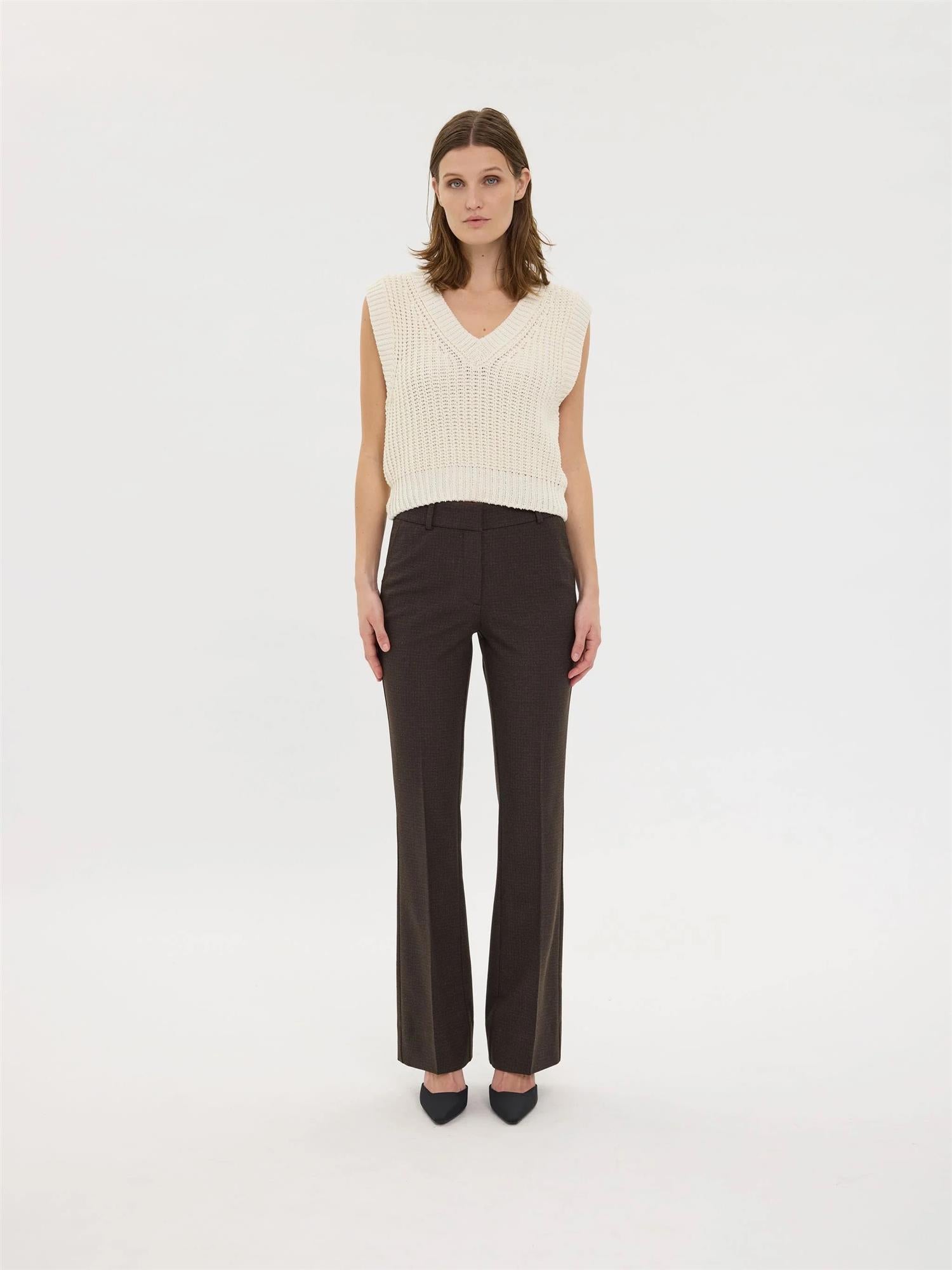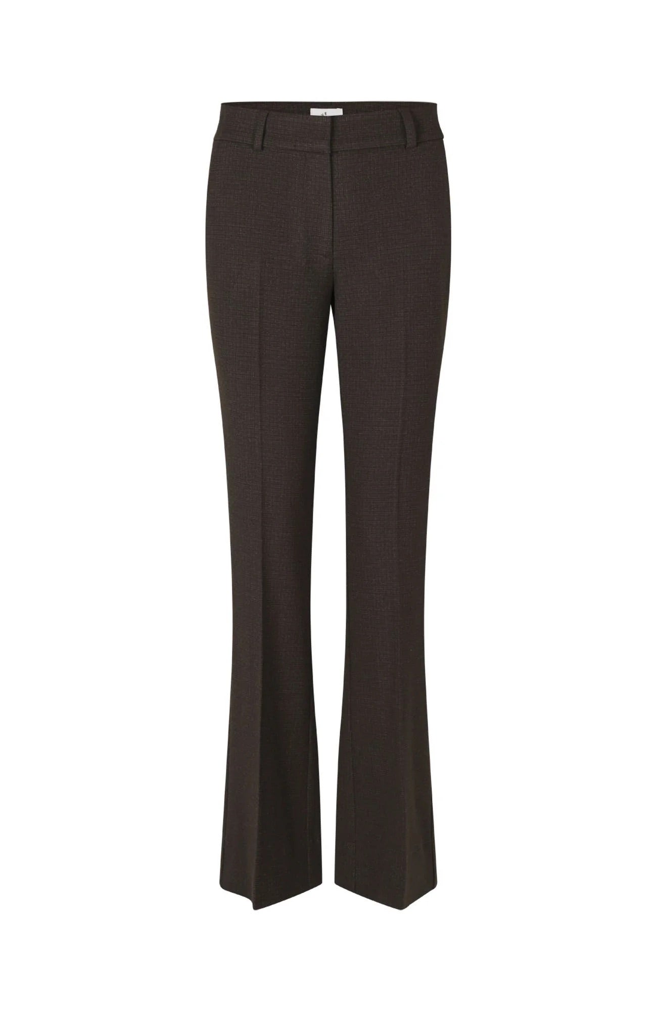 FiveunitsClaraFV 032 Long - Mocca Check fra Five Units. Clara Long 032 fra Five Units er stilrene bukser med en flatterende flared-fit som sitter behagelig på hoftene. Den mid-waist passformen kombinert med den elegante utsvingen fra knærne skaper en langstrakt og sofistikert silhuett. Pressede folder og gjennomførte ben-detaljer gir et eksklusivt uttrykk, mens den allsidige passformen gjør dem enkle å style både til jobb, fest og hverdagsbruk. Kombiner med en skjorte og hæler for en raffinert look, eller med en strikkegenser og sneakers for en avslappet, men stilfull stil. Normal i størrelsen.
