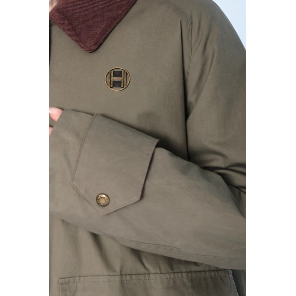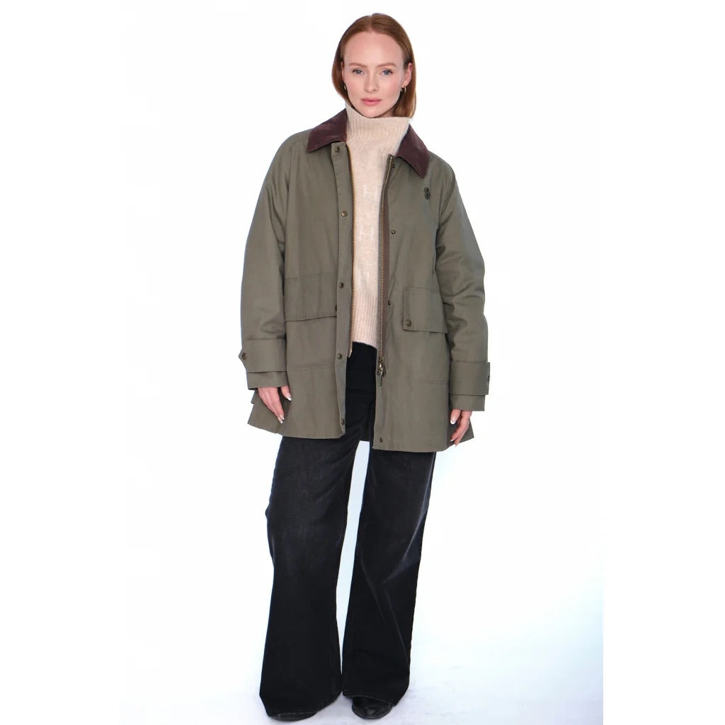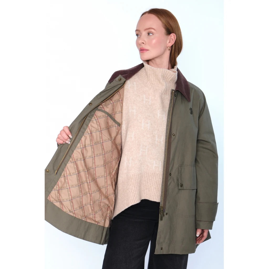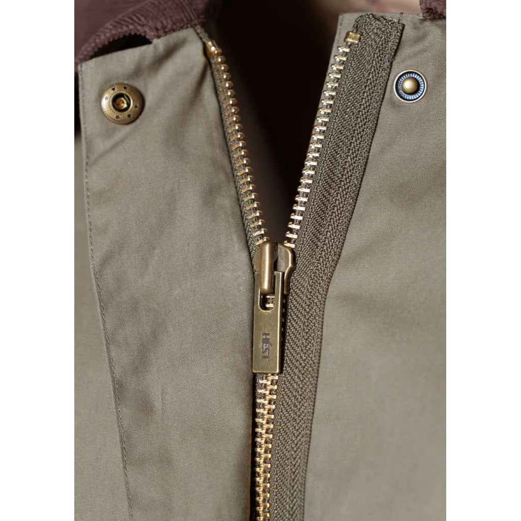 Ofelia Jacket fra Hést. Ofelia Jacket er en tidløs jakke med avslappet passform og karakteristiske H-broderier på lommene og bærestykket. Den er laget i 100% vokset bomull som gir en slitesterk og værbestandig overflate, kombinert med en stilig cordfløyelskrage som tilfører et unikt preg. En perfekt kombinasjon av klassisk design og moderne uttrykk – ideell for både hverdagsbruk og mer gjennomførte antrekk. Normal i størrelsen.