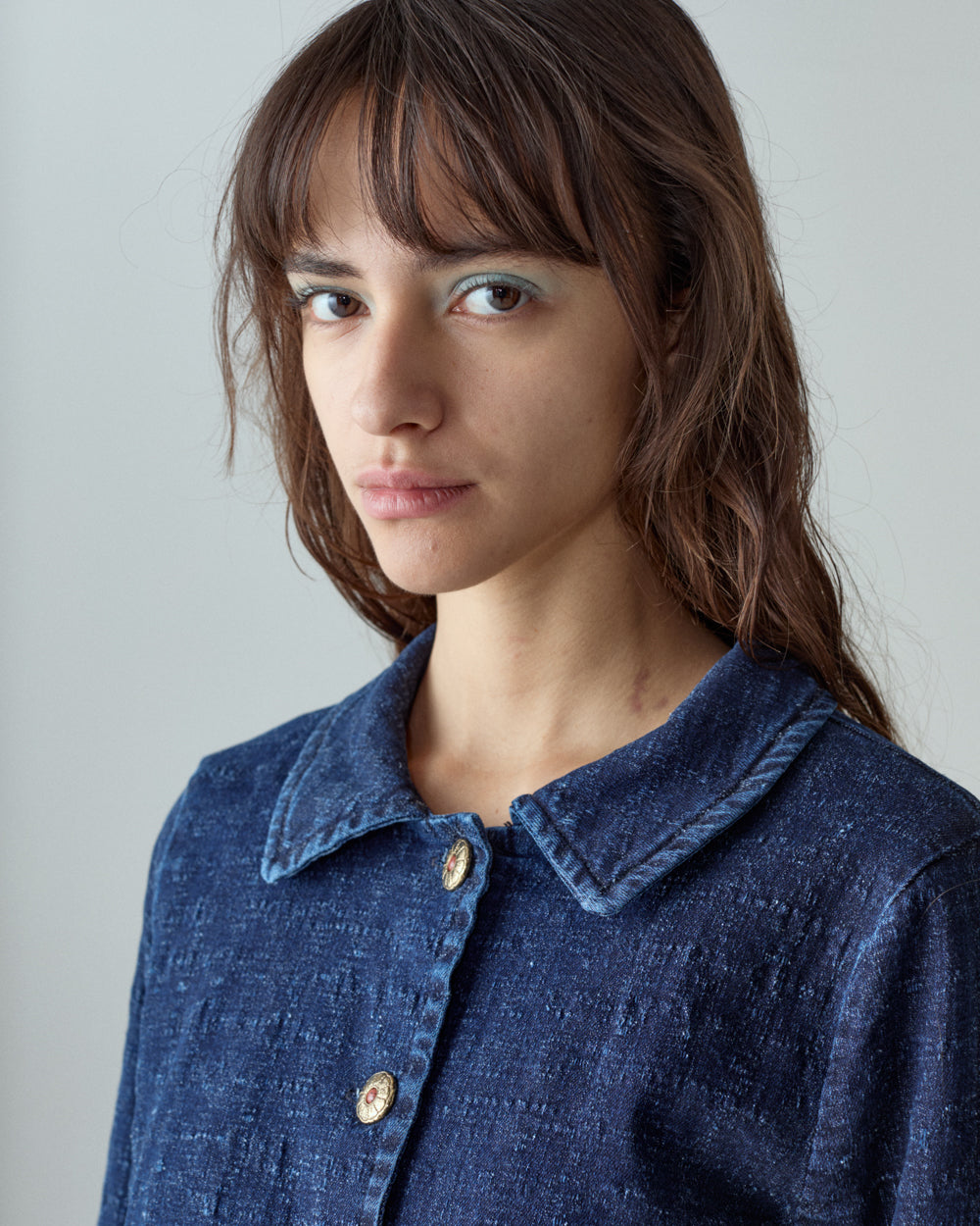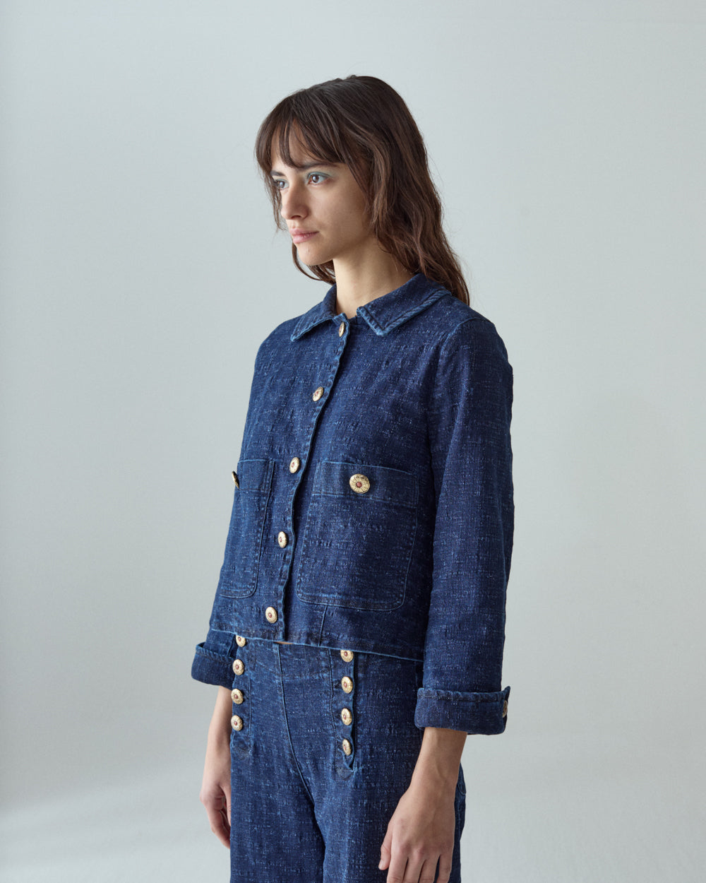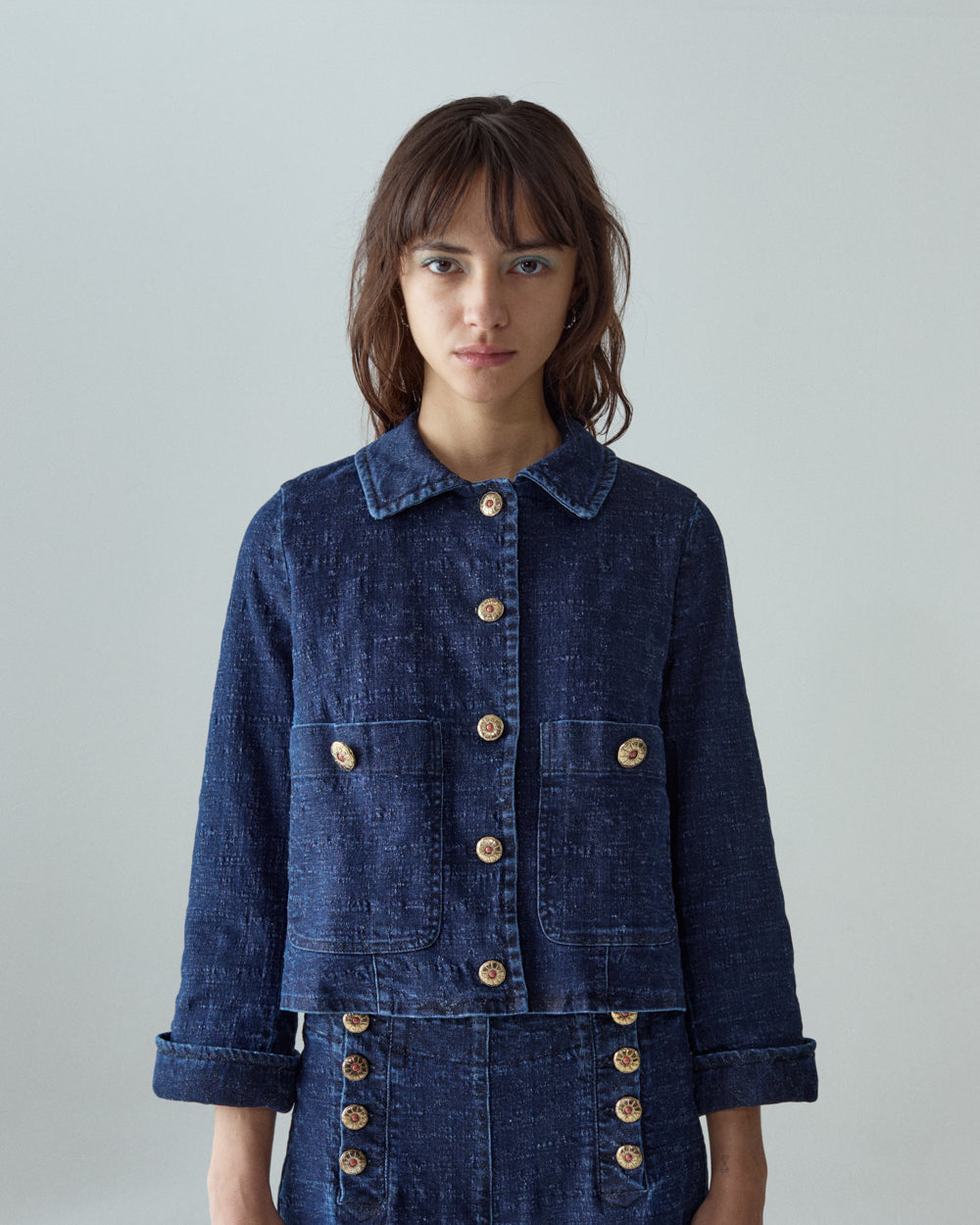 Jacket Franci Matelasse Carre Shaft Jeans. En kort jakke i strukturert denim med krage og rette linjer. Modellen har lommer foran og dekorative knapper som gir et stilrent uttrykk. Fôret innside for komfort. Kan styles sammen med Sassy-buksen i samme stoff for et helhetlig uttrykk.