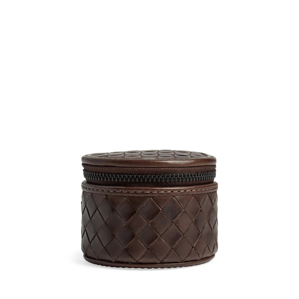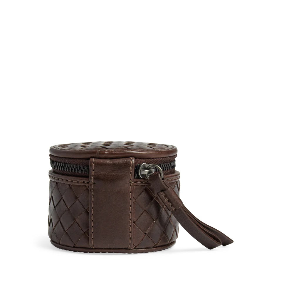 LovaMBG Jewelry Box S fra Markberg. Et lite og kompakt smykkeskrin i håndflettet antique skinn. Modellen har fast rund form, lukkes med glidelås og inkluderer tre flate smykkeputer med to lommer i hver for ringer, øredobber og halskjeder, samt én tykk smykkepute for tynne ringer og øredobber. Ekstra smykkeputer kan kjøpes separat.