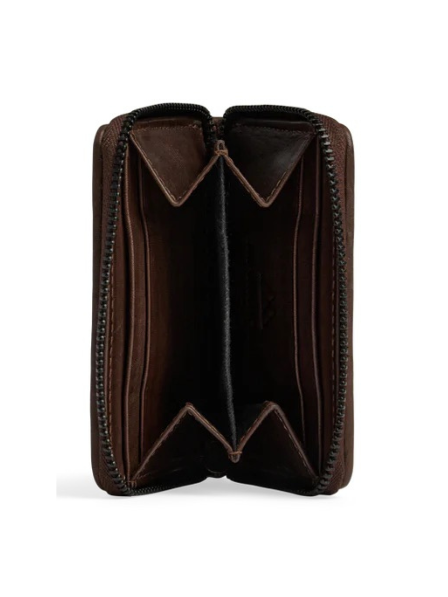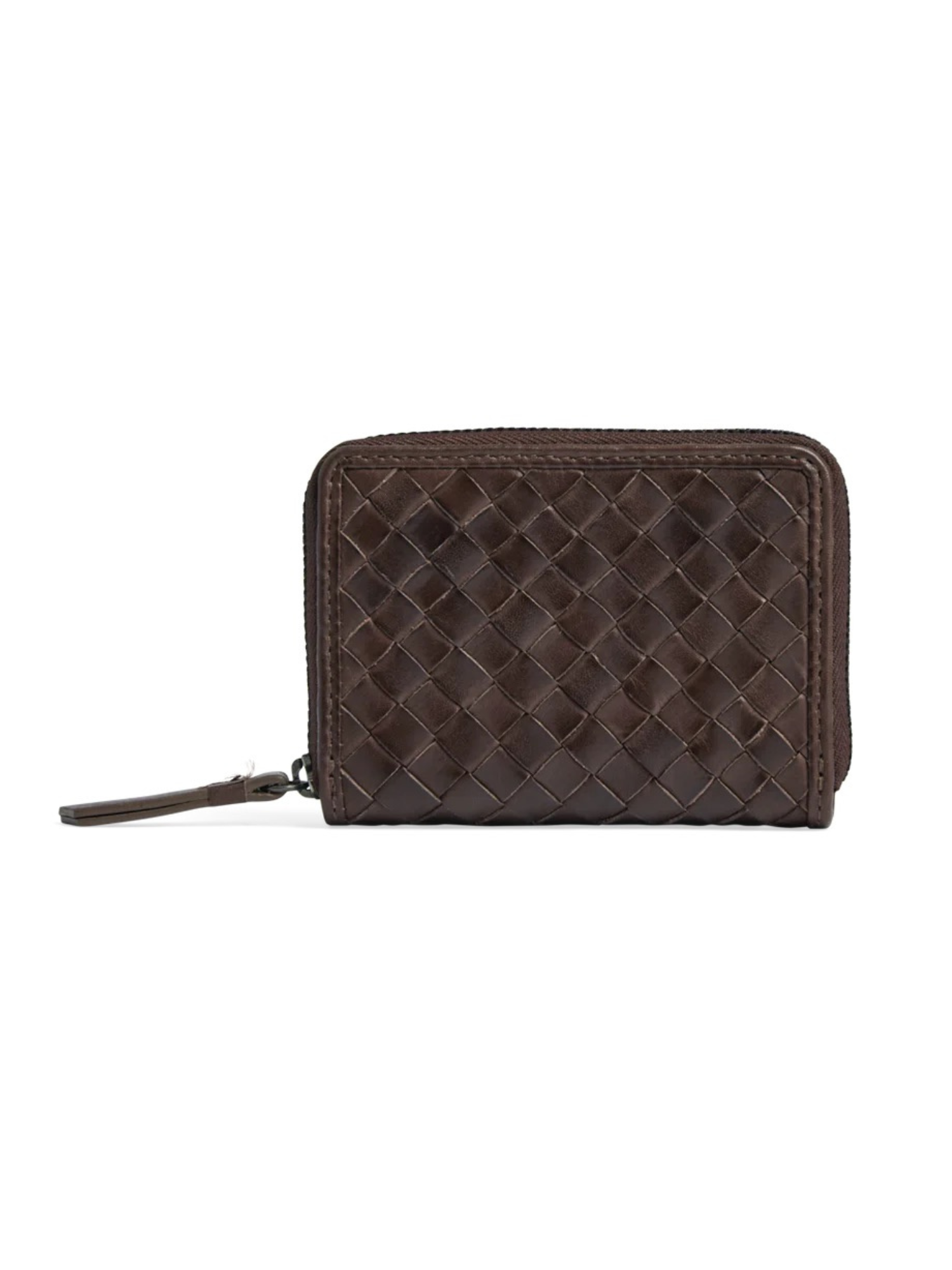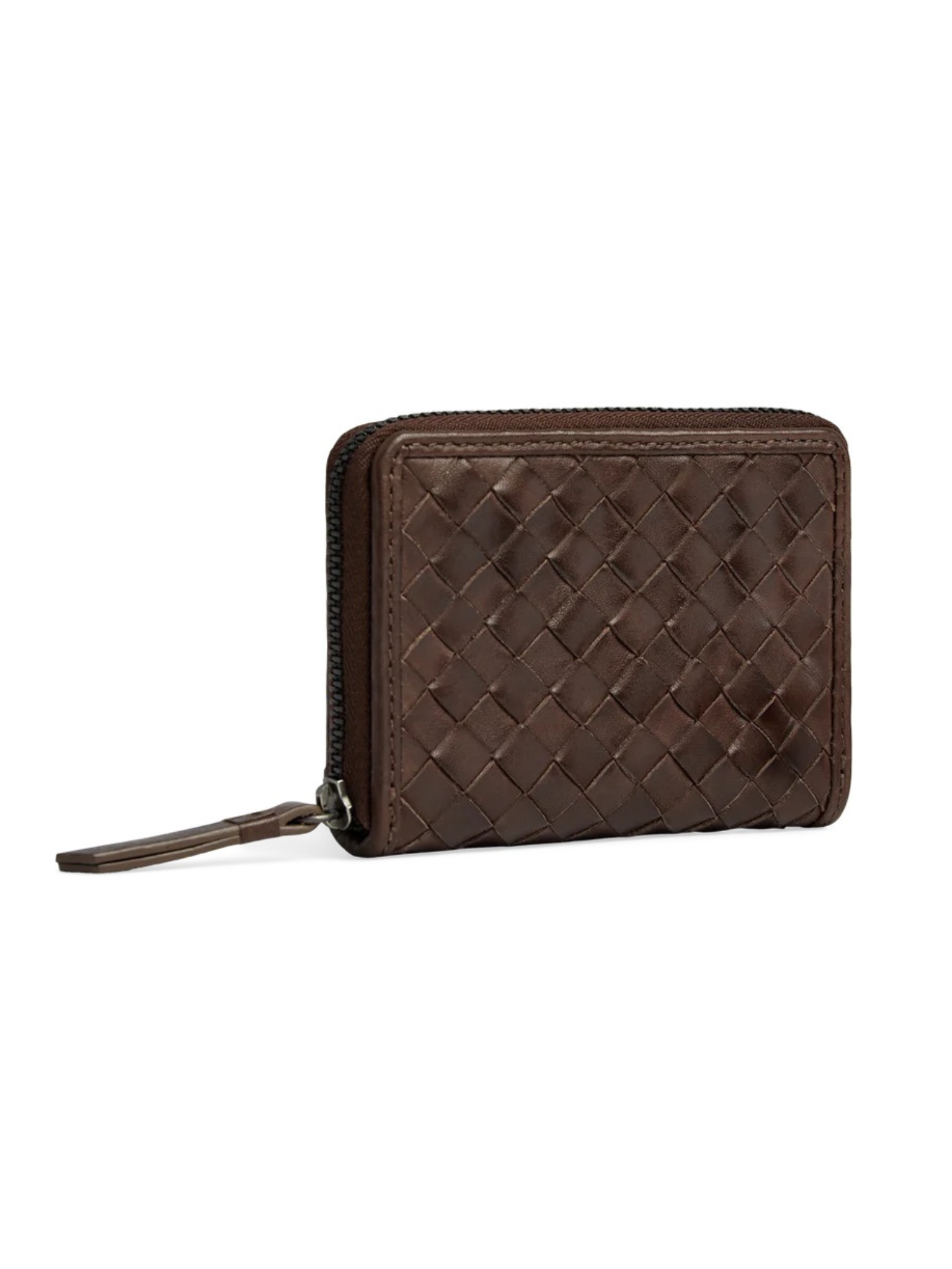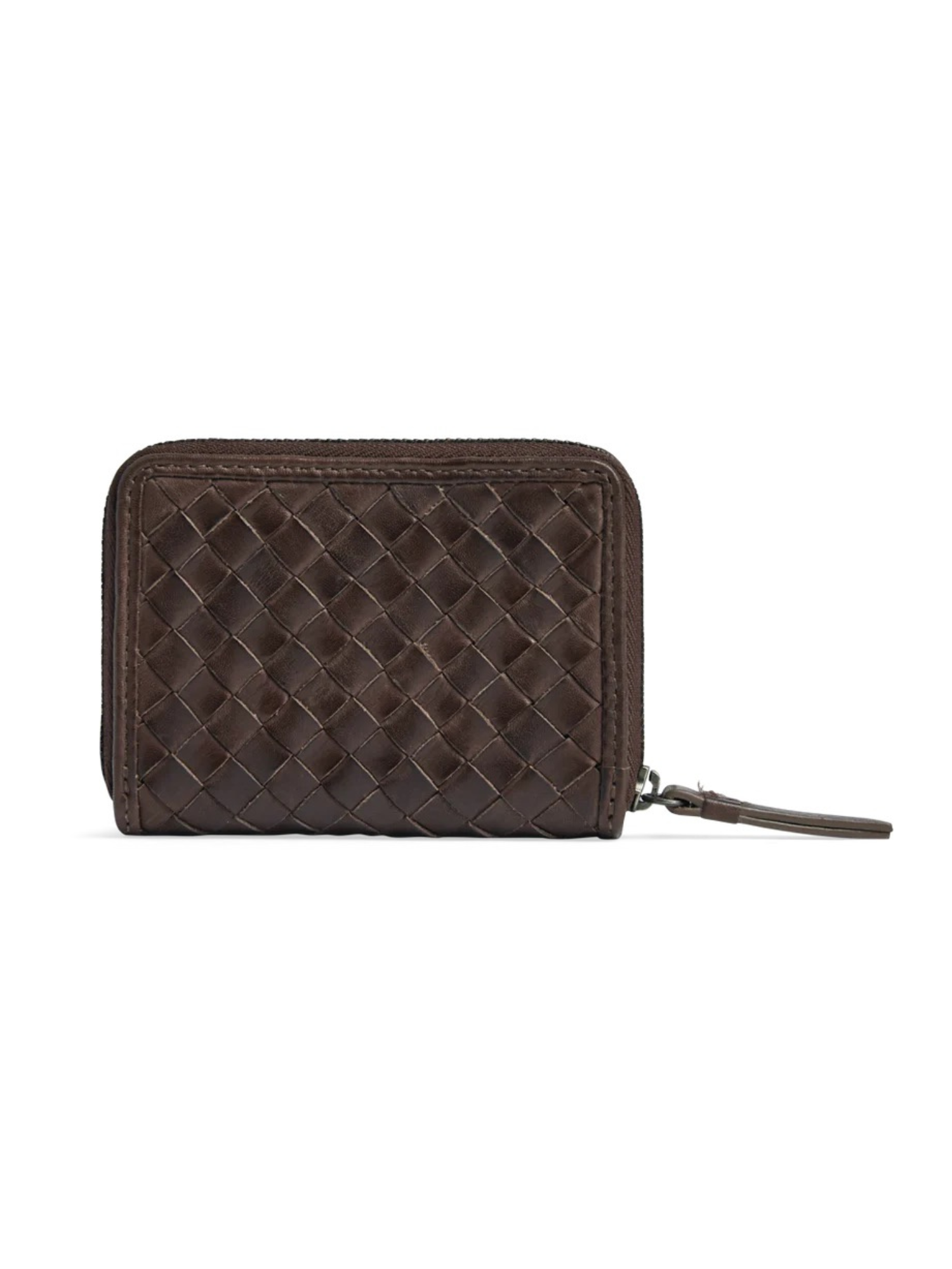 SelmaMBG Wallet fra Markberg. En kompakt lommebok i håndflettet antique skinn med elegant uttrykk. Modellen har fire kortholdere innvendig og lukkes med glidelås.