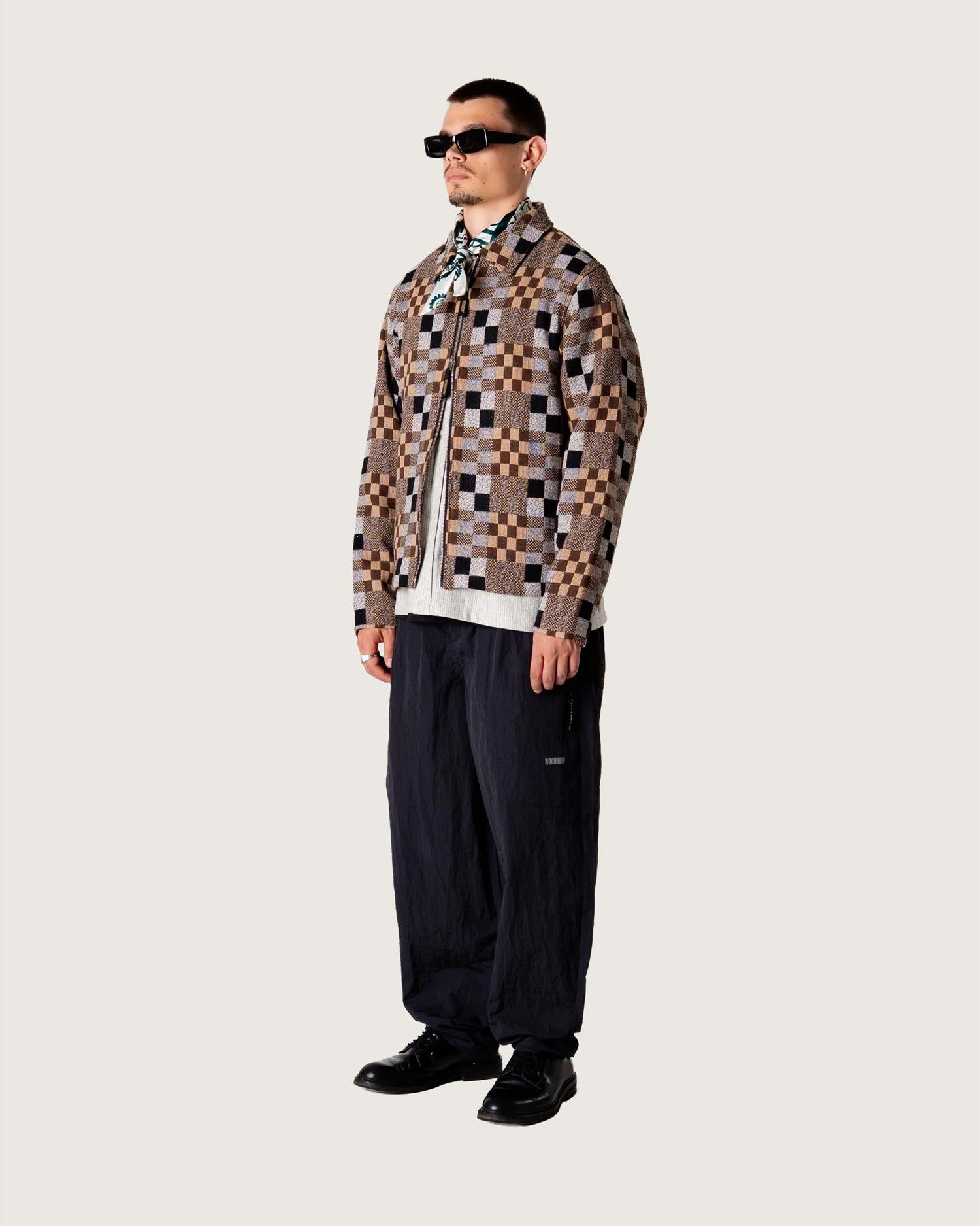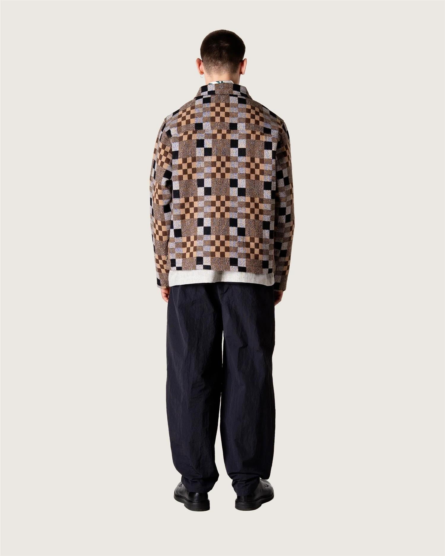 Buck Patch Jacket fra Woodbird. Buck Patch Jacket er en jakke med glidelås og klassisk krage, laget i en myk blanding av polyester og ull. Den har lange ermer og et rutete mønster med ulike teksturer som gir et moderne uttrykk. Normal i størrelsen.