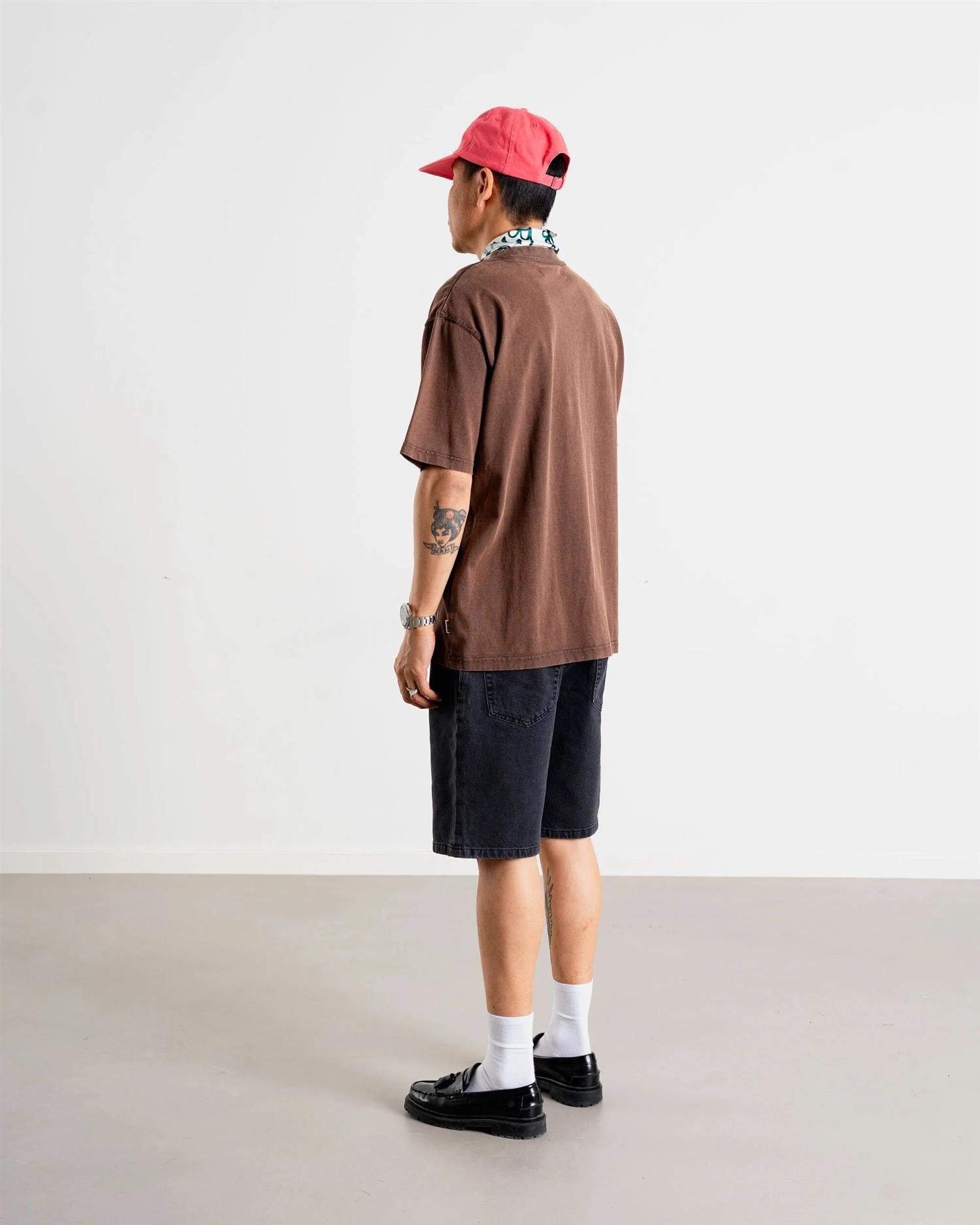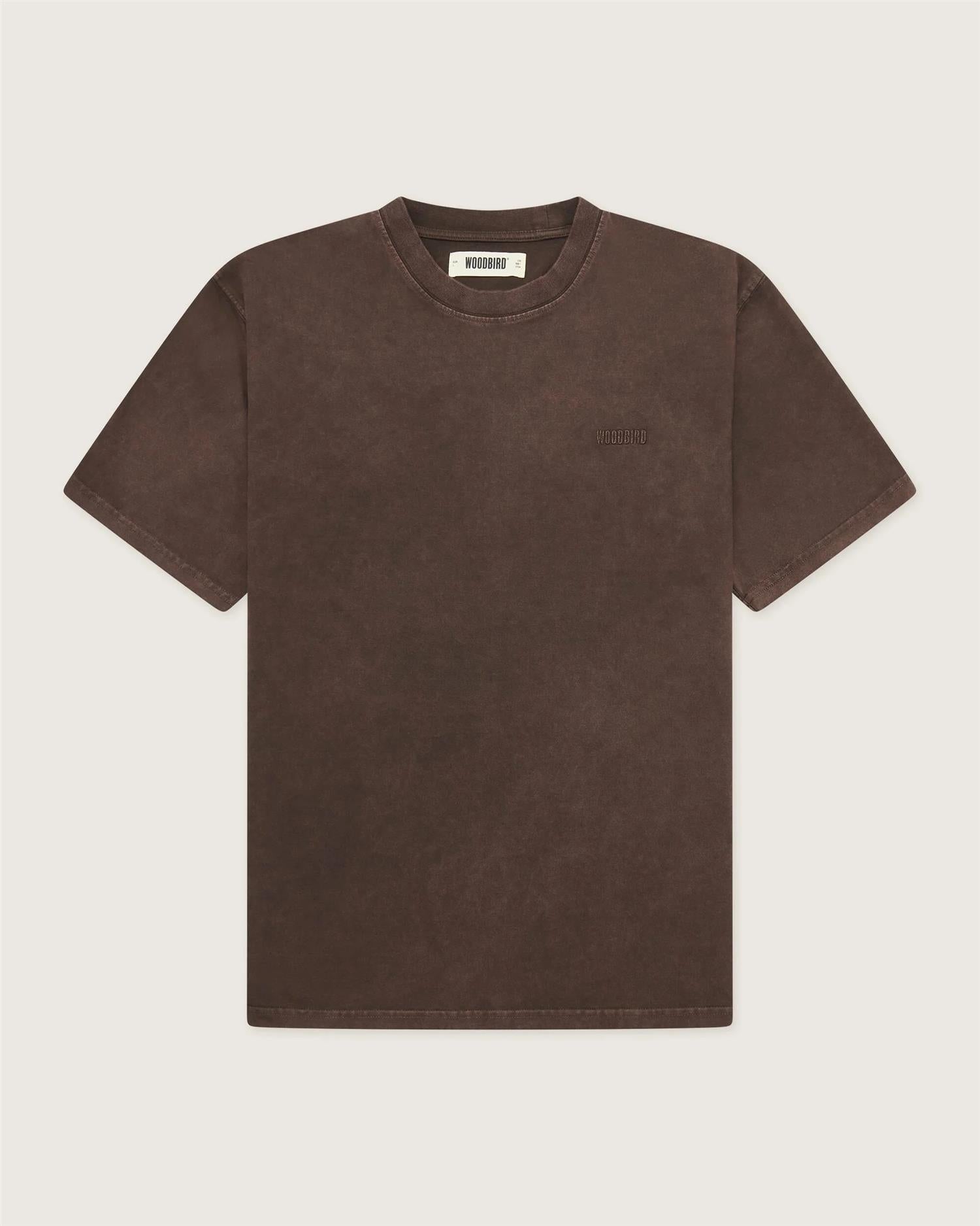 Baine Washed Tee fra Woodbird. Baine Washed Tee er en avslappet t-skjorte med loose fit passform. Den har kort erm, rund hals og et subtilt brodert logo på brystet. Den vasket teksten og falmede effekten gir t-skjorten et avslappet, «levd-in» uttrykk – et klassisk hverdagsplagg du vil elske. Normal i størrelsen.