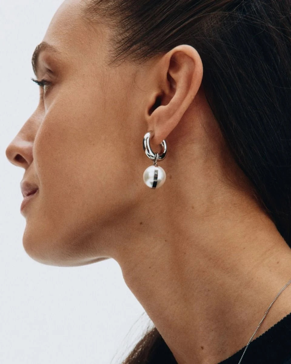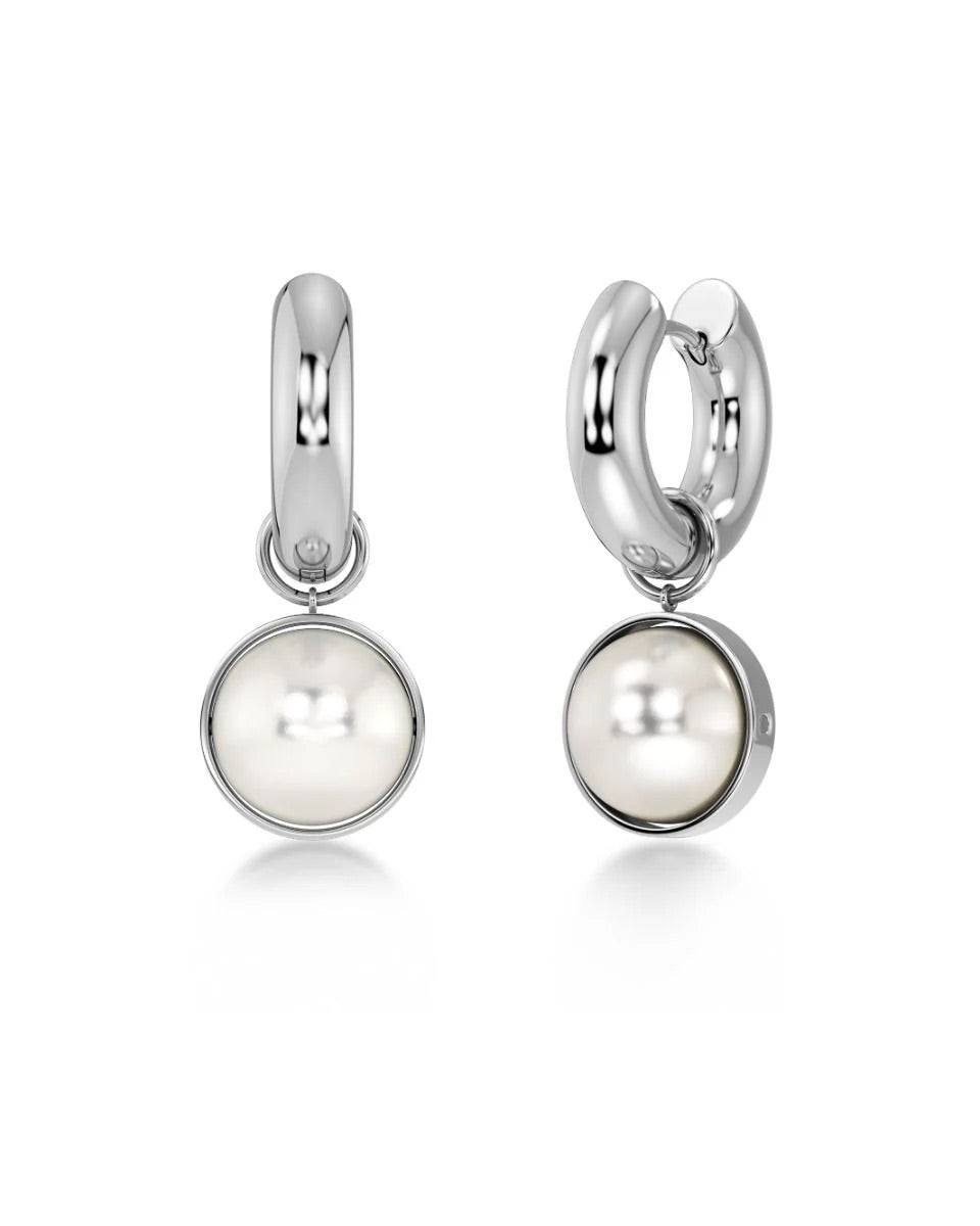 Gabrielle Hoops L Steel fra Edblad. Gabrielle Hoops L er et par elegante øredobber med en avtakbar perlemorsperle som henger fra en stram, moderne skinne. Designet kombinerer klassiske elementer med et moderne uttrykk og kan bæres både med og uten anheng – to smykker i ett.