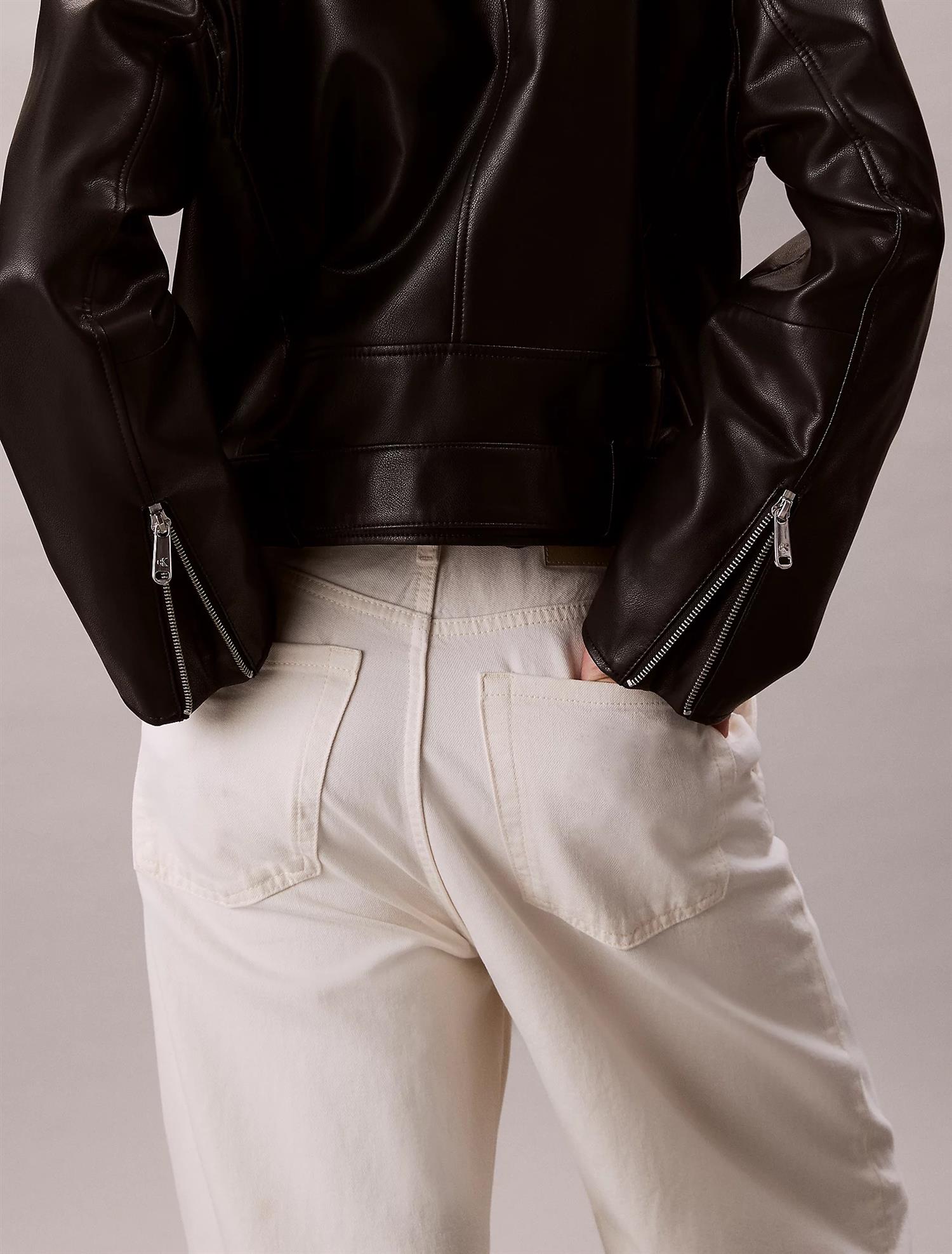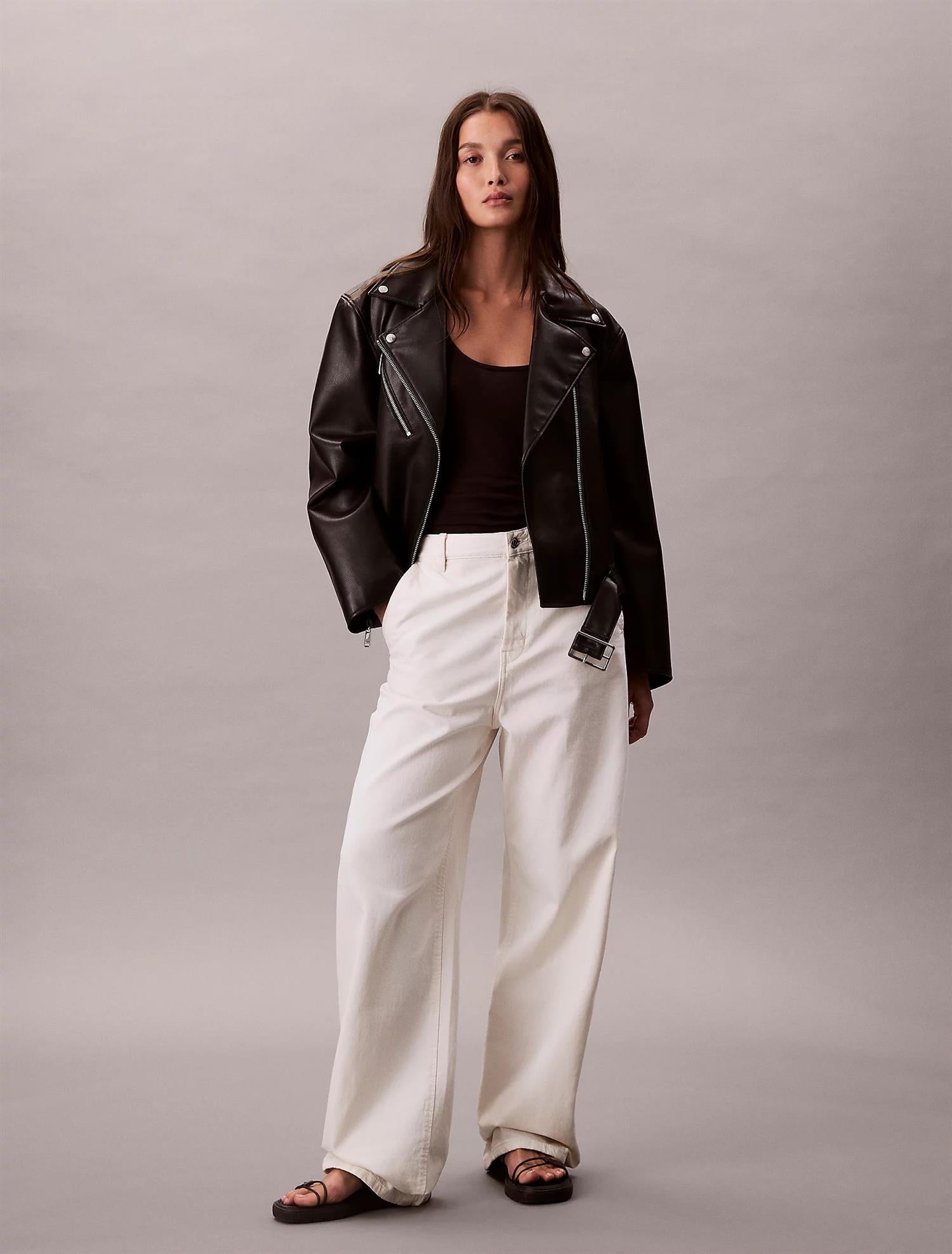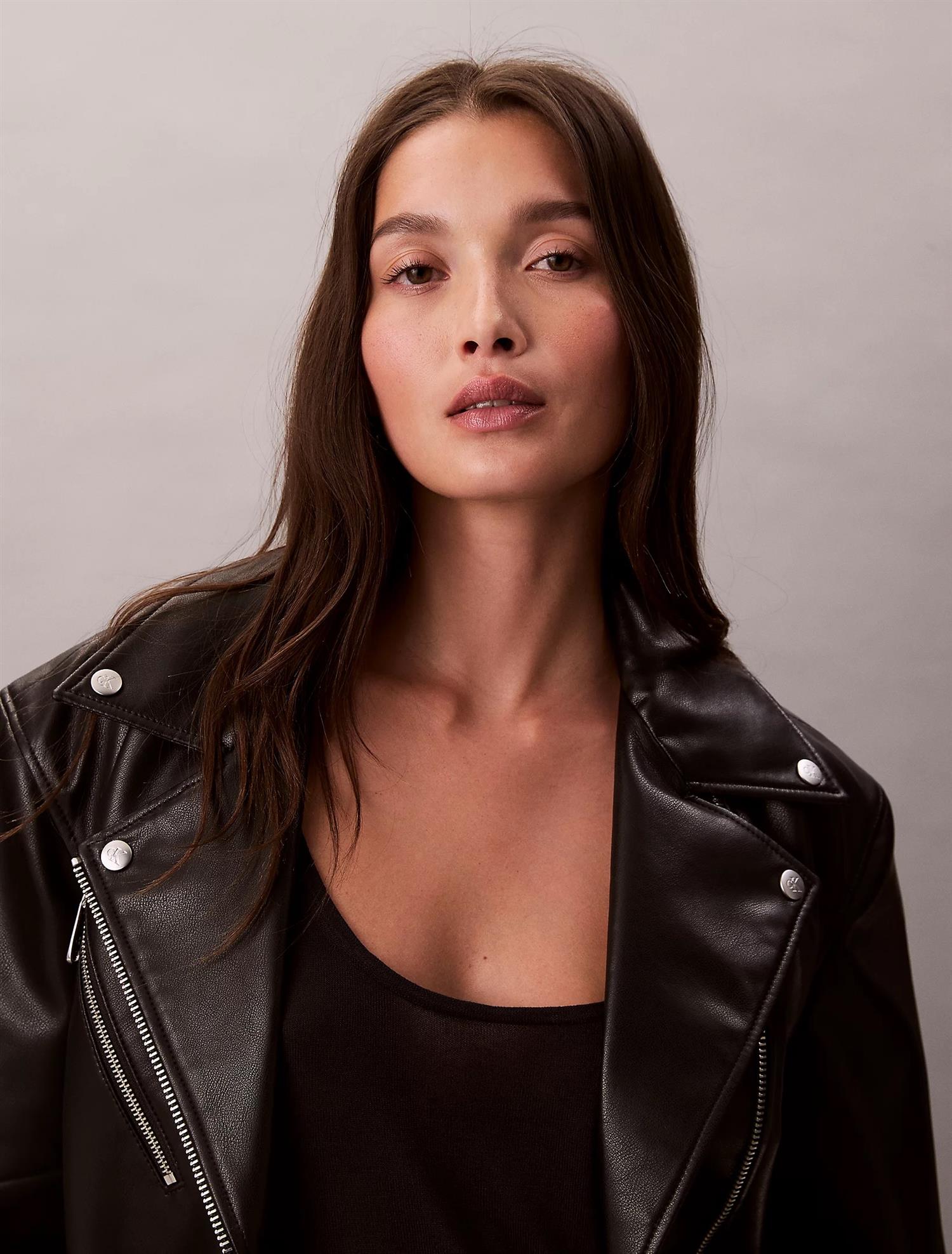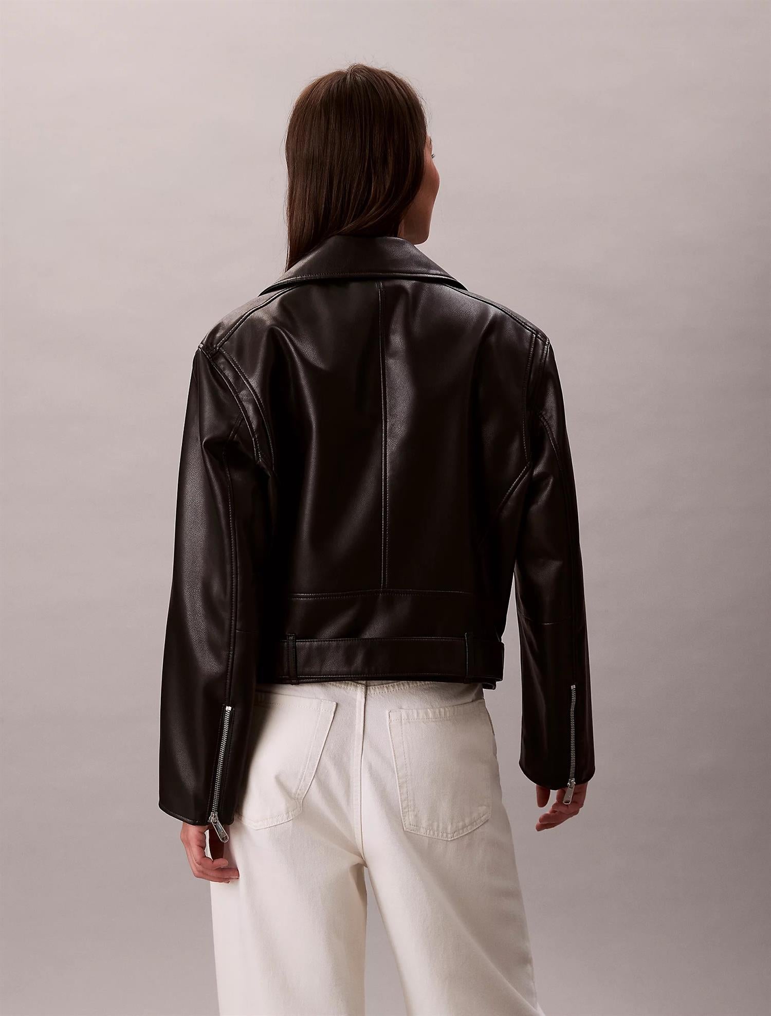 Faux Leather Moto Jacket W/Belt fra Calvin Klein. En ikonisk bikerjakke i ny, moderne versjon. Laget i glatt imitert skinn med en avslappet passform og justerbart belte i livet for perfekt tilpasning. Designet har klassiske detaljer som slag med trykknapper, asymmetrisk glidelåslukking, glidelåslommer på bryst og i livet, samt glidelås nederst på ermene. Fullt satengfôr og sølvfarget hardware med Calvin Klein-logo. Normal i størrelsen.
