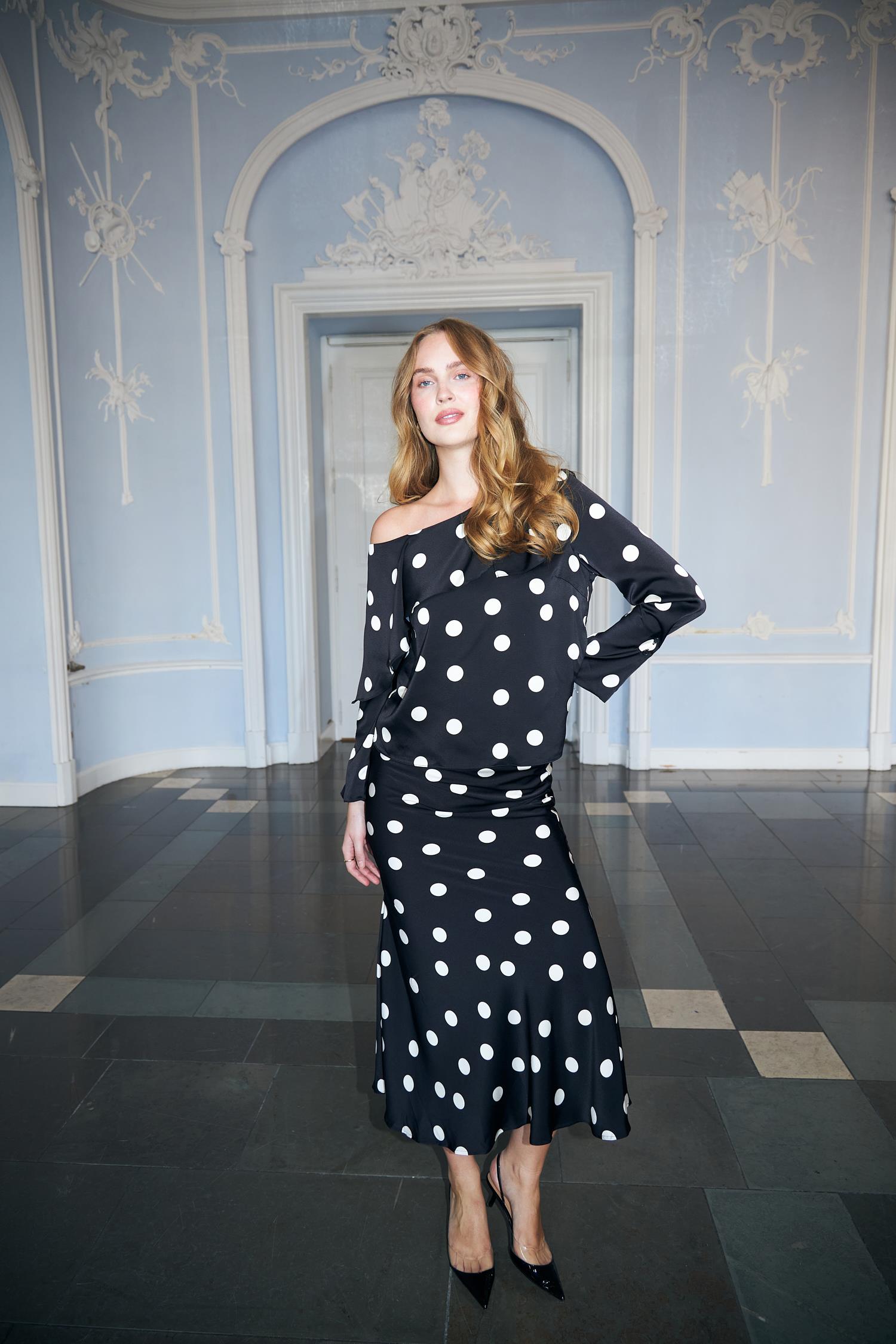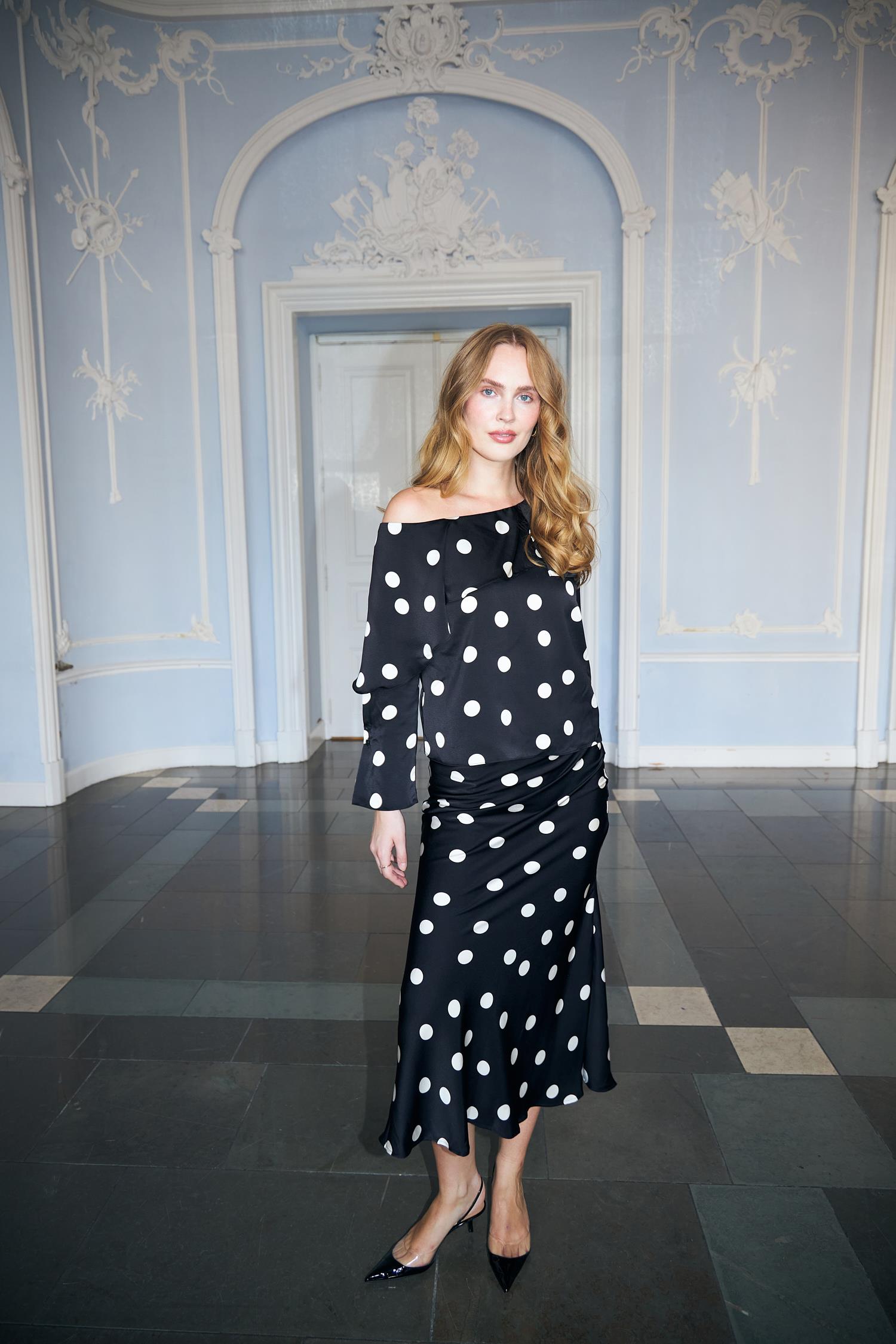 Maiden Skirt fra Cras. Maiden Skirt er et klassisk polkadott-skjørt med et moderne preg. Det har midi-lengde, høyt liv og smal passform. Skjørtet er kuttet på skrå for en flatterende silhuett med naturlig fall, og det tidløse sort/hvite mønsteret gjør det enkelt å style – perfekt med sneakers til hverdags eller hæler til kvelden. Normal i størrelsen.