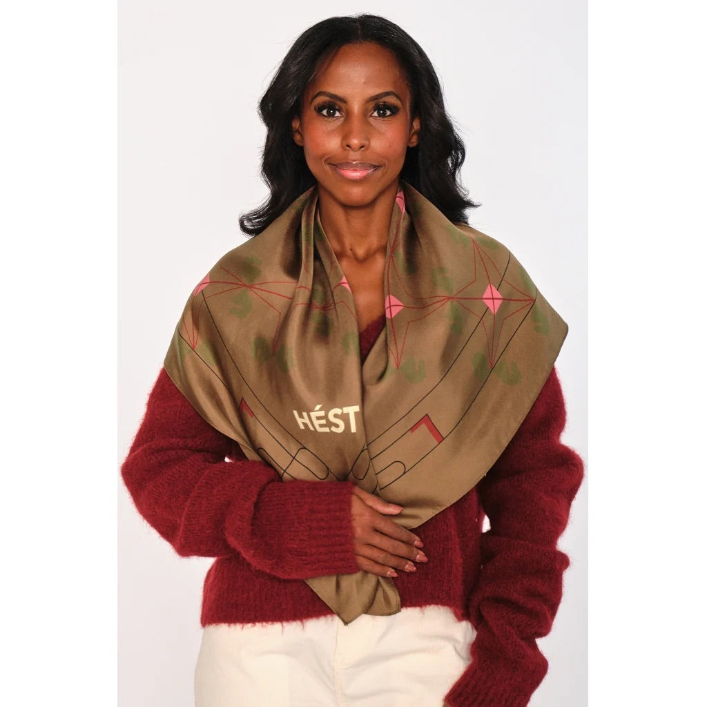 Eliza Silk Scarf Lagre fra Hést. Eliza Silk Scarf Large er et luksuriøst skjerf i 100% silke med et helprint av abstrakte mønstre. Med målene 90×90 cm kan det draperes, knytes eller styles på flere måter. Et elegant statement-plagg som løfter enhver look.