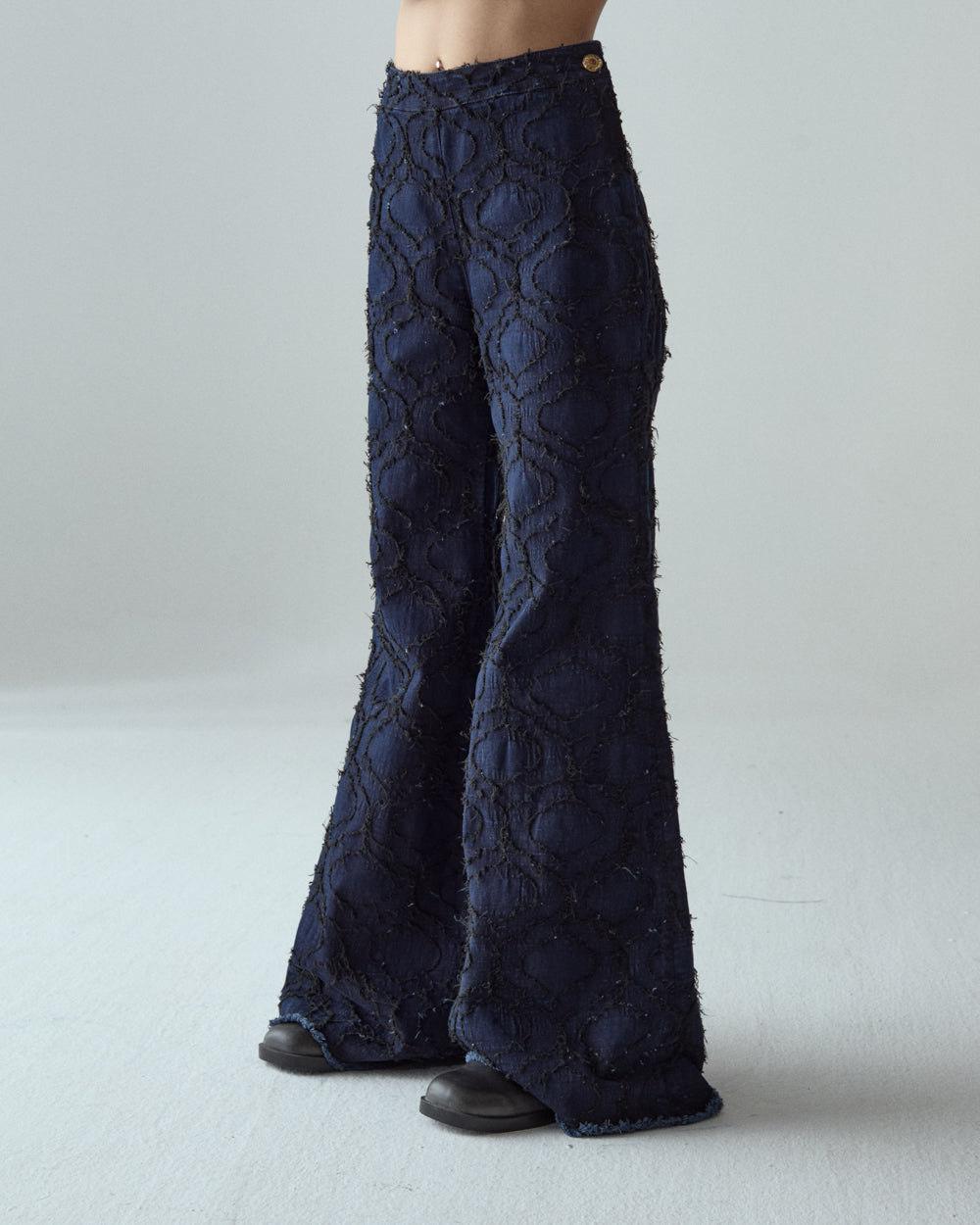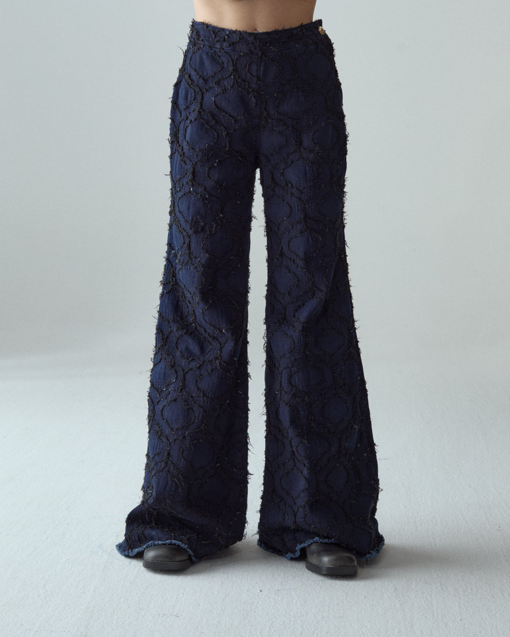 Milly Over Blu Malfile Onion Jeans fra Shaft Jeans. En jeans med høyt liv og ekstra vide ben. Modellen har et unikt teksturert mønster i stoffet som gir et moderne og iøynefallende uttrykk. Råkant nederst fullfører looken.