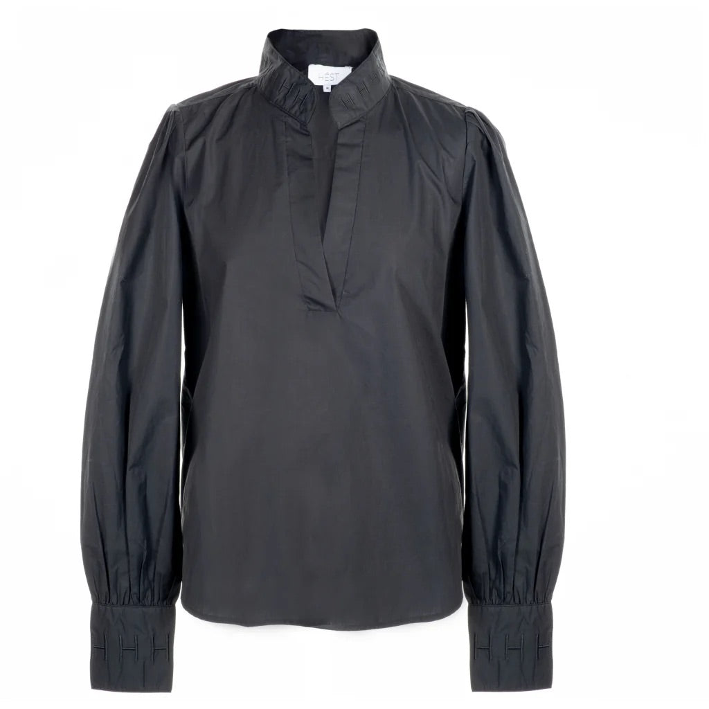 Mie Blouse fra Hést. Mie Blouse er laget i 100% bomullspoplin som føles både myk og behagelig. Blusen har en klassisk passform som passer like godt til hverdags med jeans som til jobb og fest med dressbukser. En tidløs favoritt du kan bruke igjen og igjen. Normal i størrelsen.