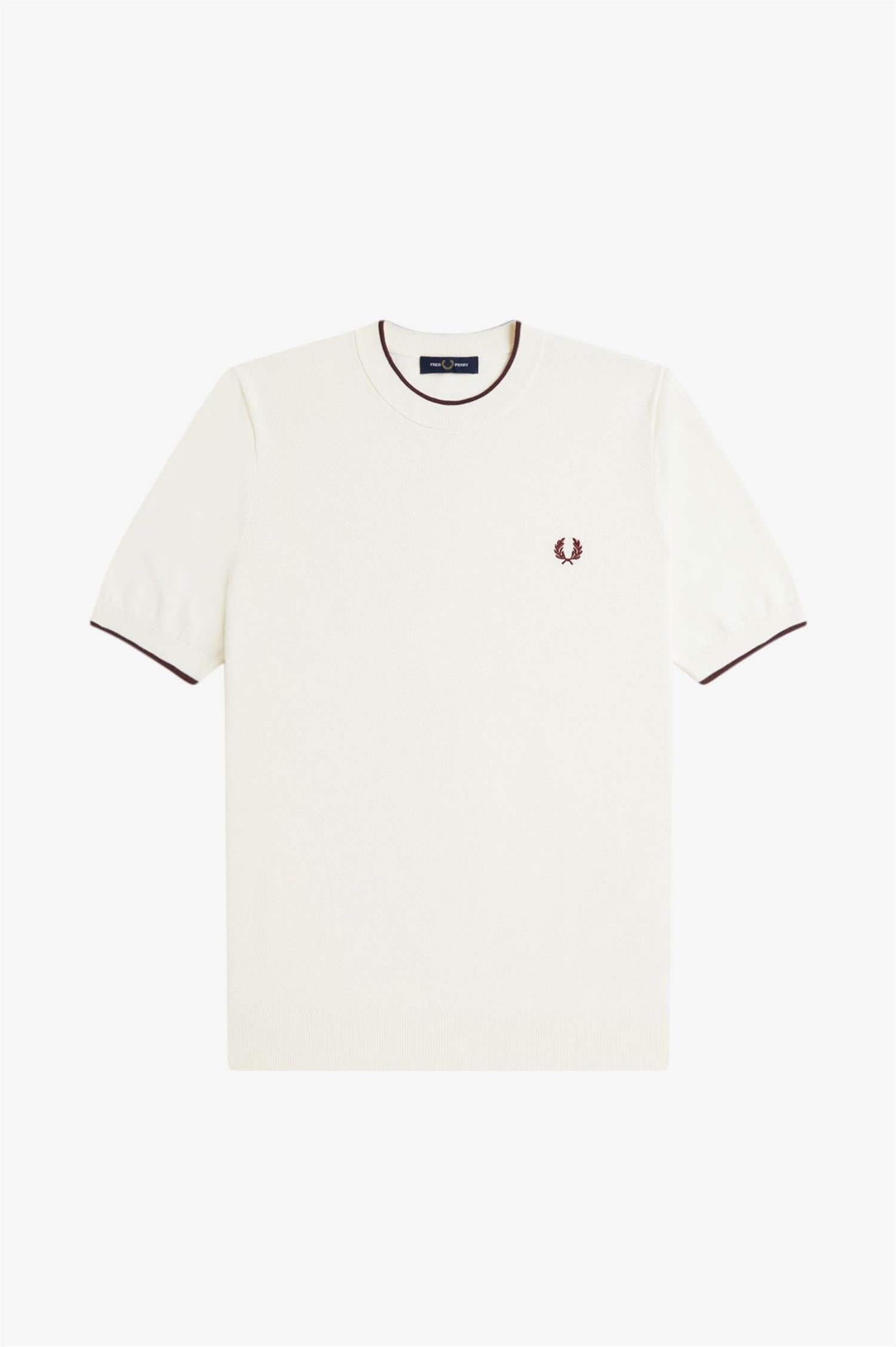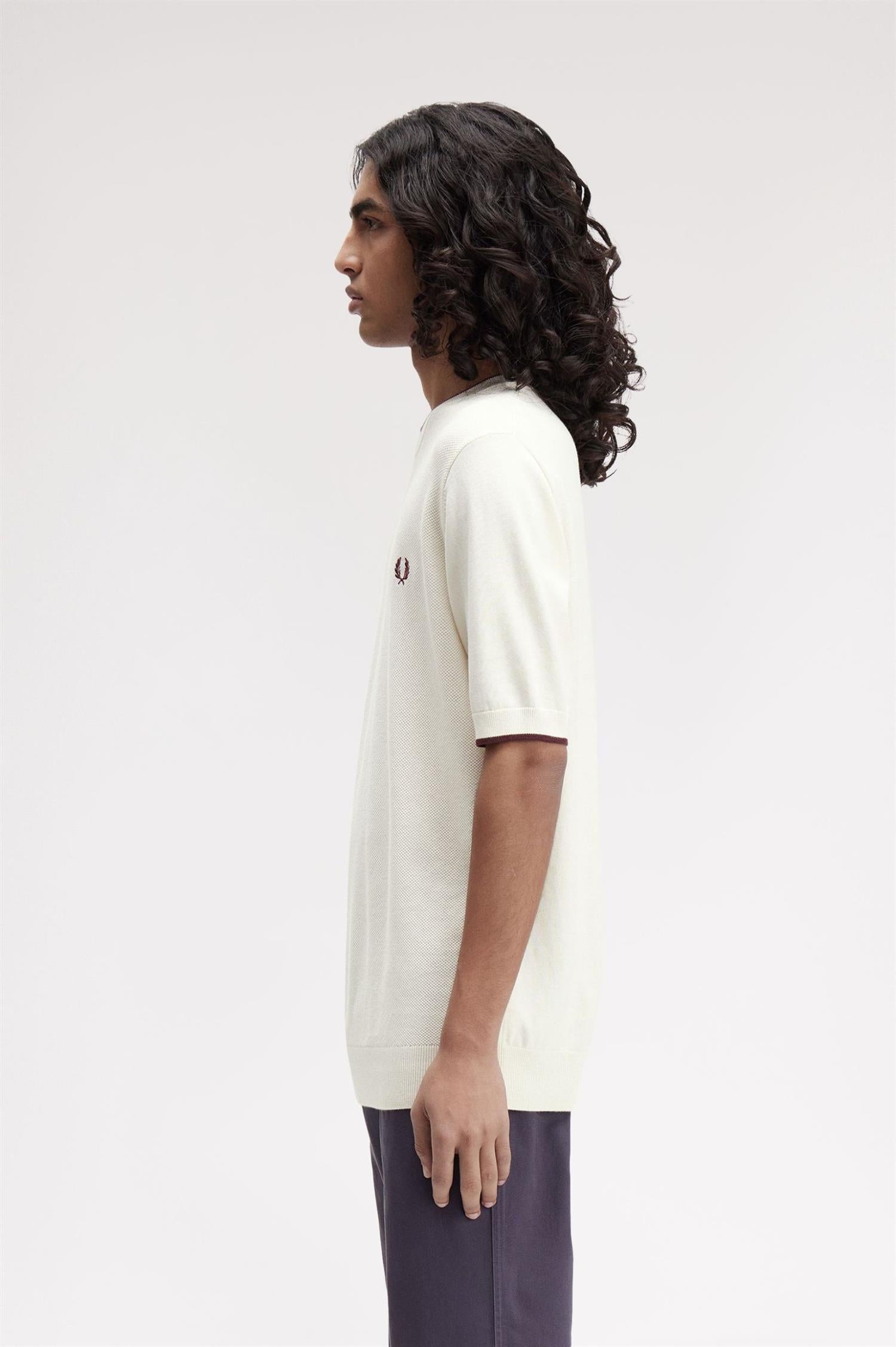 Pique Stitch Knitted T-Shirt fra Fred Perry. Pique Stitch Knitted T-Shirt er en avslappet, moderne polo i myk kammet bomull med piqué-strikk på fronten. Den har regular fit, ribbestrikkede kanter og Laurel Wreath-logoen – et komfortabelt og stilsikkert plagg til hverdags. Normal i størrelsen.