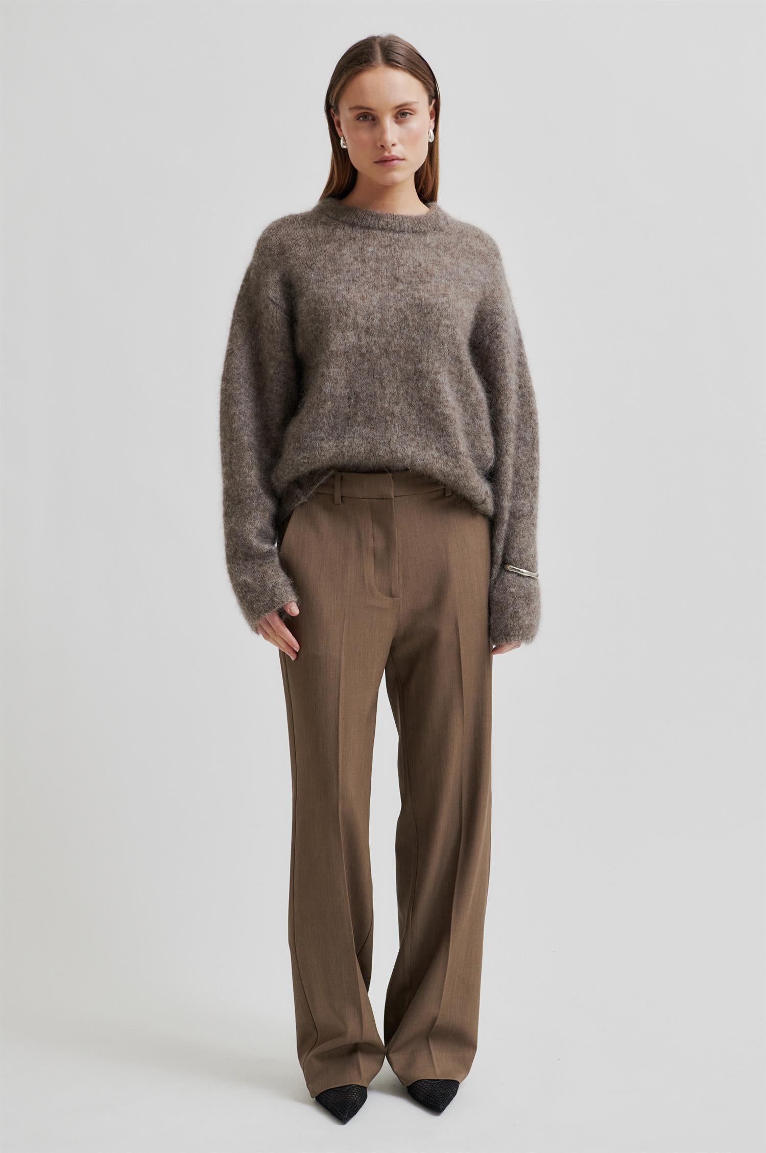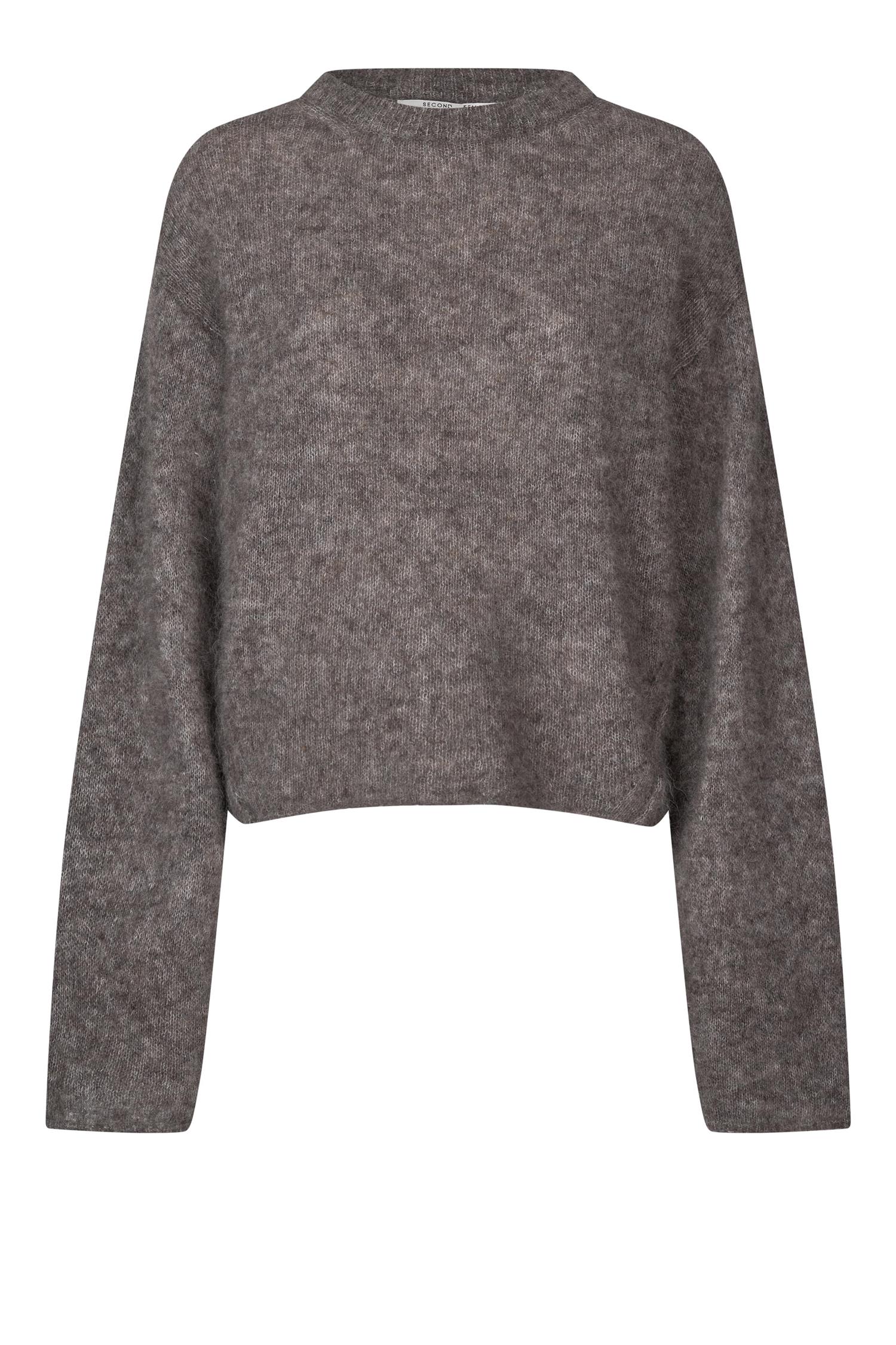 Emmalou Knit O-Neck fra Second Female. En langermet strikkegenser i supermyk og stretchy mohairblanding med fluffy tekstur. Modellen har ribbestrikket rund hals, droppede skuldre og lange ermer. Diagonale omvendte sømmer i sidene gir en moderne detalj. Avslappet passform. Normal i størrelsen.