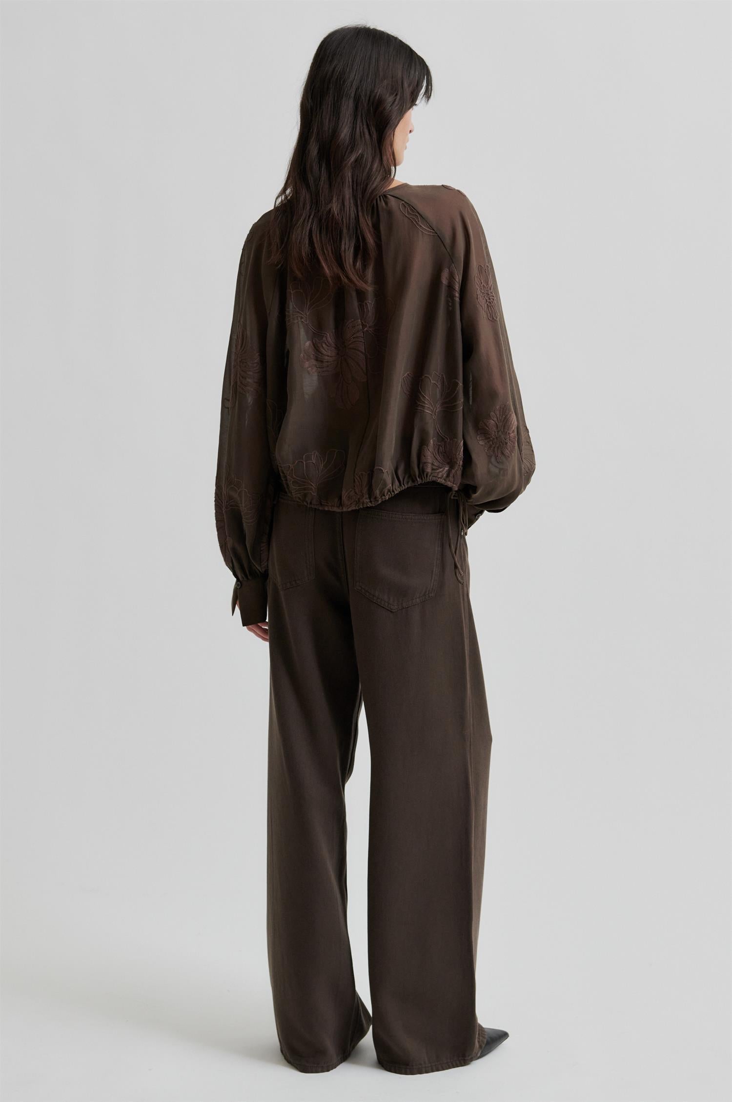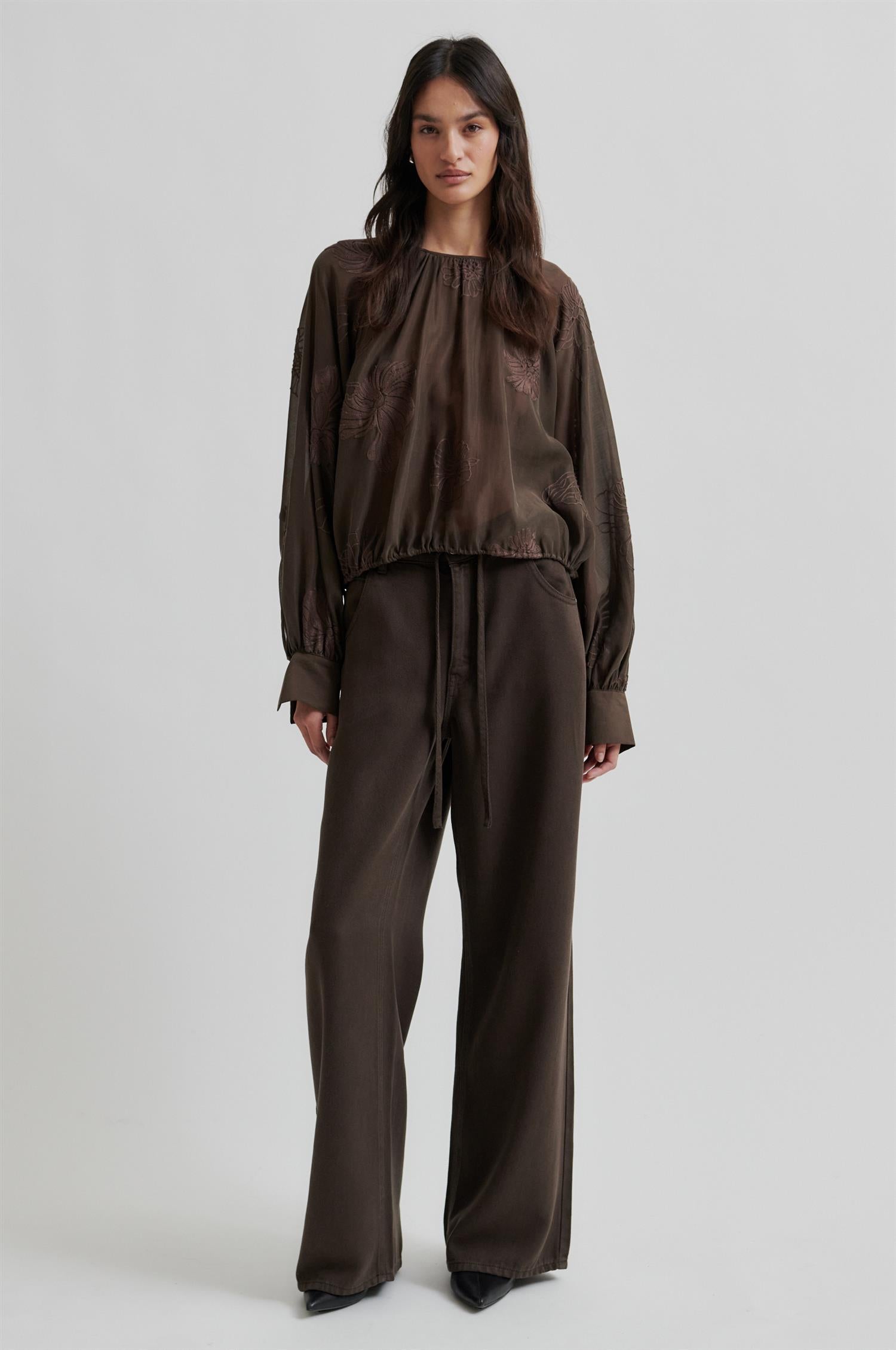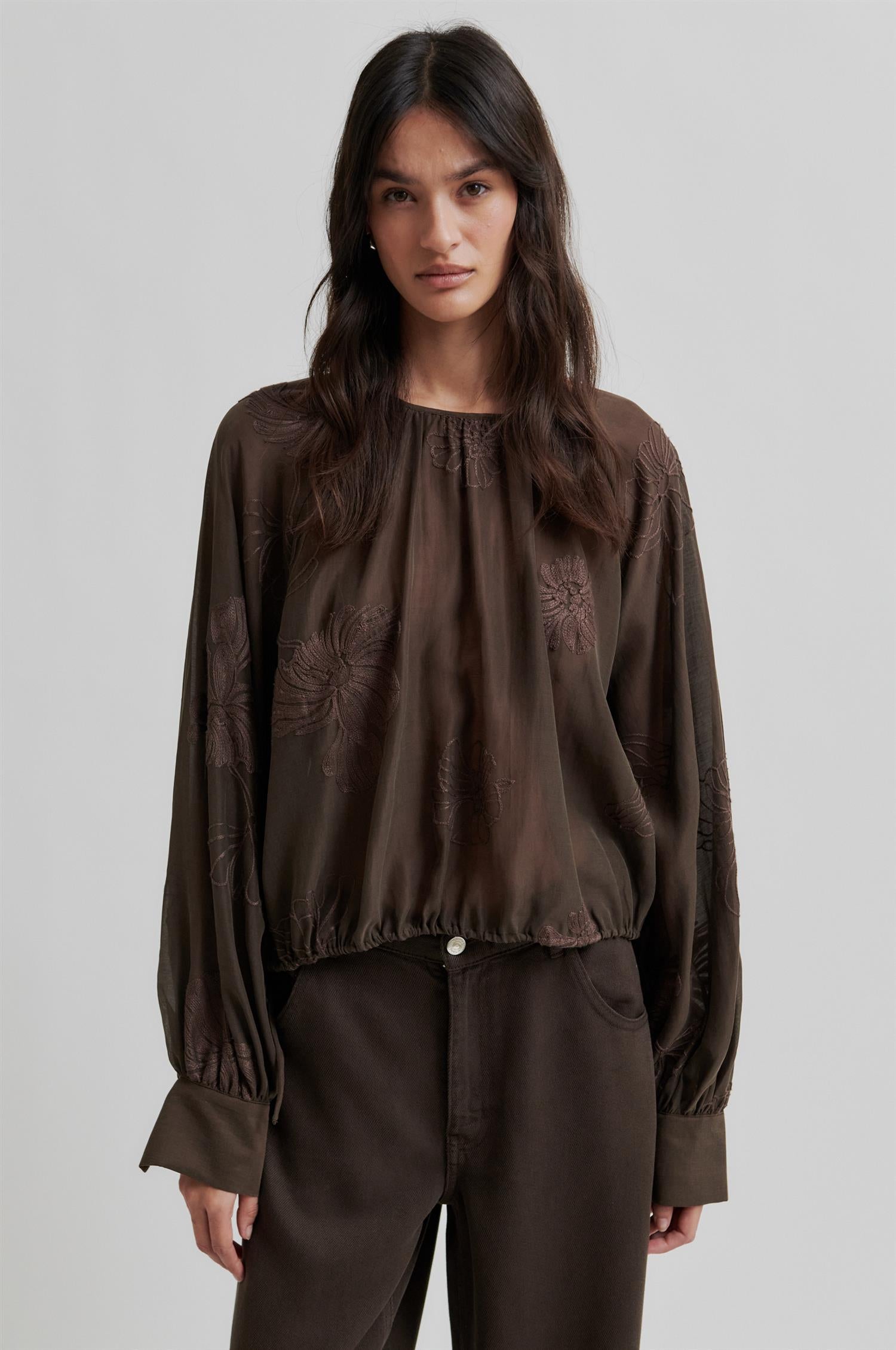 Veria Blouse fra Second Female. En bluse i mykt, semitransparent materiale med broderte detaljer. Modellen har rund hals med nøkkelhullsåpning og knappelukking bak, raglanermer med rynkede mansjetter og knappelukking. Snøring i nederkant med knytelukking i sidene. Løs passform som kan justeres. Normal i størrelsen.