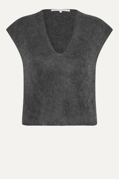 Camryn Knit Vest fra Second Female. En ermeløs strikket vest med dyp V-utringning og avslappet passform. Designet i en myk og stretchy mohair- og ullblanding med fluffy tekstur. Modellen har ribbestrikket kant nederst, små splitter i sidene og dype ermehull som gir et moderne uttrykk. Normal i størrelsen.