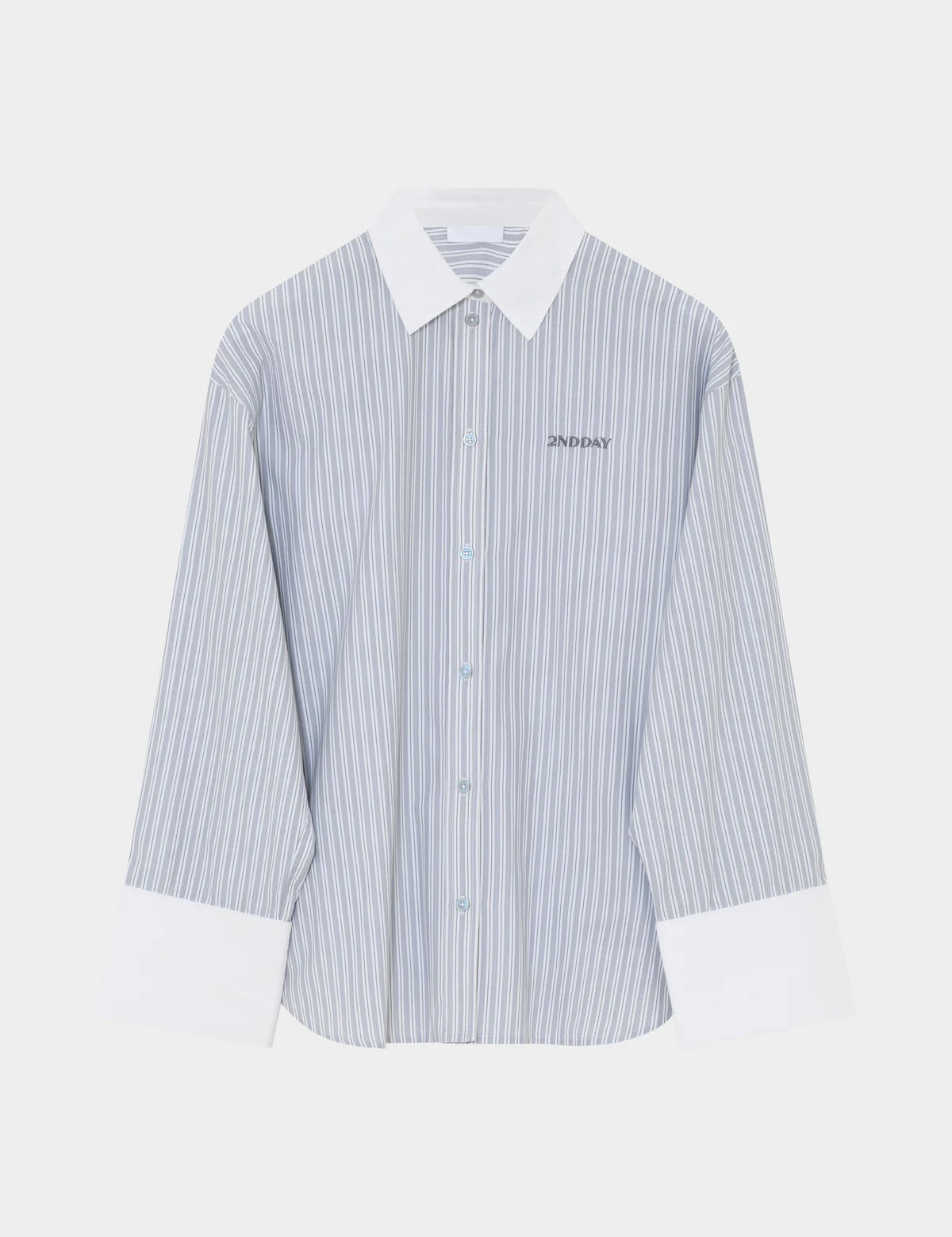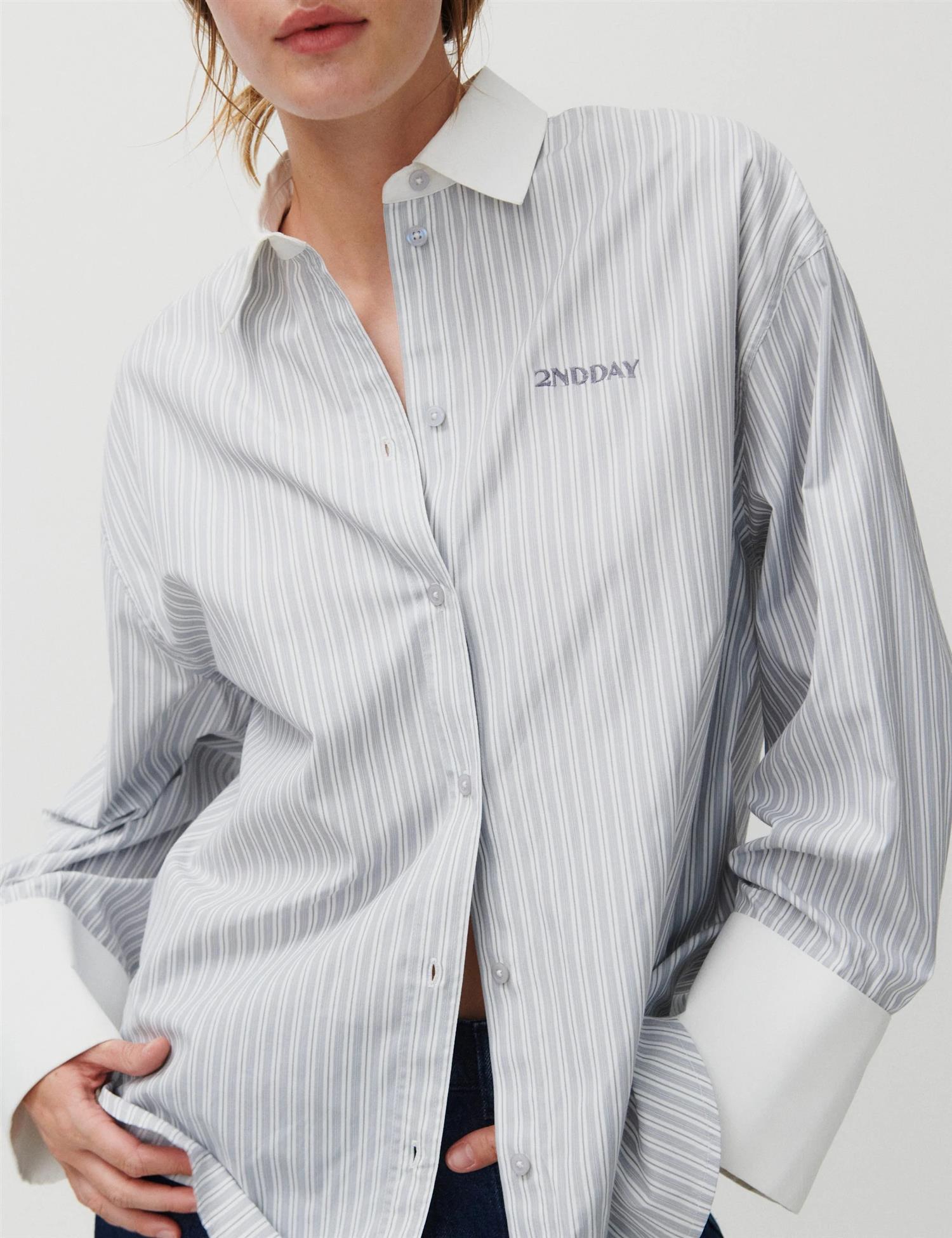 2ND Claren i hvit fra 2NDDAY. En klassisk skjorte med moderne oversized passform og brede ermer. Skjorten har store mansjetter, knappelukking og et subtilt logodetalj på brystet. Den avrundede, lett buede nederkanten gir et tidløst uttrykk som gjør skjorten enkel å style både til hverdags og mer formelle anledninger. Normal i størrelsen.