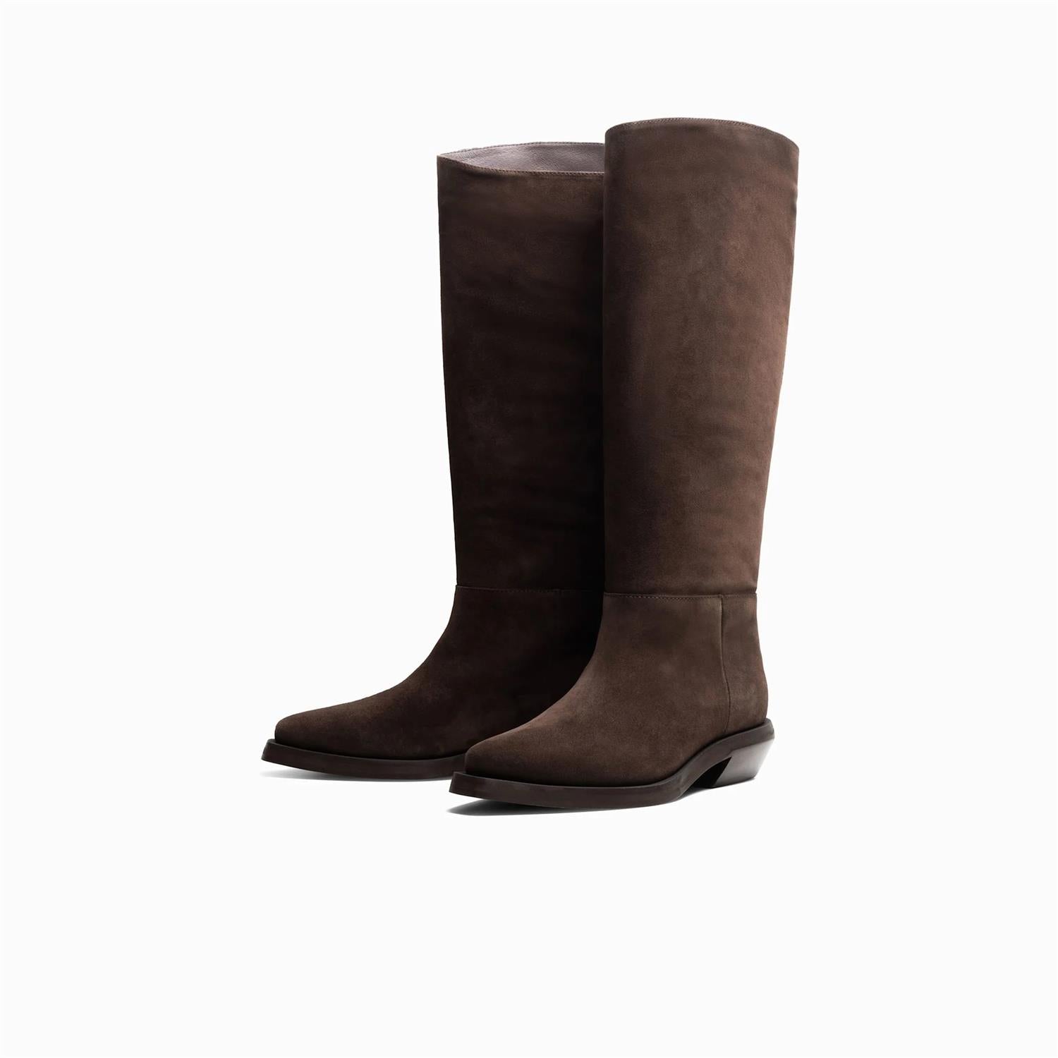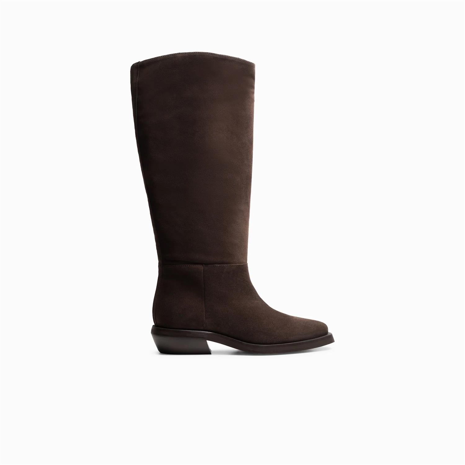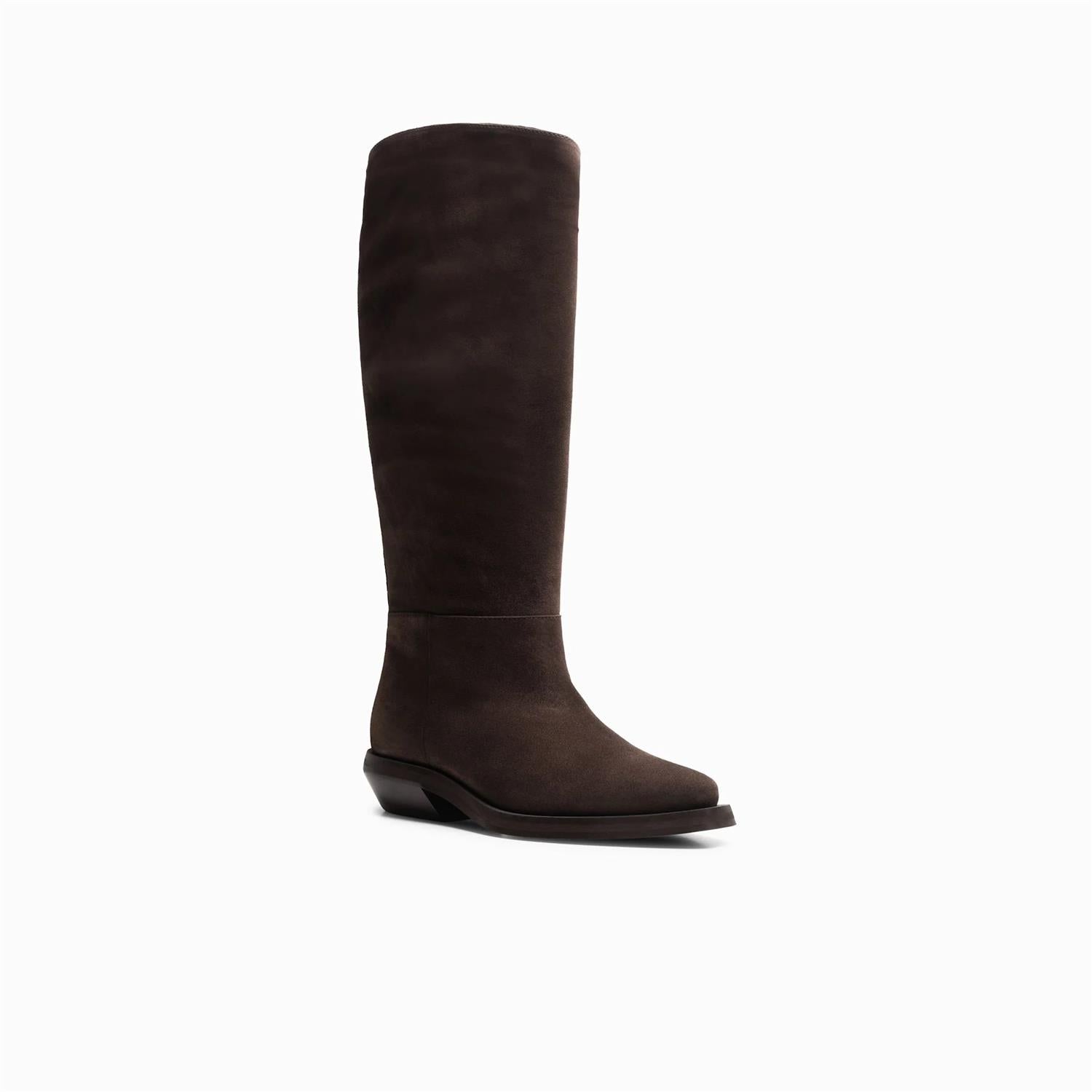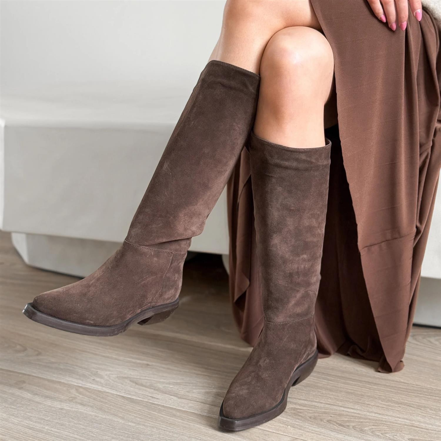 Julia fra Jim Rickey. Støvlett i semsket italiensk skinn med spiss tå og høyde rett under kneet. Designet med en western-inspirert hæl og et minimalistisk uttrykk som gir et tidløst og sofistikert preg. Normal i størrelsen.