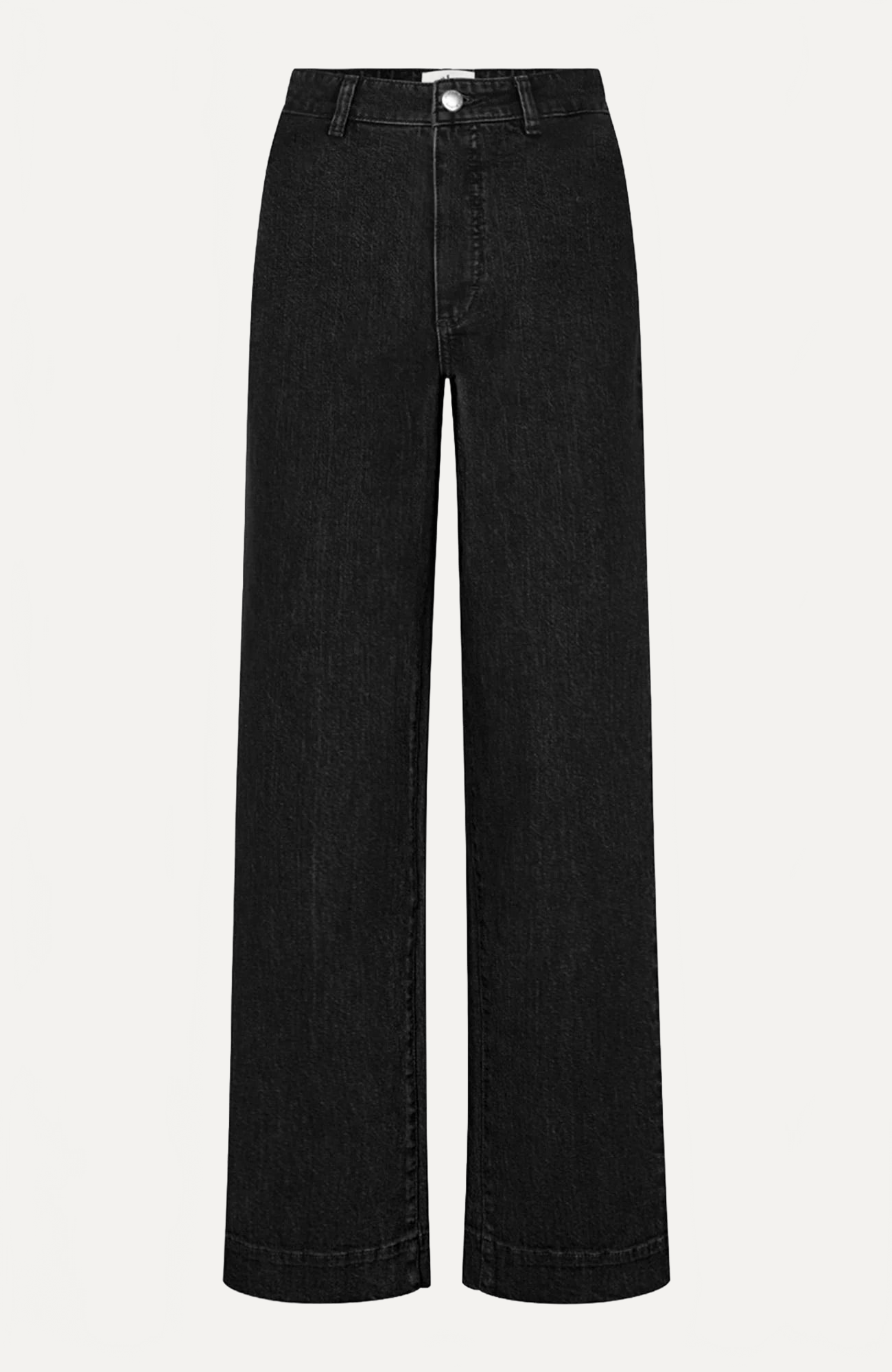 Erica Regular 520 Black Rinse fra Five Units. Erica Regular 520 Black Rinse er klassiske jeans med et avslappet og stilrent uttrykk. Jeansen har en oppbygd linning, beltestropper og glidelås med knappelukking. Jeansen har rette vide ben og subtile detaljer som syninger og påsydde baklommer. Normal i størrelsen.