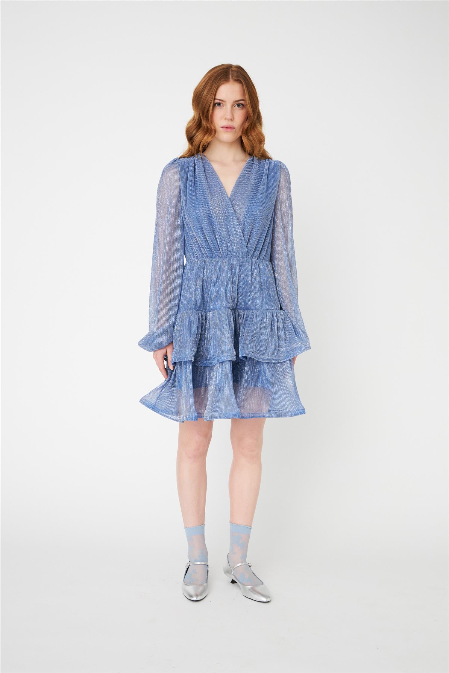 Angela Dress fra Cras. Angela Dress er en nydelig kjole laget i glitrende plisséstoff som fanger lyset og gir en glamorøs look. Voluminøse volanger og myke lag skaper et lekent og feminint uttrykk, mens de lange, lett transparente ermene tilfører eleganse. Kjolen har et avtakbart belte i livet som gir mulighet til å tilpasse passformen og style den etter ønske. Perfekt til fest, middag eller en kveld ute. Normal i størrelsen.