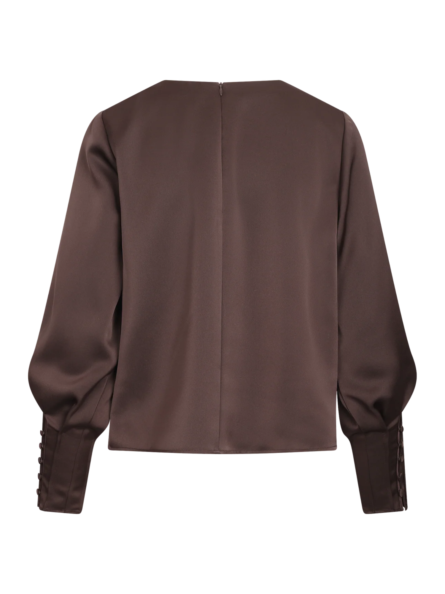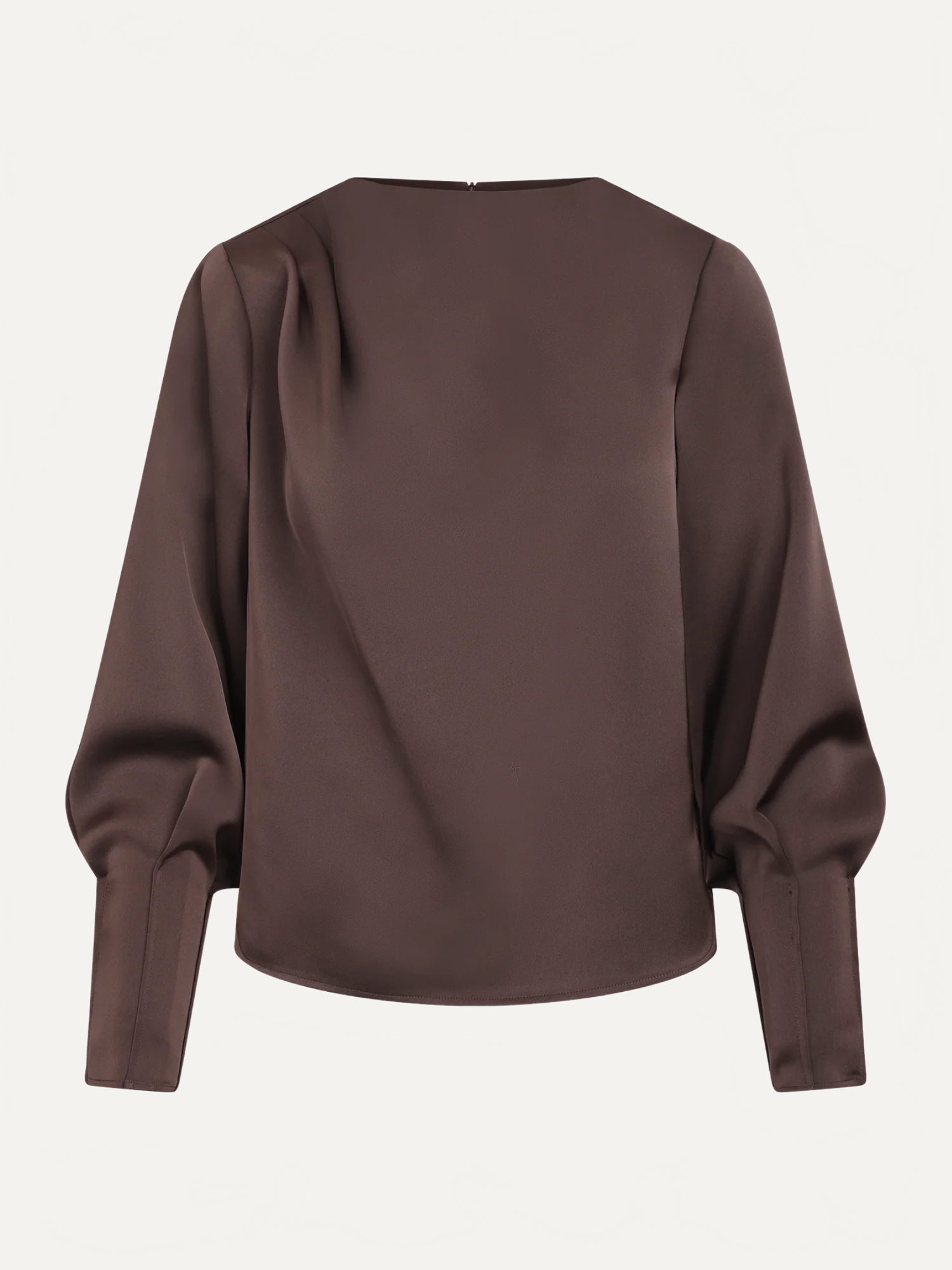 Kirstine Blouse fra Urban Pioneers. Kirstine Blouse er en elegant satengbluse med en delikat drapering på den ene skulderen. Brede mansjetter med knapper. Perfekt å style med Gamma Skirt for et komplett og matchende sett. Blusen er normal i størrelsen og passer like fint til hverdag som til fest.