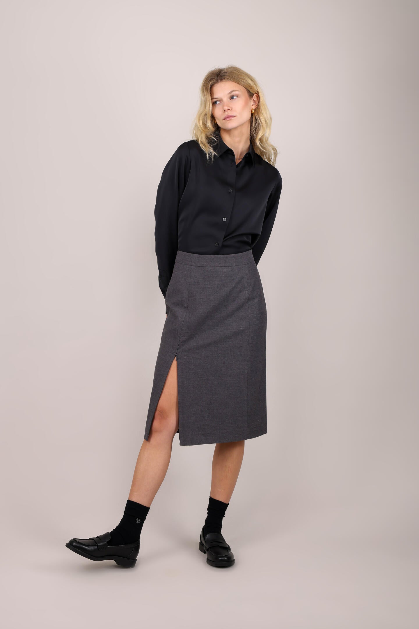 Didi Skirt fra Urban Pioneers. Didi Skirt er et elegant pencil-skjørt med en flatterende silhuett og glidelåslukking på siden. Laget i mykt flanellstoff, og består av en blanding av ull, rayon, polyester og elastan som gir både komfort og bevegelighet. Et tidløst plagg for enhver garderobe. Normal i størrelsen.