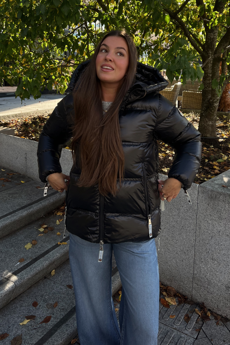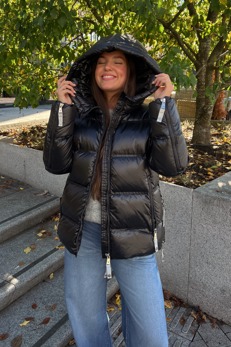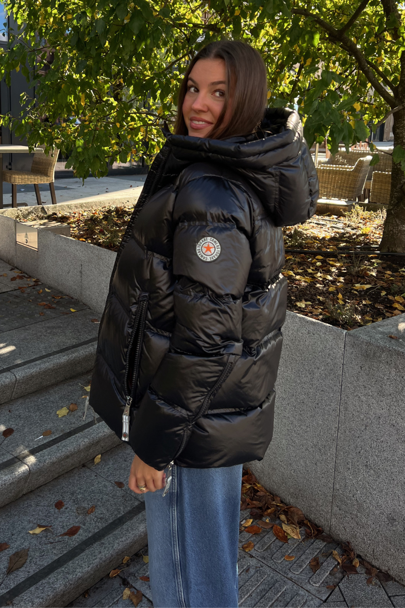 C.A.Y.AErika Black fra CAYA. Erika er en bestselger fra det norske merke C.A.Y.A. Den har en rett og flatterende passform, og solide glidelåser i sidene som gjør det enkelt å justere vidden nederst. Myk fleece i lommene for ekstra komfort og praktiske skulderstropper på innsiden lar deg bære jakken som en sekk når du blir for varm. Refleksdetaljer, hette og glidelåslommer gjør den både allsidig og brukervennlig. En lett, men varm dunjakke som passer like godt i byen som på fjellet. Normal i størrelsen.