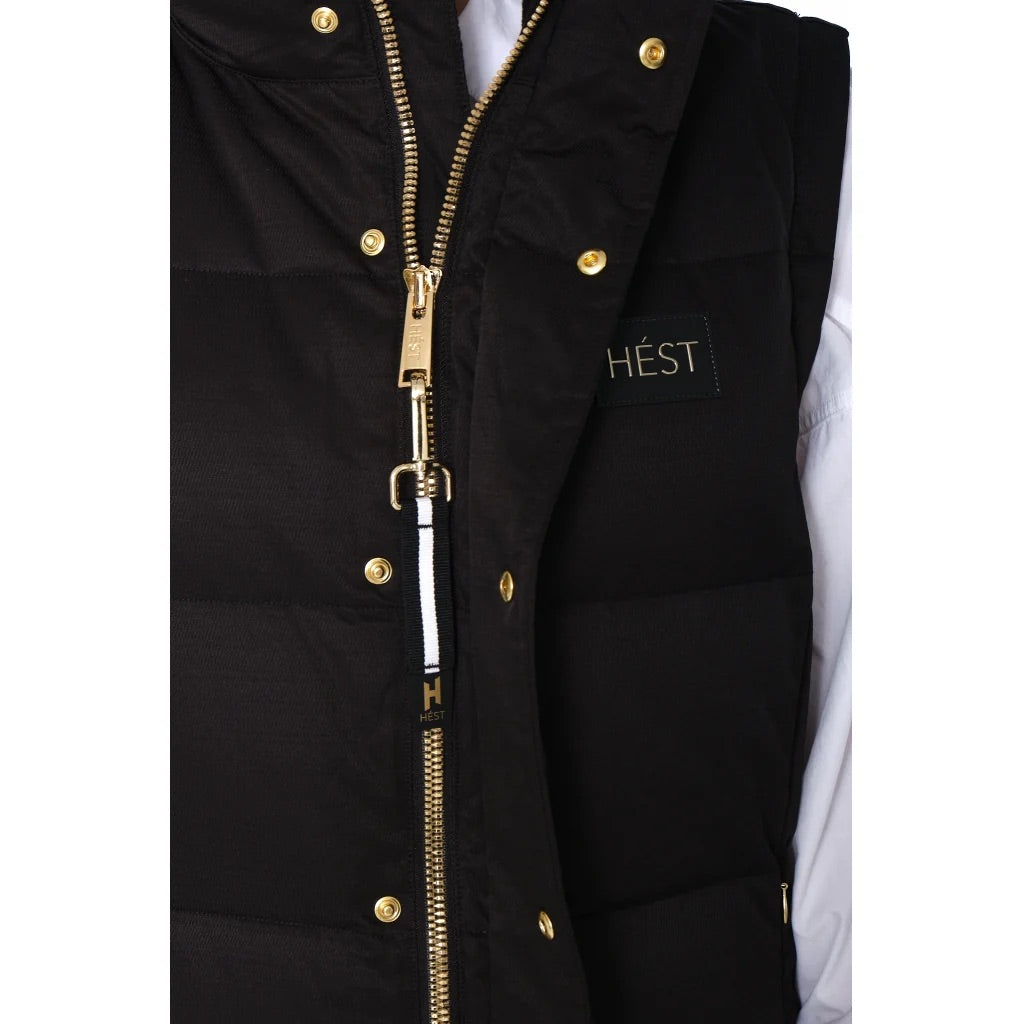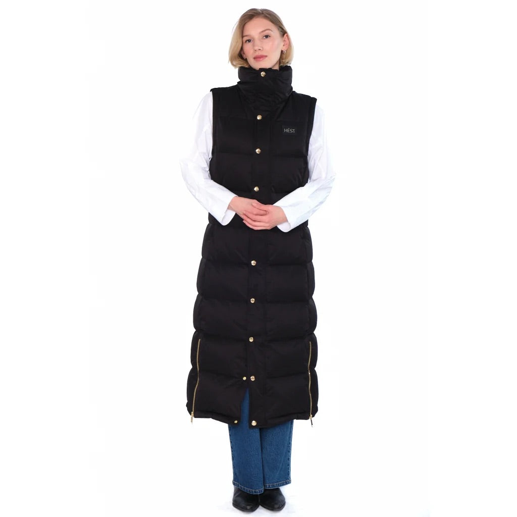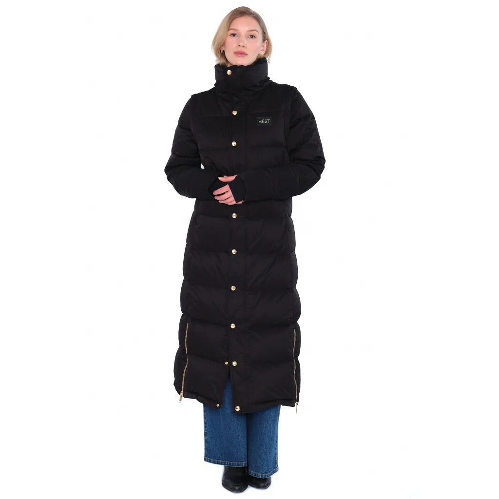 Edda Down Coat fra Hést. Edda Down Coat er en allsidig dunjakke med avtagbare ermer, slik at den enkelt kan gjøres om til en vest. Den lange fasongen kombinerer varme og funksjonalitet, med glidelås i sidene, trykknapper og en fleecefôret krage som gir ekstra komfort. En stilren logodetalj på brystet. Normal i størrelsen.