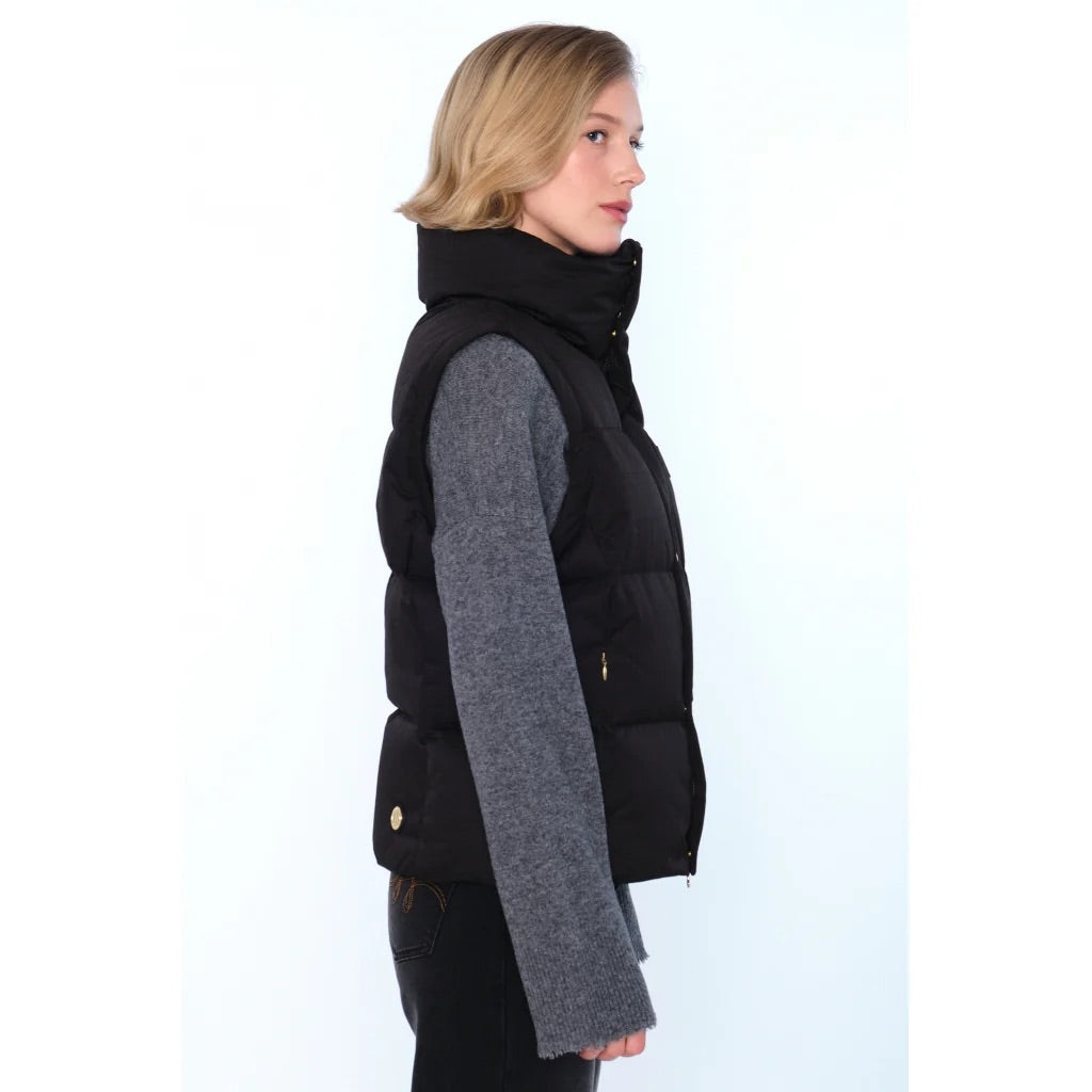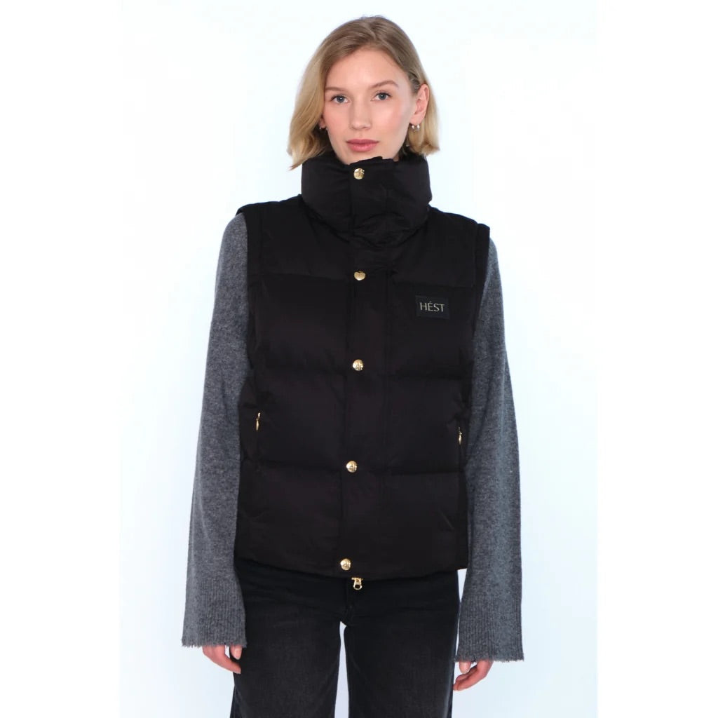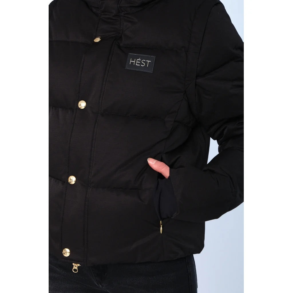 Edda Down Jacket fra Hést. Edda Down Jacket er en kort og allsidig dunjakke med avtagbare ermer, som enkelt gjør den om til en vest. Den har glidelås i front, trykknapper og en fleecefôret krage for ekstra varme, mens logopatchen på brystet gir et moderne og stilrent preg. Normal i størrelsen.