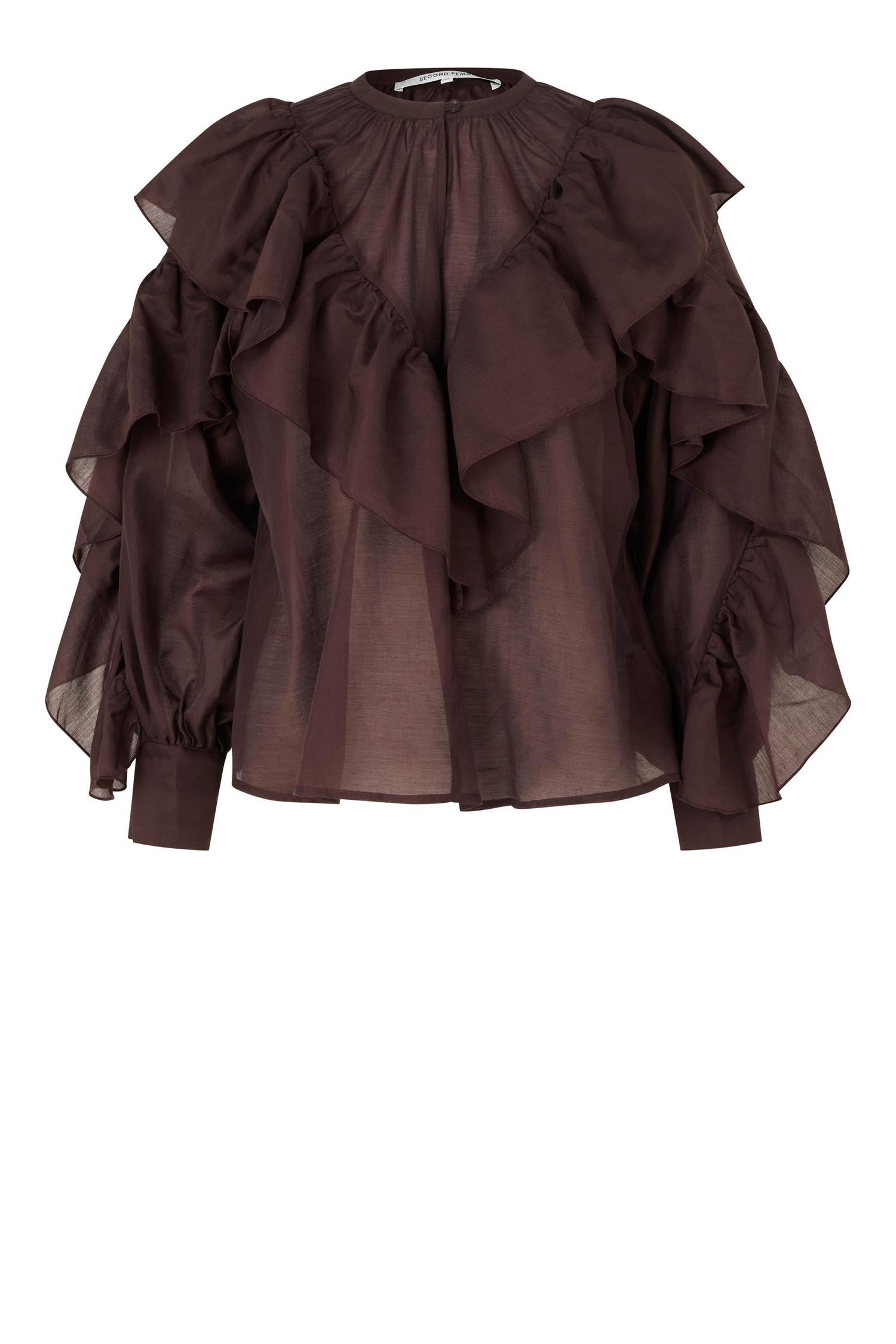Fria Frill Blouse fra Second Female. Fria Frill Blouse er en lett og luftig bluse i semitransparent stoff med feminine volanger foran og på ermene. Den har nøkkelhullsåpning med knapp i halsen, lange ermer med mansjetter og en avslappet passform. Normal i størrelsen.