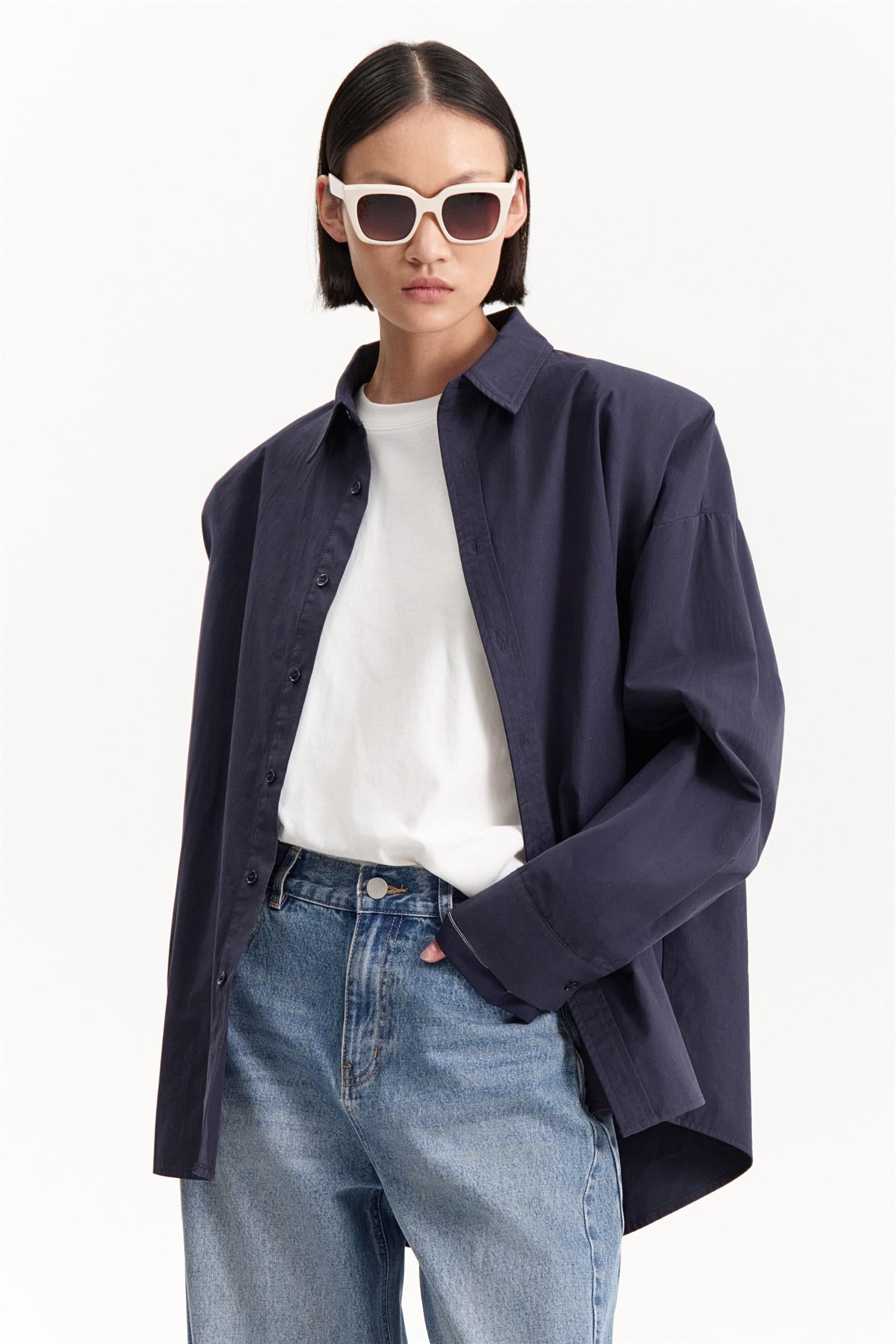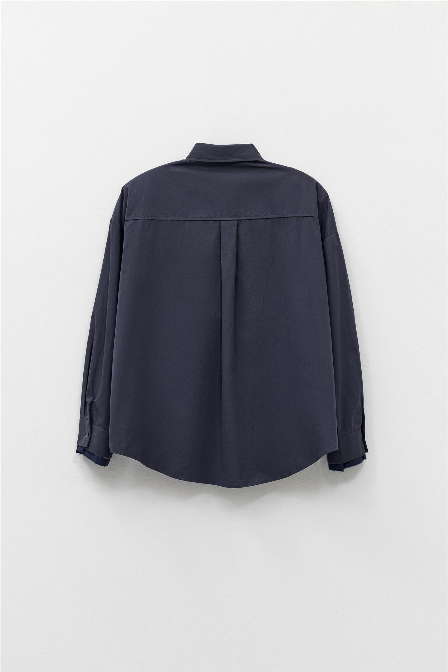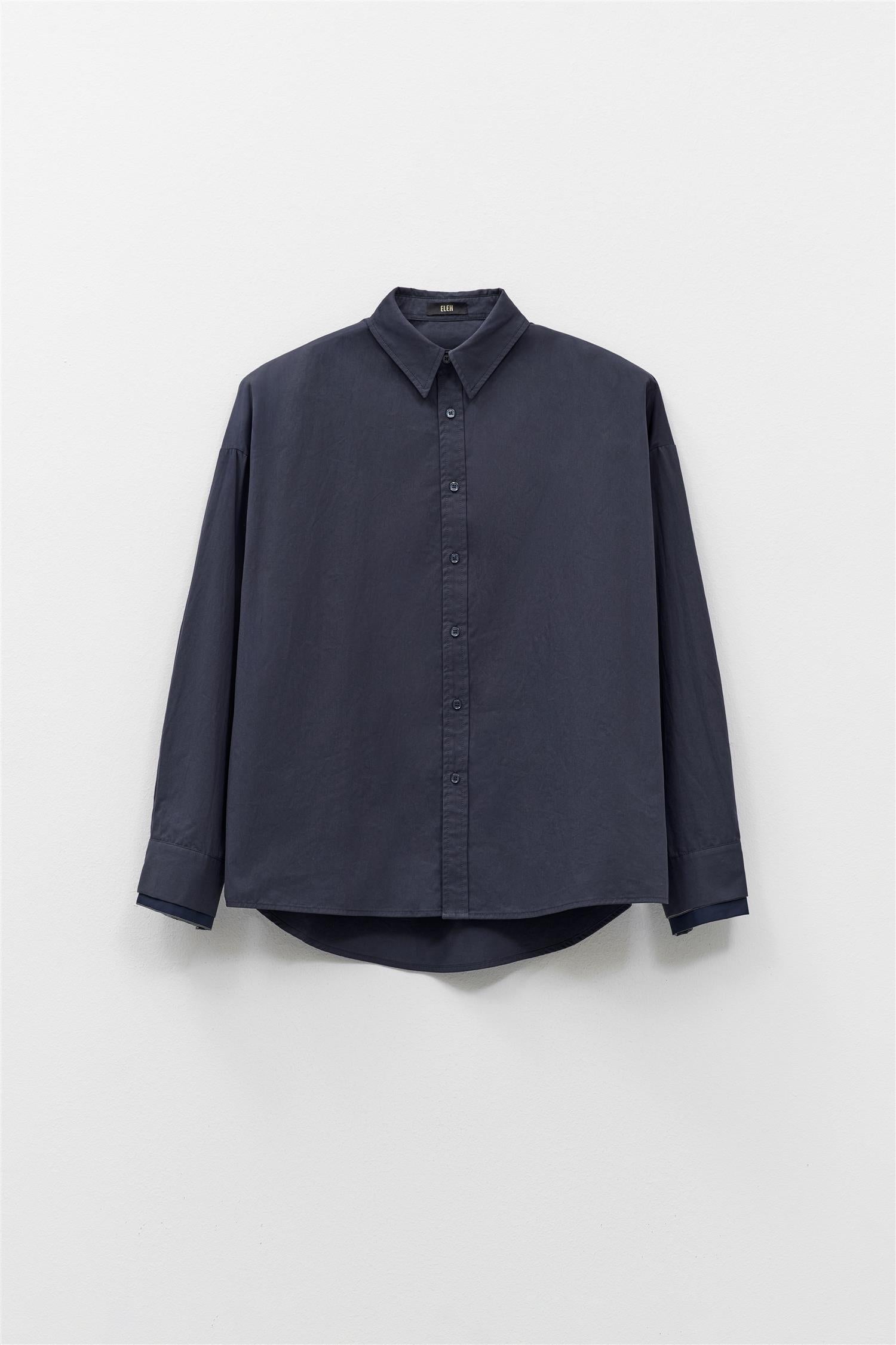 Classic Shirt Blu Notte fra Eleh. Classic Shirt Blu Notte er en oversized skjorte med dobbel ermeløsning og skulderputer som gir et moderne, strukturelt uttrykk. Skjorten har enkel knappelukking og en avslappet passform, som gjør den både komfortabel og stilig. Oversized modell. Eventuelt gå en størrelse ned.