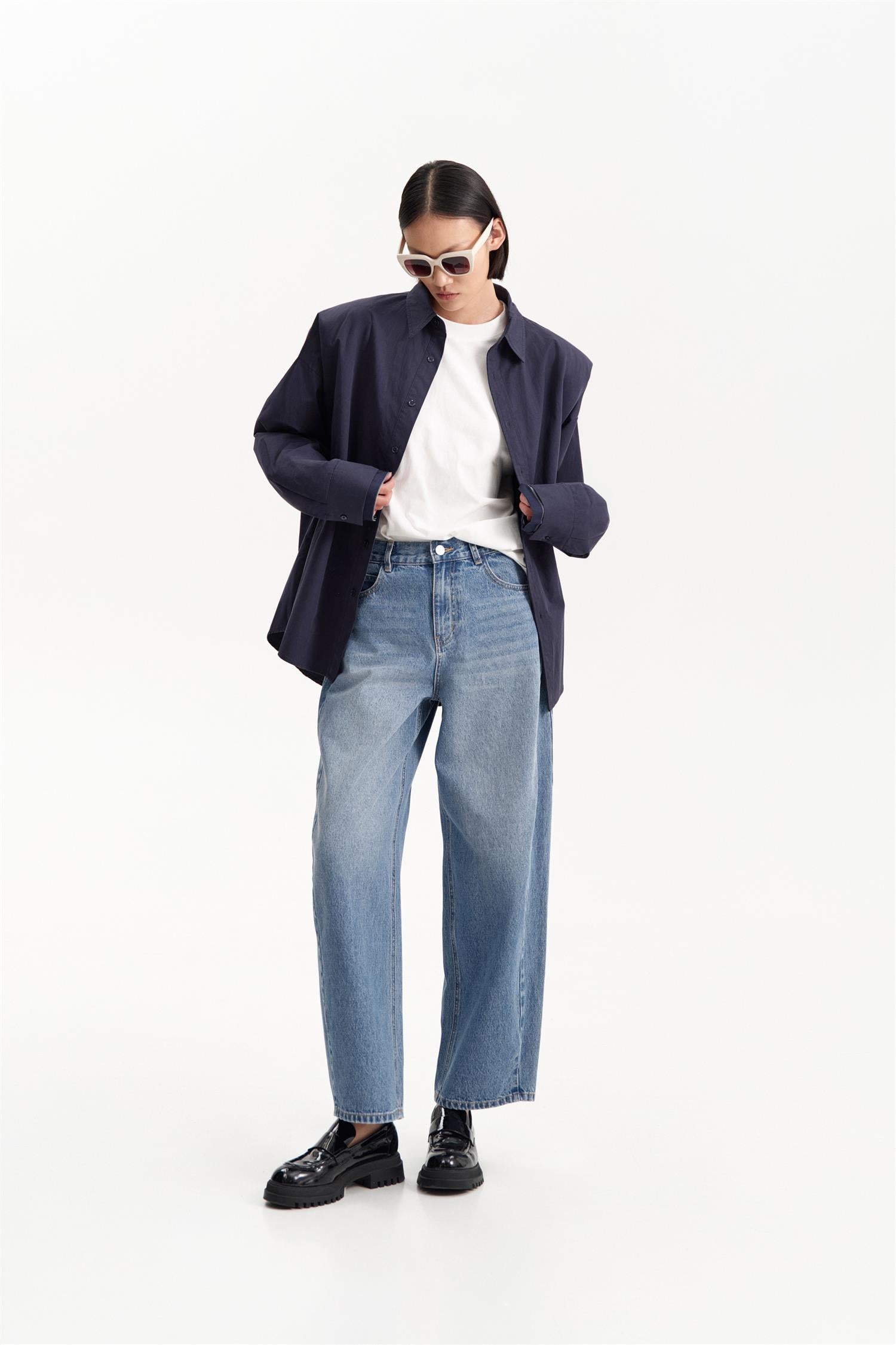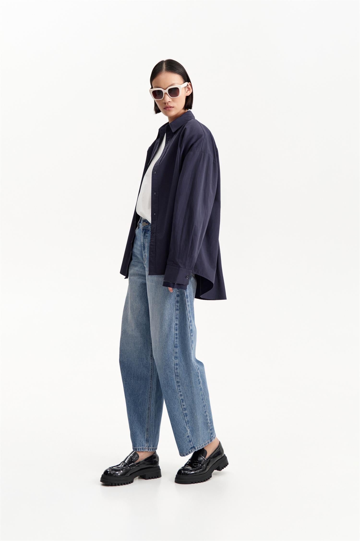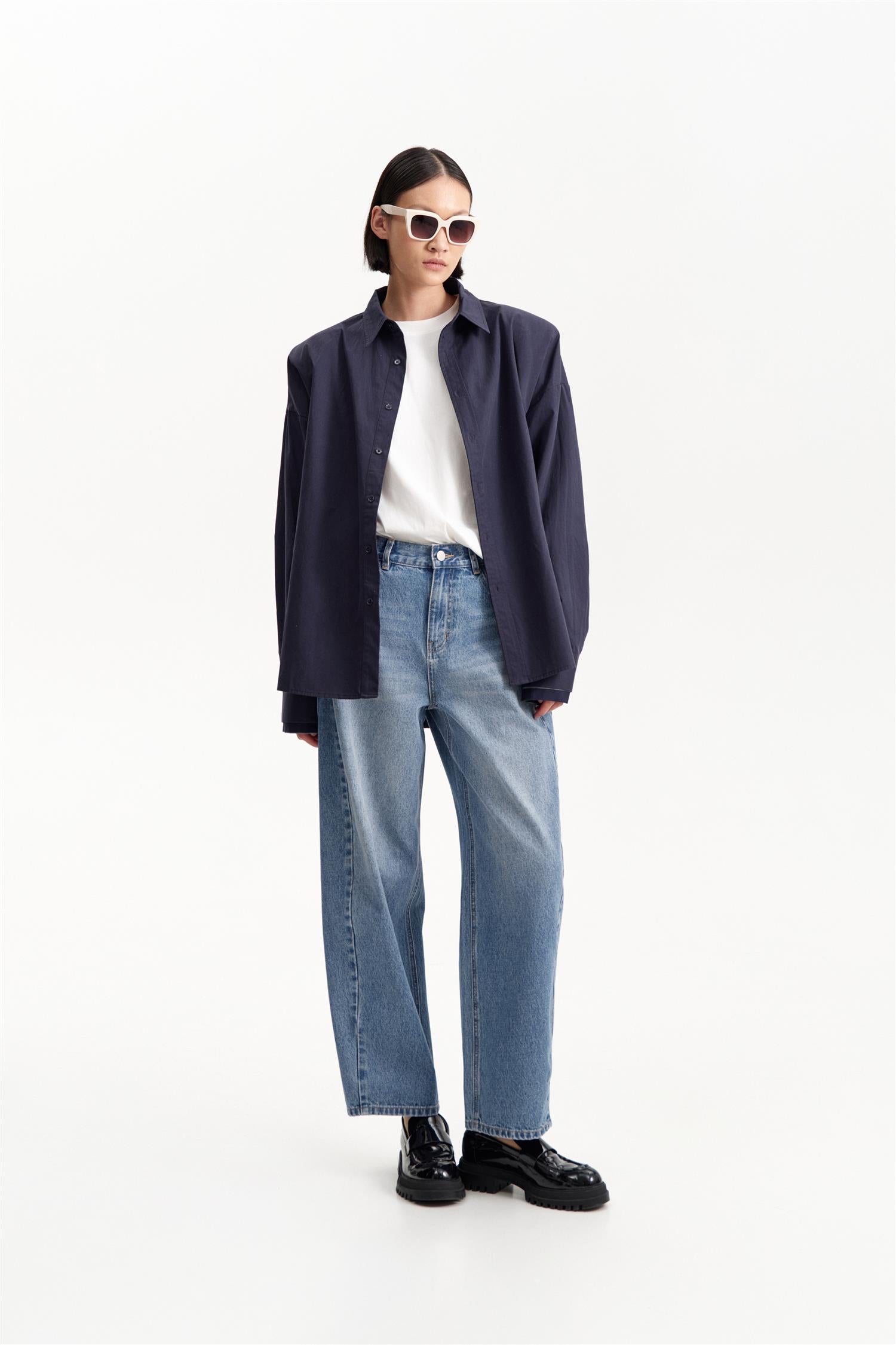 Classic Shirt Blu Notte fra Eleh. Classic Shirt Blu Notte er en oversized skjorte med dobbel ermeløsning og skulderputer som gir et moderne, strukturelt uttrykk. Skjorten har enkel knappelukking og en avslappet passform, som gjør den både komfortabel og stilig. Oversized modell. Eventuelt gå en størrelse ned.