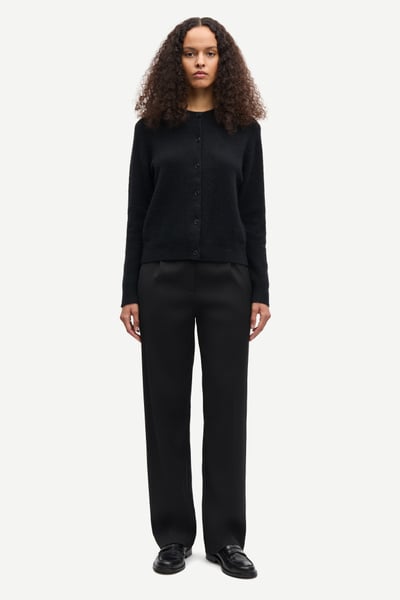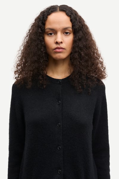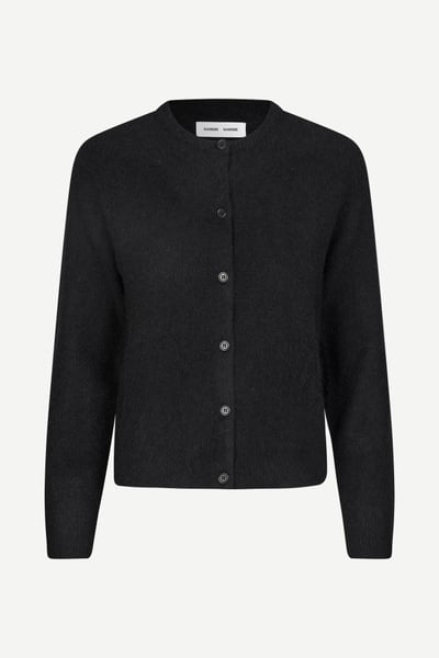 Nor Short Cardigan 7355 fra Samsøe & Samsøe. Myk cardigan med normal passform og cropped silhuett. Den har knapper foran og ribbestrikket krage, mansjetter og fald. Laget i en elastisk blanding av ull, alpakka og resirkulert polyester for en behagelig og varm følelse. Superfin å ha over en t-skjorte eller kjole! Normal i størrelsen.