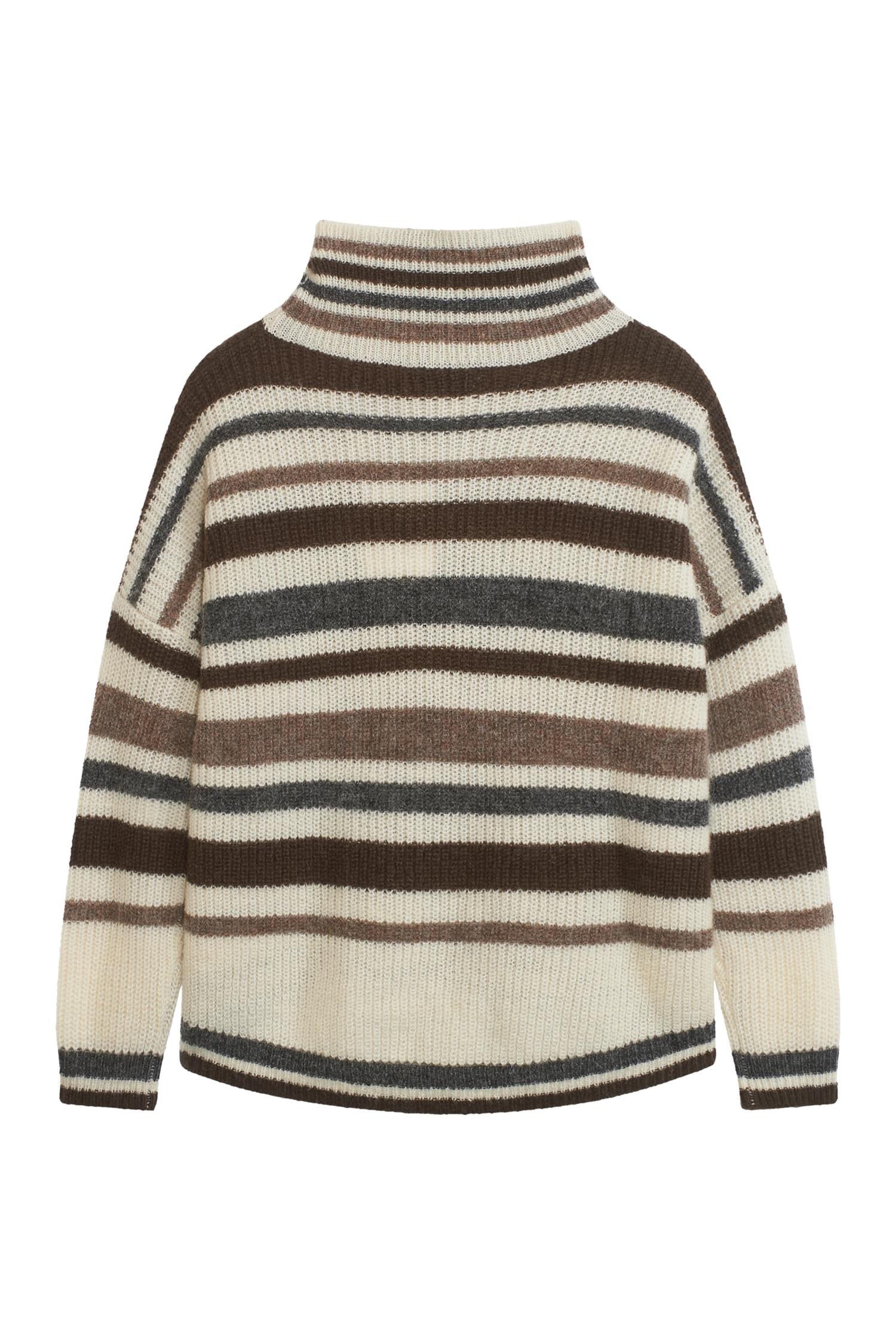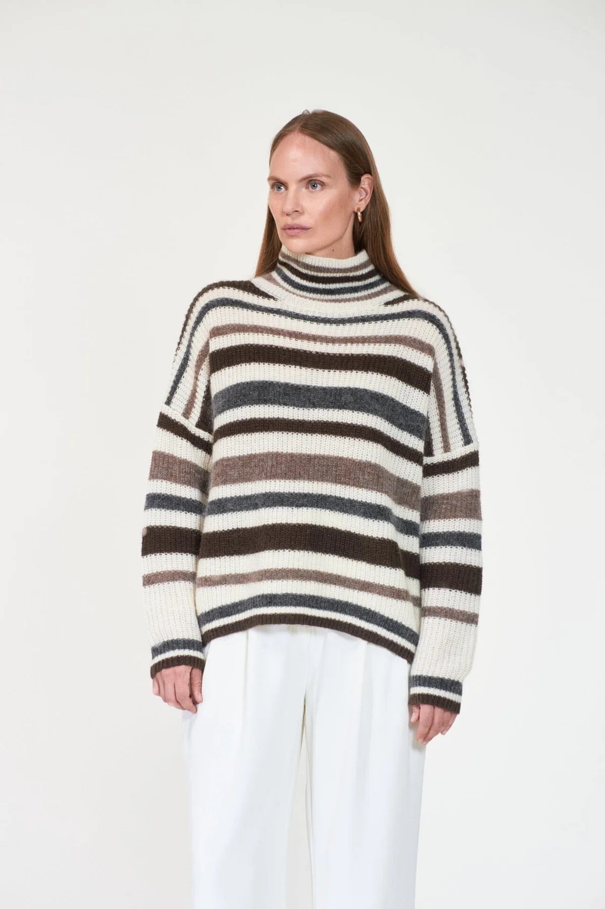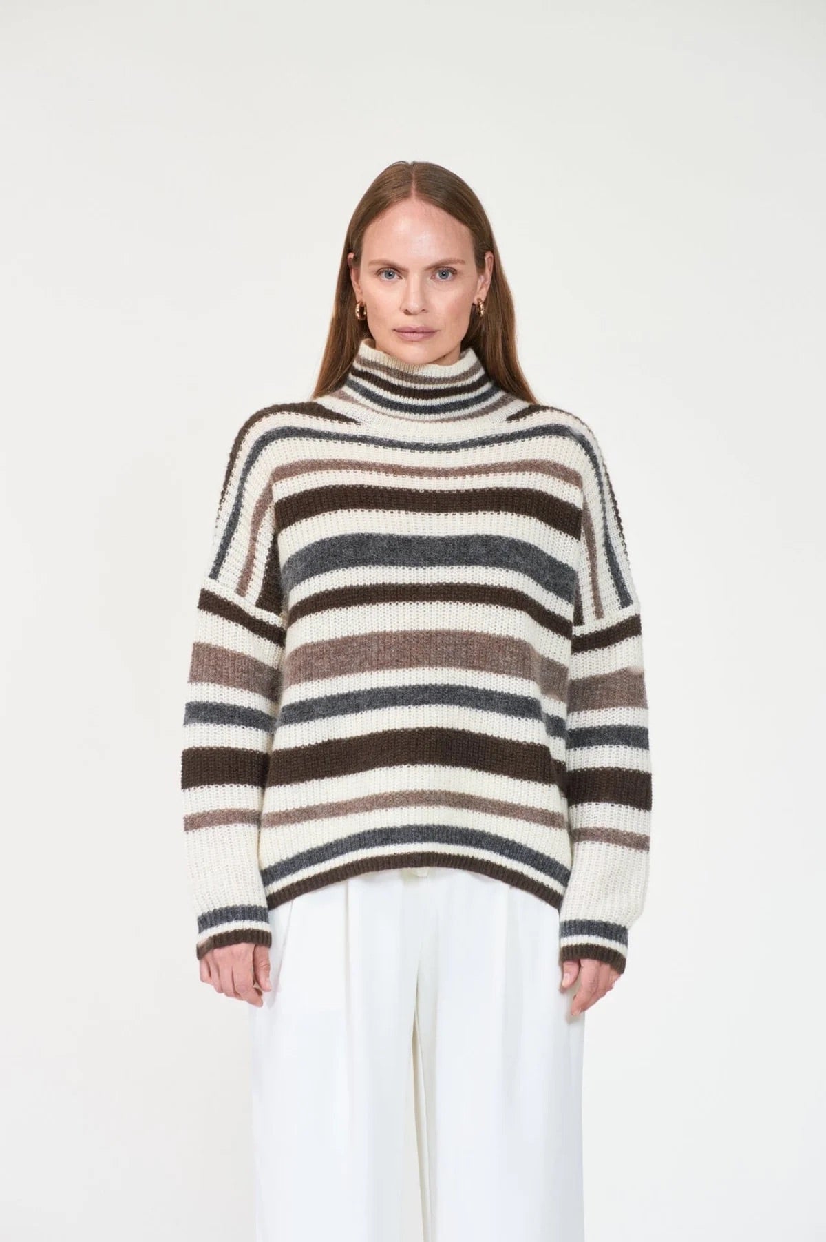 Stellar Sweater fra Arnie Says. Stellar Sweater er en myk og fluffy strikkegenser i en lett mohairblanding. Genseren har høy hals, nedfalne skuldre og en kurvet nederkant som er litt lengre bak enn foran – noe som gir en flatterende og avslappet silhuett. Genseren har en oversized passform som gjør den perfekt til både jeans, bukser og skjørt. Normal i størrelsen.