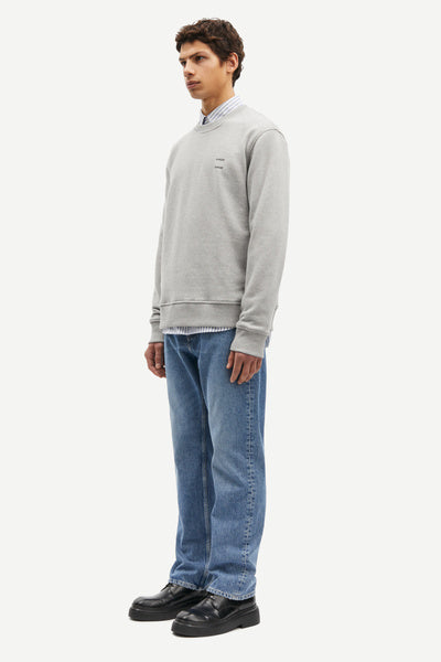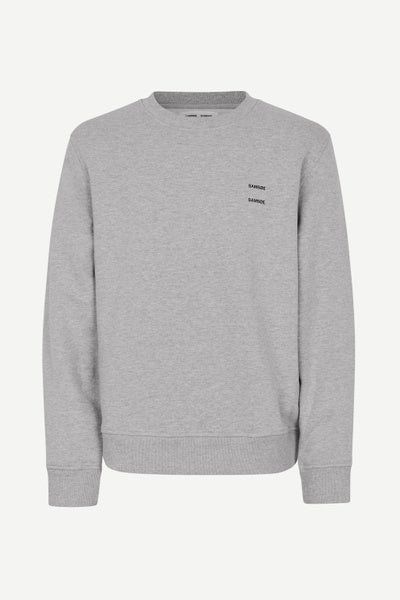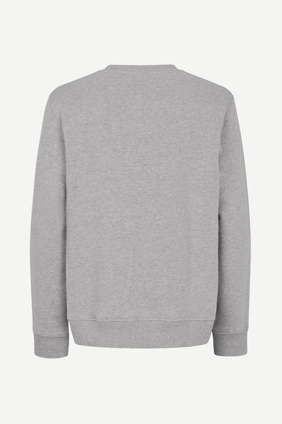 Jersey Sweatshirt fra Samsøe & Samsøe. En avslappet genser i gråmelange med ribbestrikket rund hals, mansjetter og nederkant. Modellen har et stilrent uttrykk med trykt Samsøe Samsøe-logo på brystet og er laget av økologisk bomull for både komfort og bærekraft.