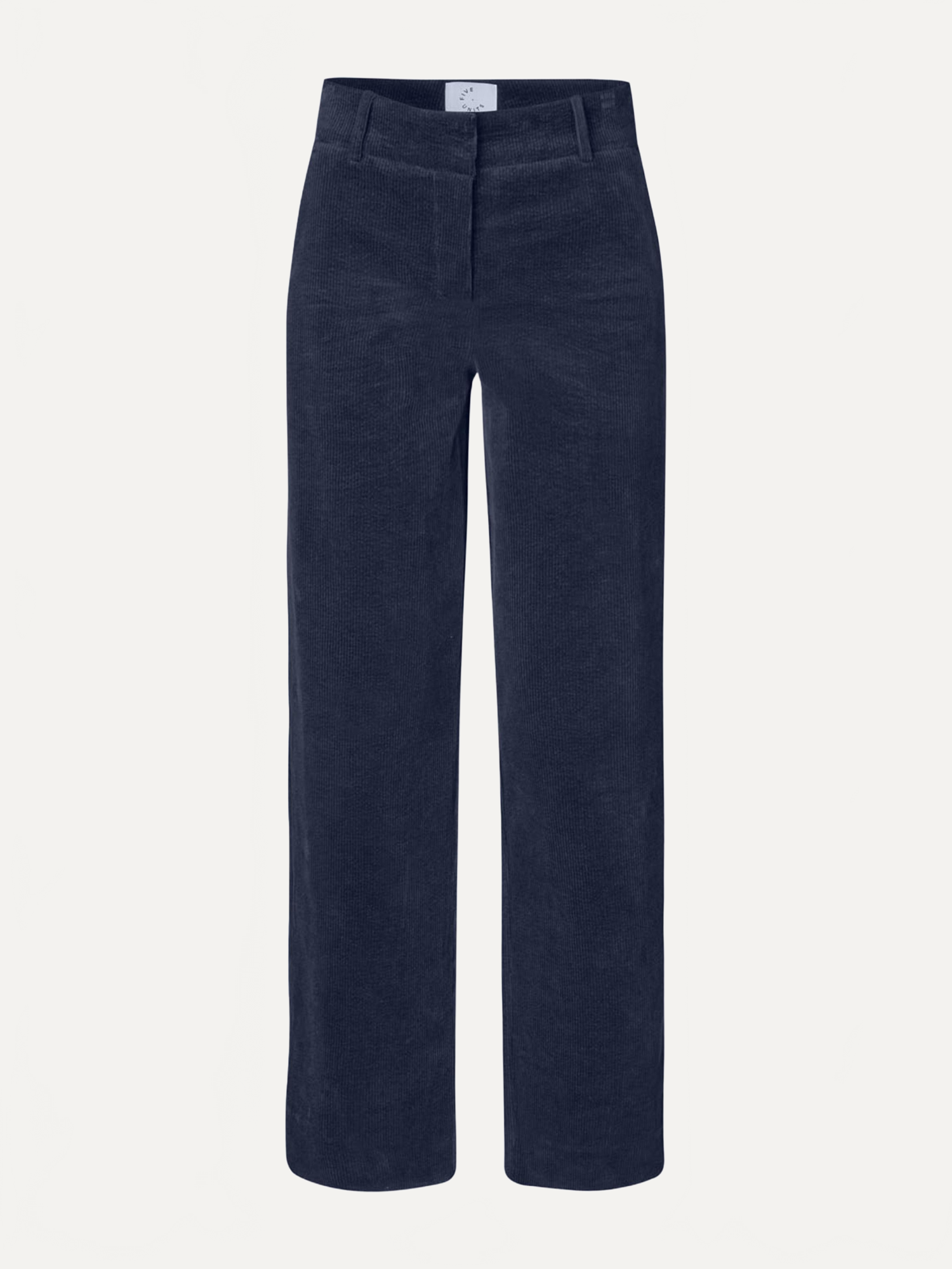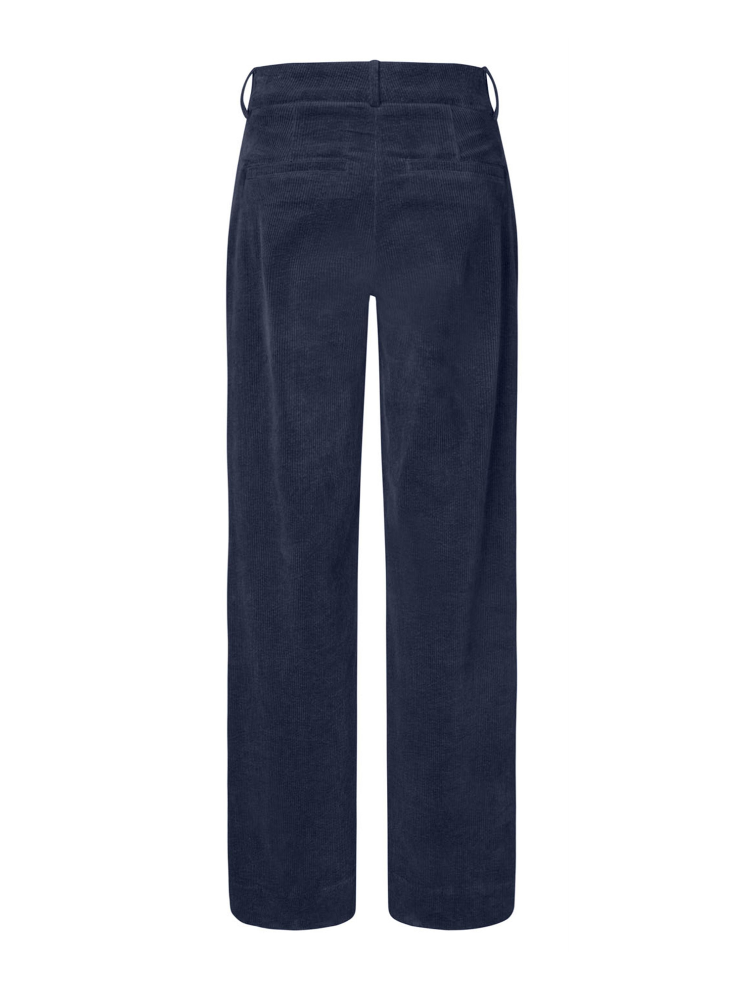 Dena Regular 837 Navy Corduroy fra Fiveunits. Dena Regular 837 er elegante bukser i mørk navy kordfløyel. Med sin myke, luksuriøse kordfløyel og stretchy kvalitet løfter de ethvert antrekk, enten du skal på kontoret, ut på middag eller i en mer formell setting. Den dype, sofistikerte fargen gir et tidløst uttrykk, mens passformen med wide straight fit og mid-waist sikrer en flatterende og behagelig silhuett. Normal i størrelsen.