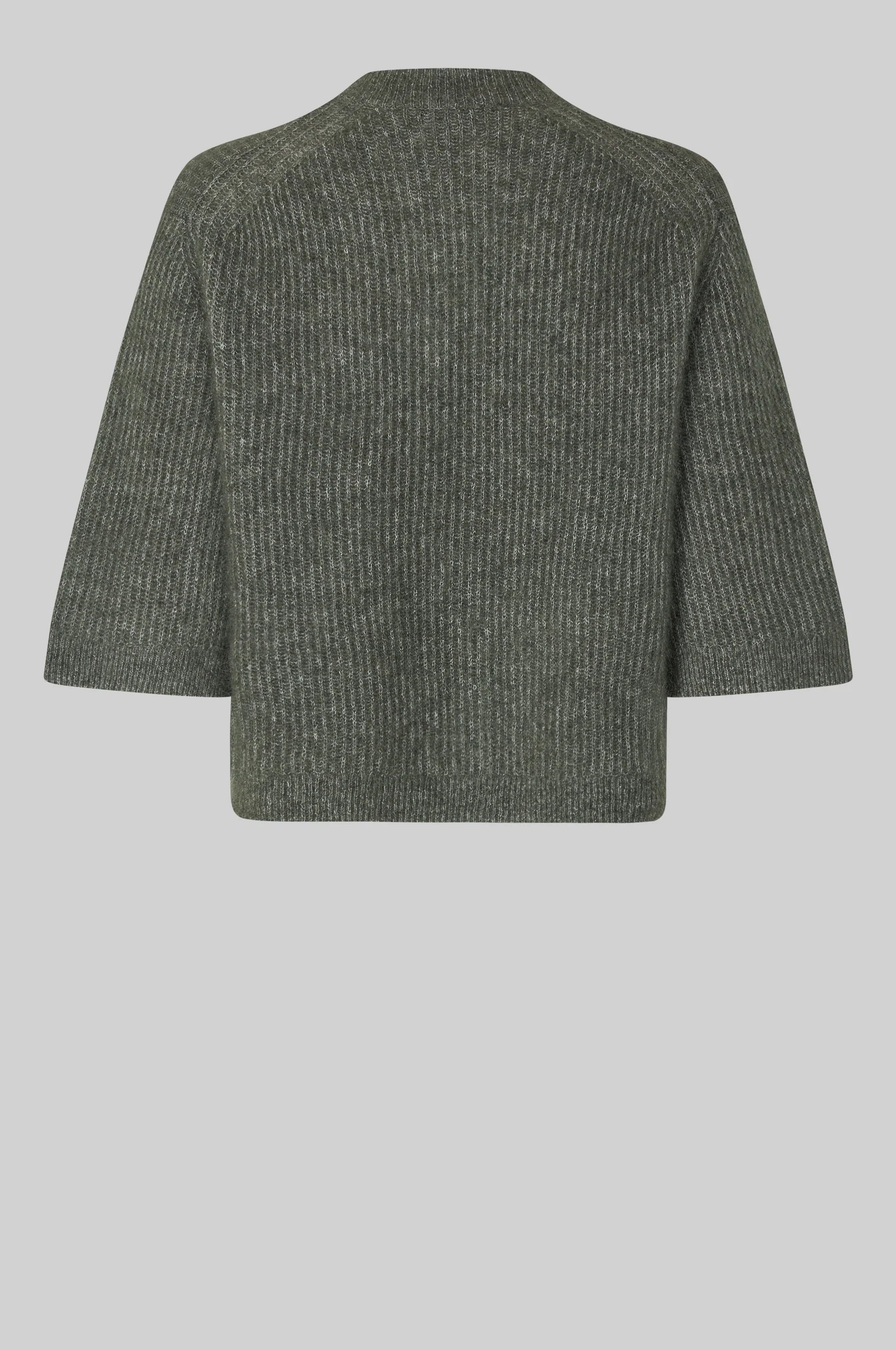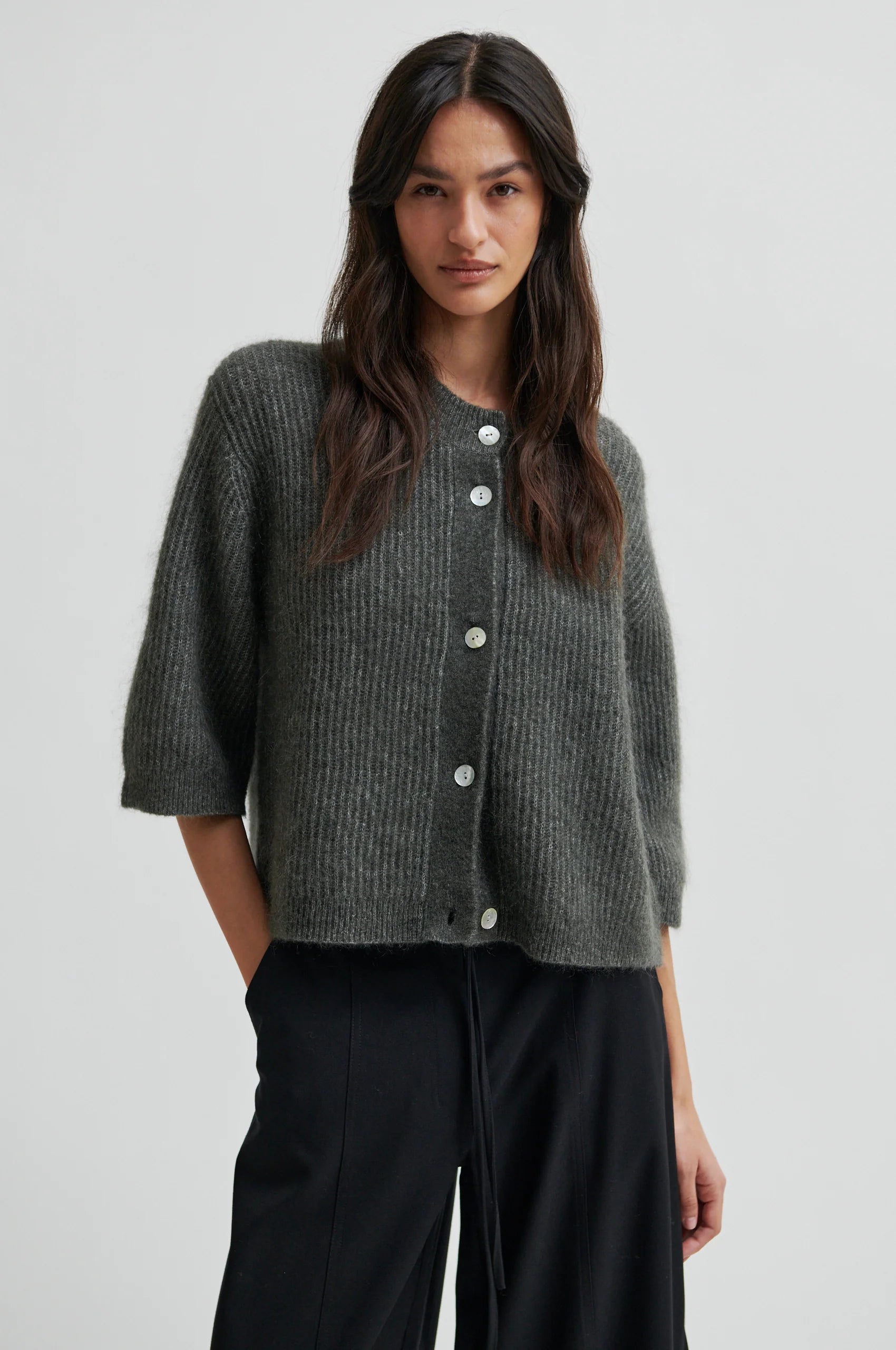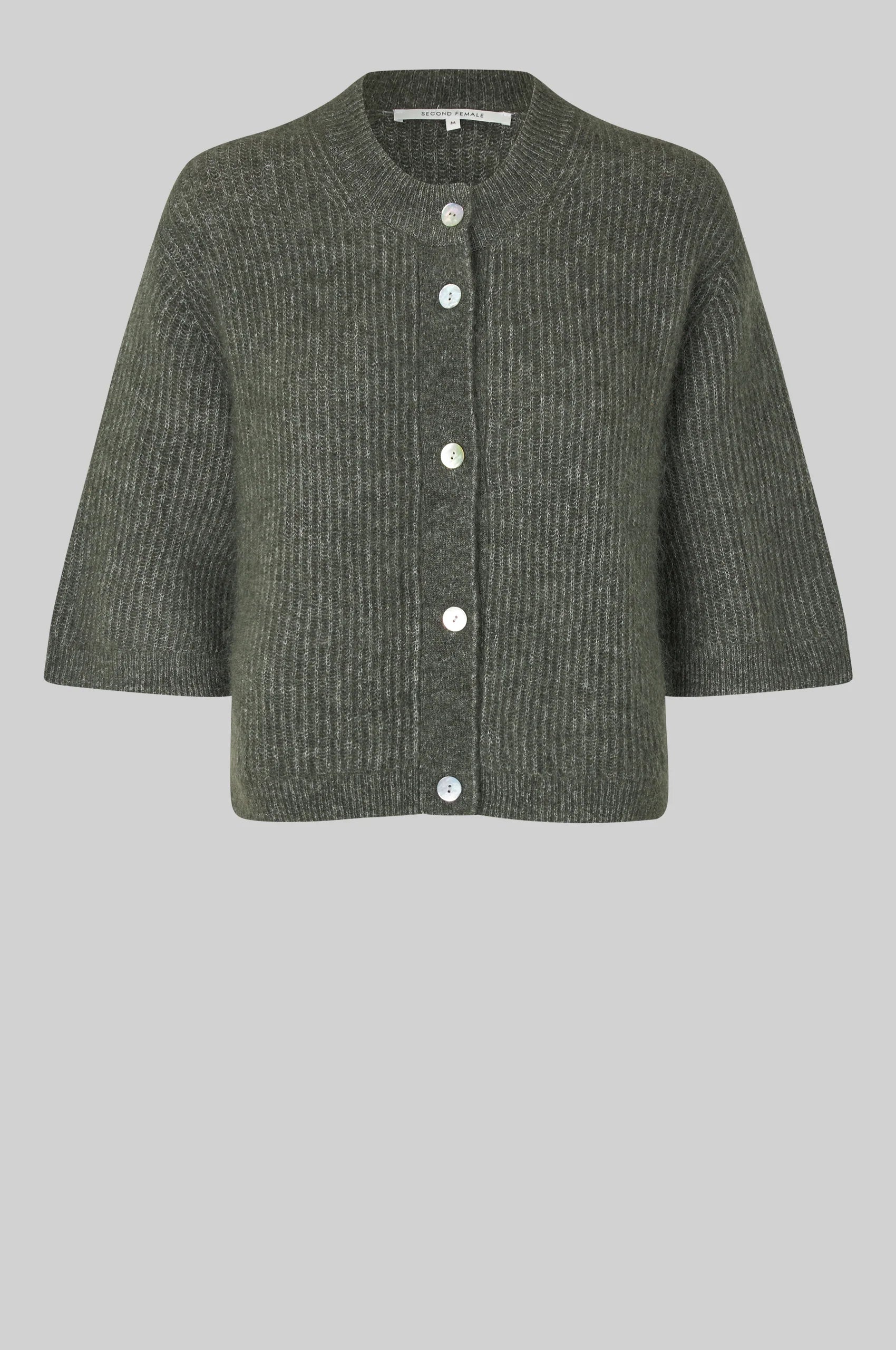 Andrea Knit Rib Cardigan fra Second Female. Andrea Knit Rib Cardigan er en kortermet cardigan i en myk mohair- og ullblanding med ribbestruktur. Designet med rund hals, gjennomgående lukking med perlemorsknapper og droppede skuldre. Regular, lett boxy passform. Normal i størrelsen.
