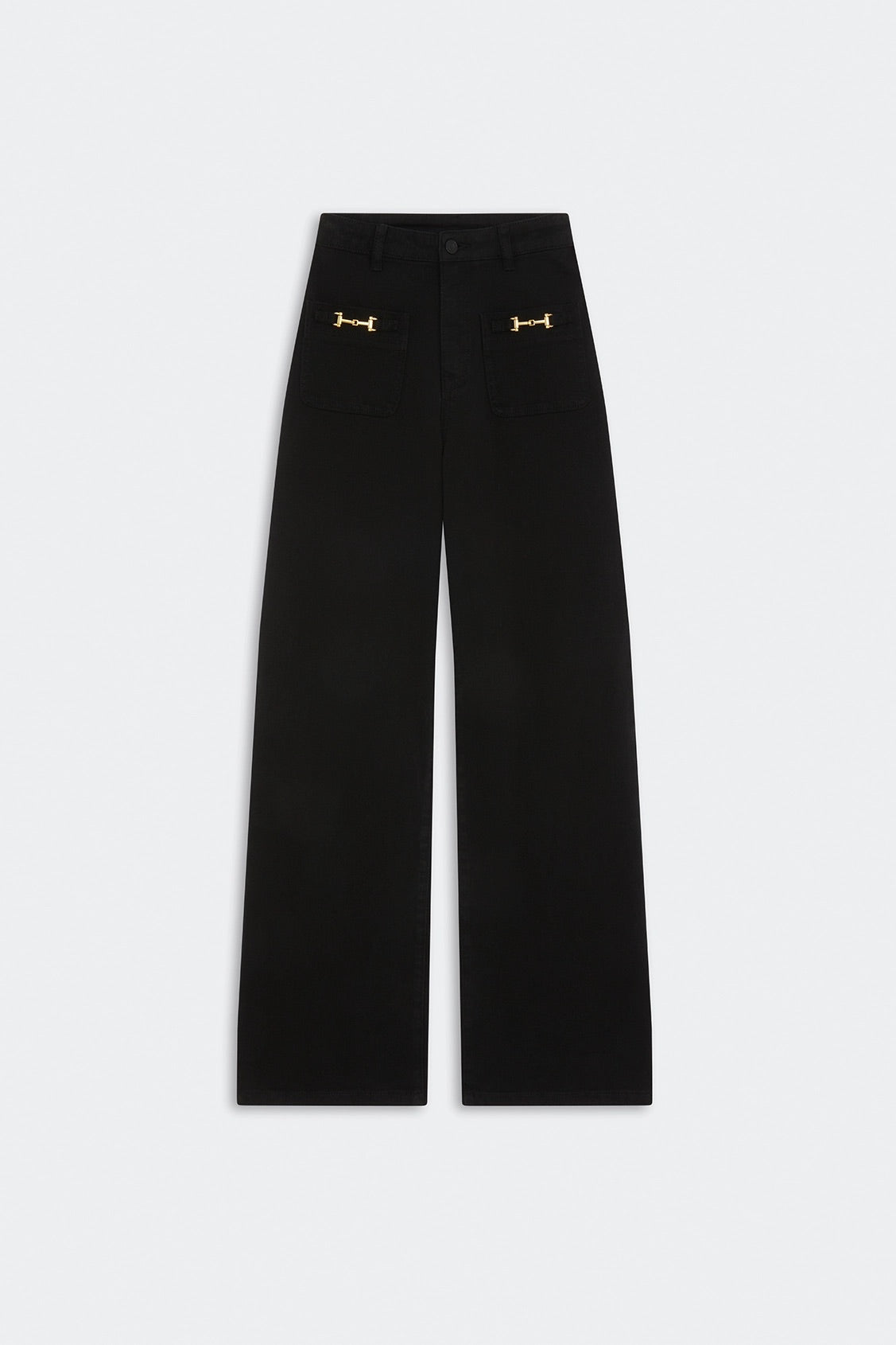 Ringo Jeans fra Suncoo Paris. Ringo Jeans er en svart denim med vide ben og markante kjettingdetaljer i gull på frontlommene. Modellen har lukking med knapp og glidelås. Normal i størrelsen.