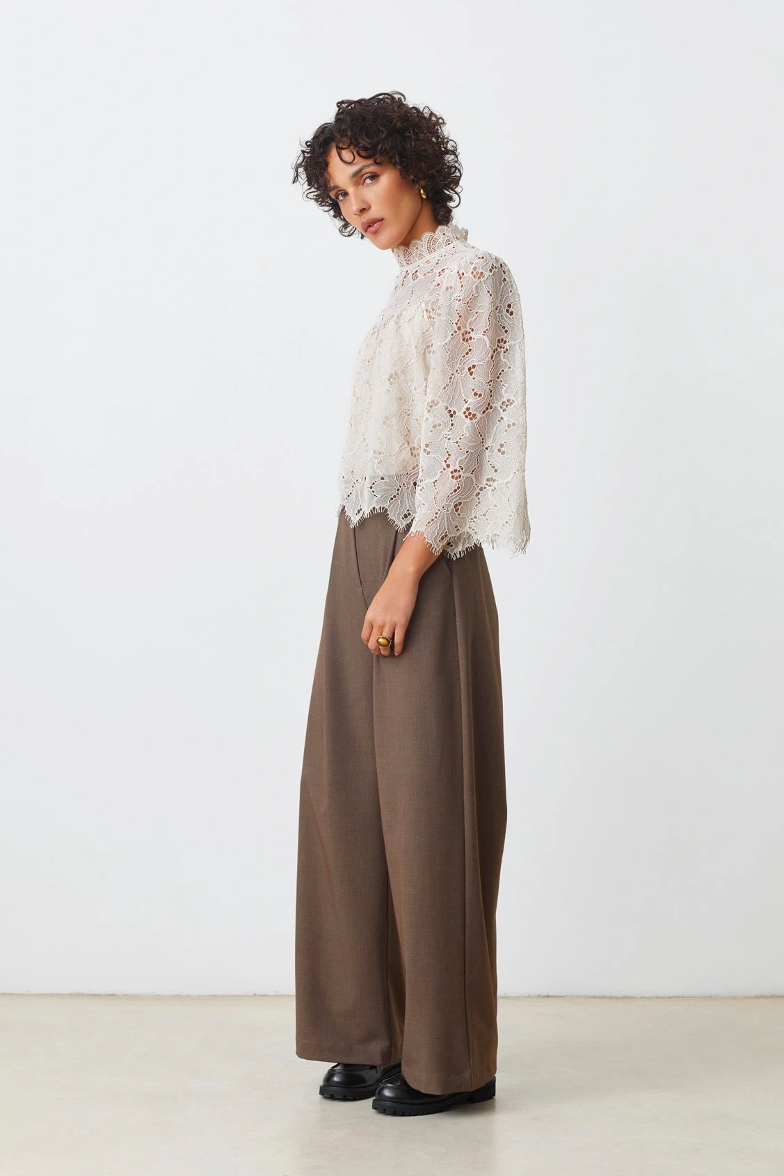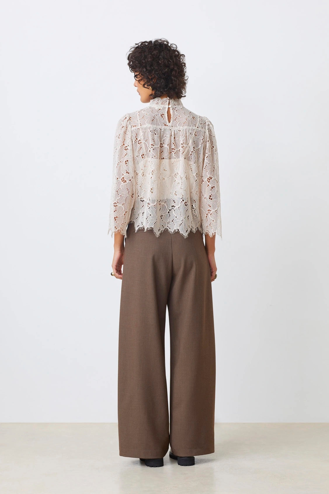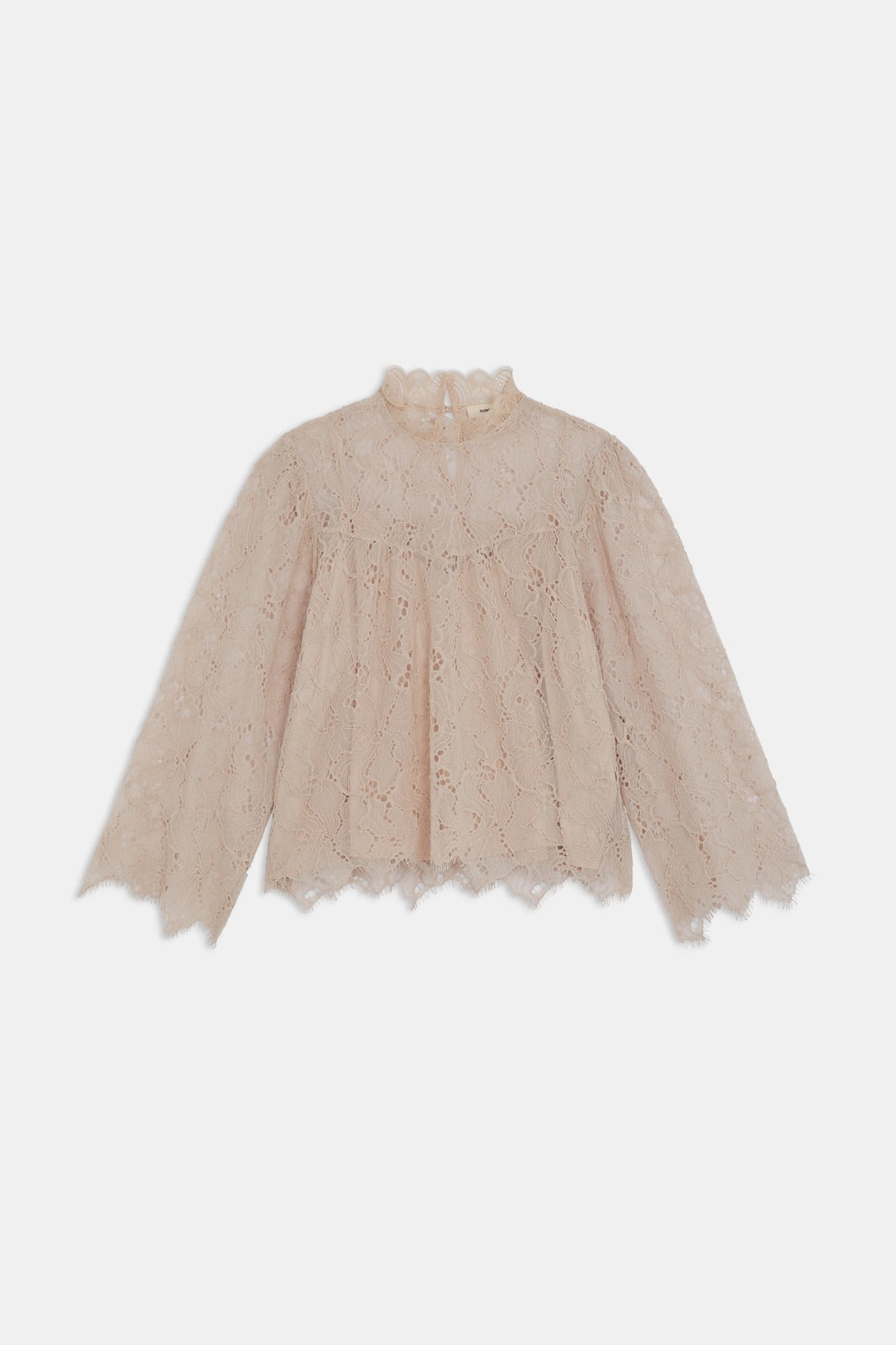 Lucia Blouse fra Suncoo Paris. Lucia Blouse er en kort blondebluse med høy hals og trekvartlange ermer i blonde. Modellen har knappelukking med to knapper bak i nakken og er helfôret. Normal i størrelsen.
