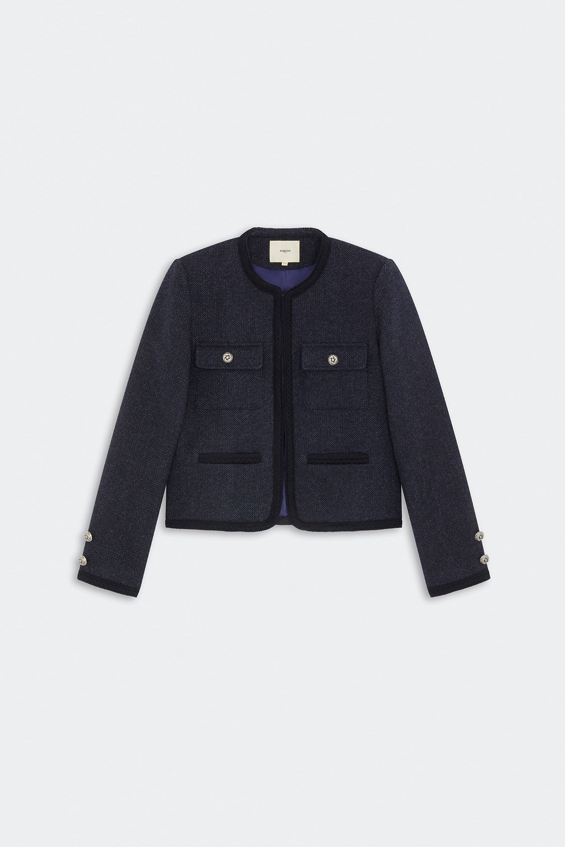 Denzel Short Woollen Jacket fra Suncoo Paris. Denzel Short Woollen Jacket er en kort ulljakke med skjult hekte- og krok-lukking. Designet med to brystlommer, lange ermer og mansjetter med knapp. Helfôret for komfort og struktur. Normal i størrelsen.