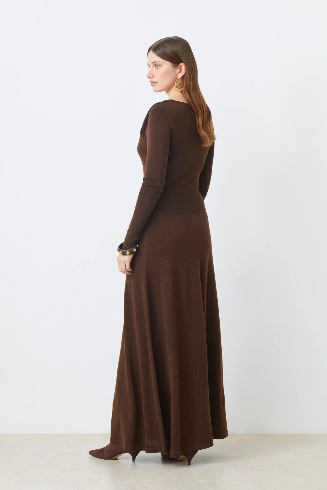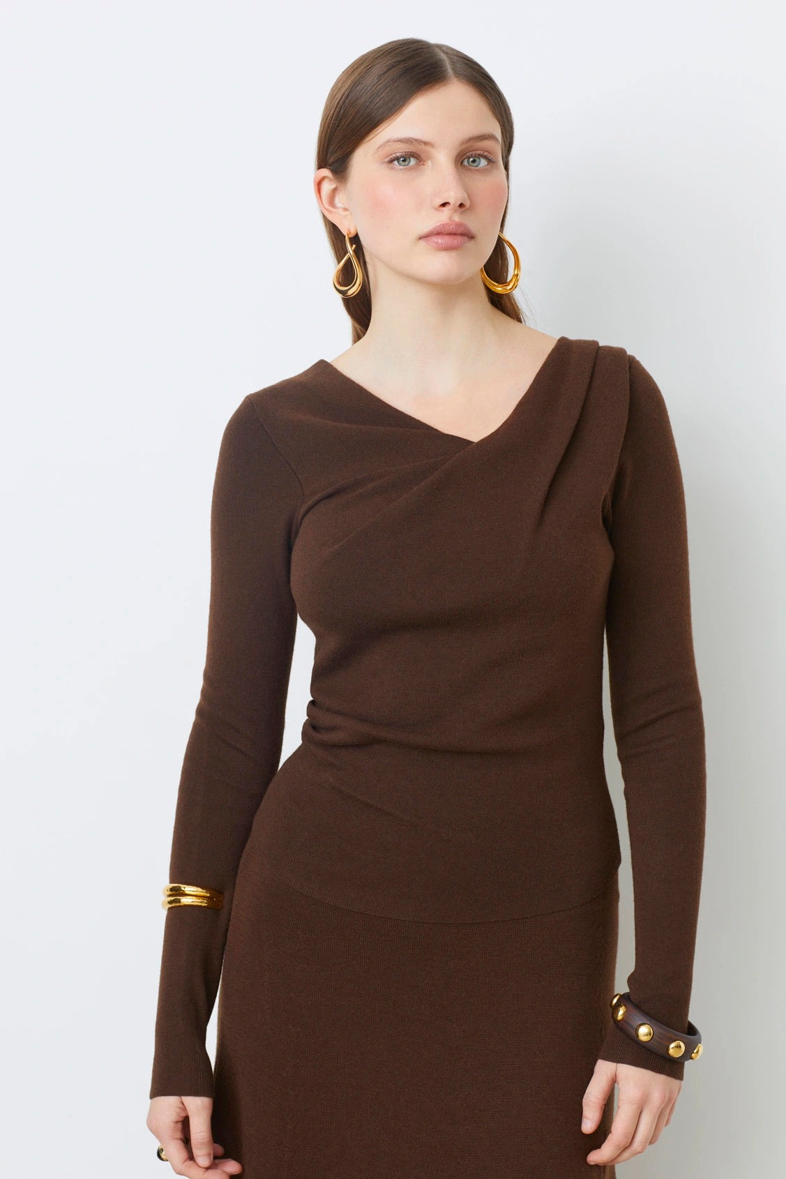 Pleor Jumper fra Suncoo Paris. Pleor Jumper er en tynn genser i kaffebrun fargetone med drapert V-hals og feminine detaljeringer ved utringningen. Modellen har lange ermer og er laget i et kroppsnært materiale som gir en flatterende passform. Normal i størrelsen.