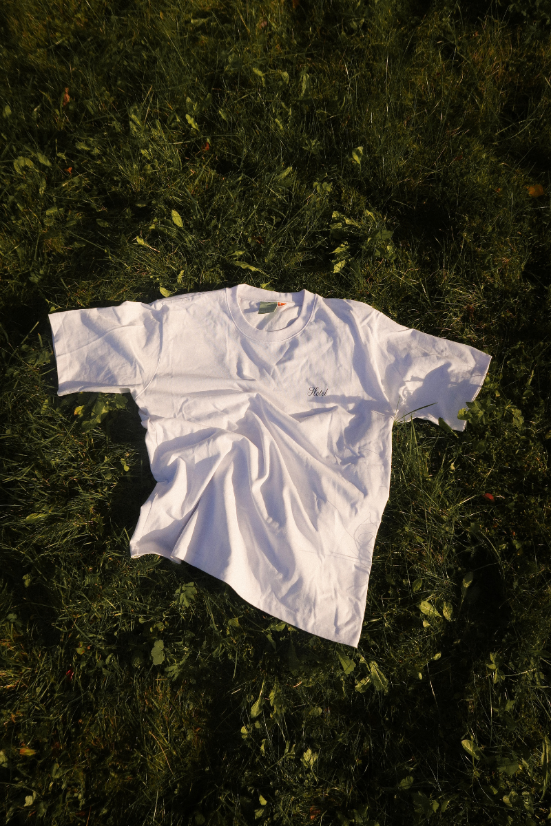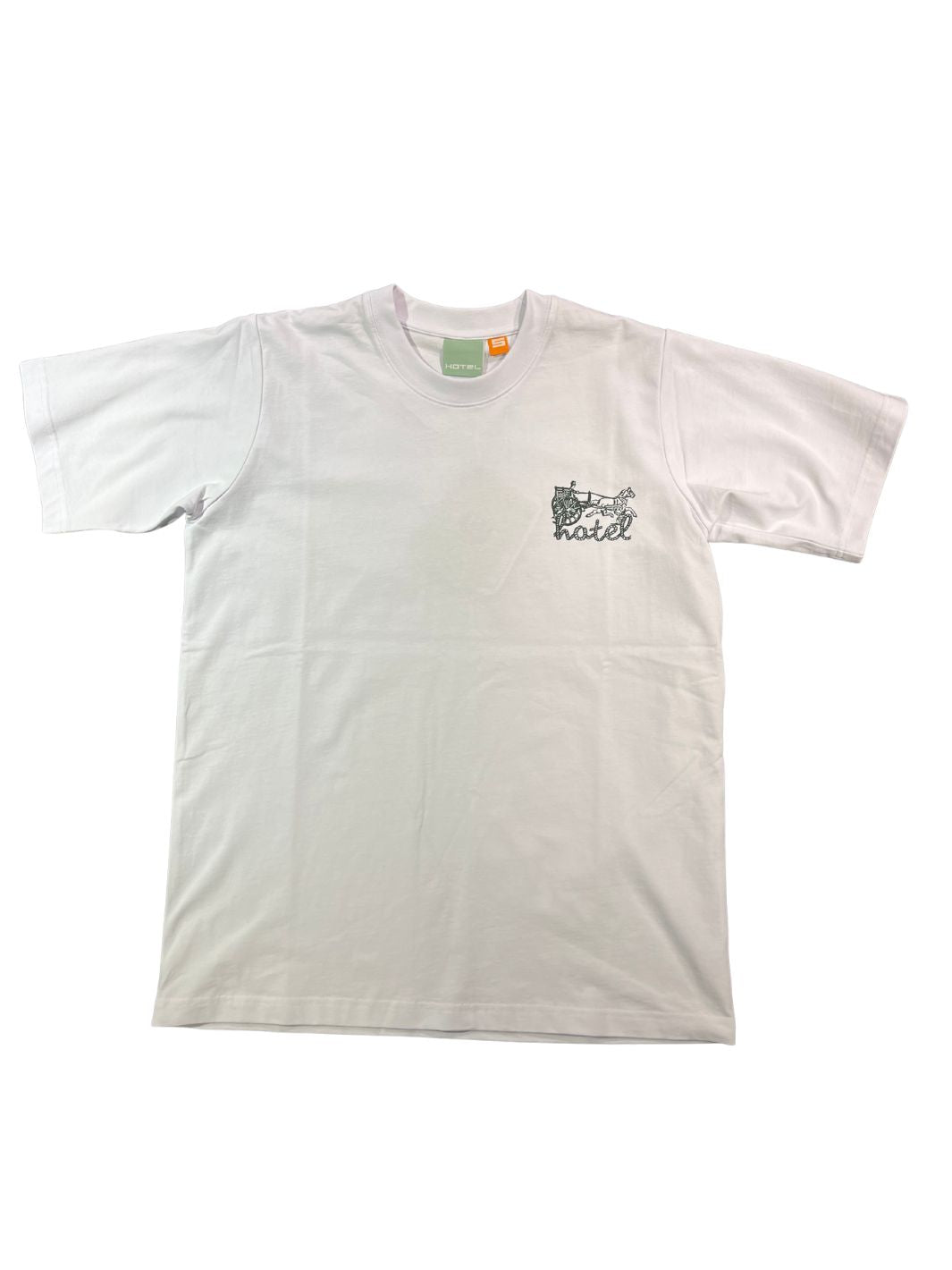 Wagon Tee fra Hotel. Wagon Tee fra Hotel er en kul og komfortabel t-skjorte med logo i front. Den har en avslappet, oversized passform som gir et trendy og laidback uttrykk. T-skjorten er unisex og normal i størrelsen, og passer perfekt til både hverdagsbruk og avslappede antrekk.