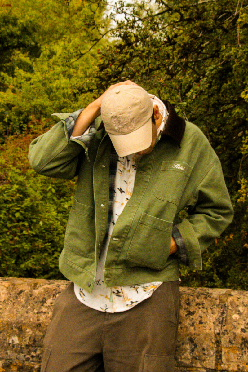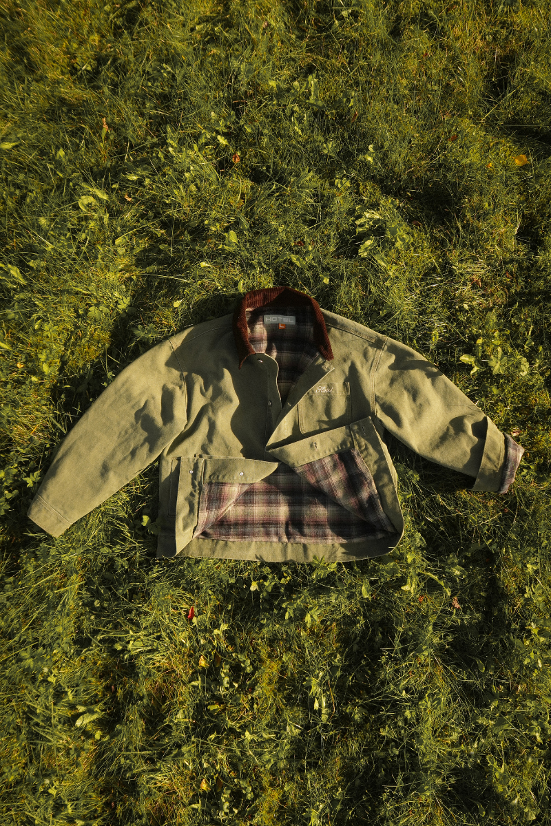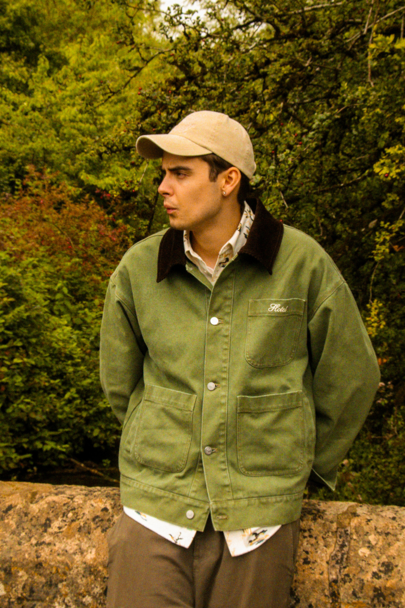 Canvas Chore Jacket fra Hotel. Canvas Chore Jacket er en dødskul og tidløs jakke med et avslappet, oversized uttrykk. Den er designet med praktiske lommer i front, knappelukking og en stilig kordfløyelskrage som gir den et unikt og røft preg. Jakken har børstet flanellfôr på innsiden for ekstra komfort og varme, og Hotel-logoen på brystlommen gir en subtil, men tydelig detalj. Den er unisex og normal i størrelsen, og passer perfekt til både hverdagsbruk og lag-på-lag-styling gjennom sesongen.