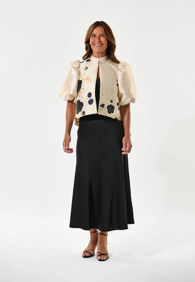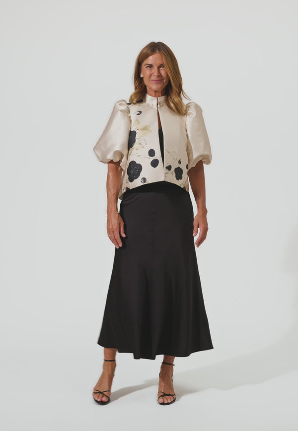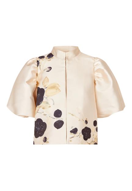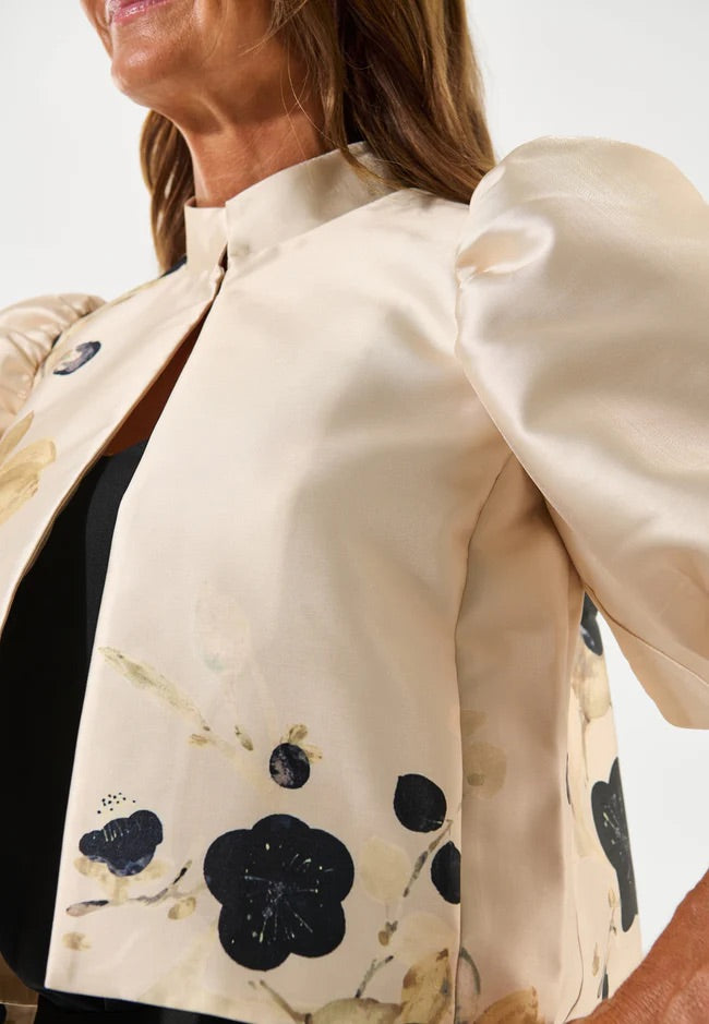 Olivia NS-Jacket fra Dea Kudibal. Olivia NS-Jacket er en elegant jakke/topp som skaper en dramatisk, skulpturell silhuett – perfekt for kveldsbruk eller spesielle anledninger. Jakken har store ballongermer og en høy krage som gir et moderne og sofistikert uttrykk. Den lukkes i halsen med hempe og krok, og har diskrete lommer i sidesømmene som gir en ren og gjennomført finish. Normal i størrelsen.