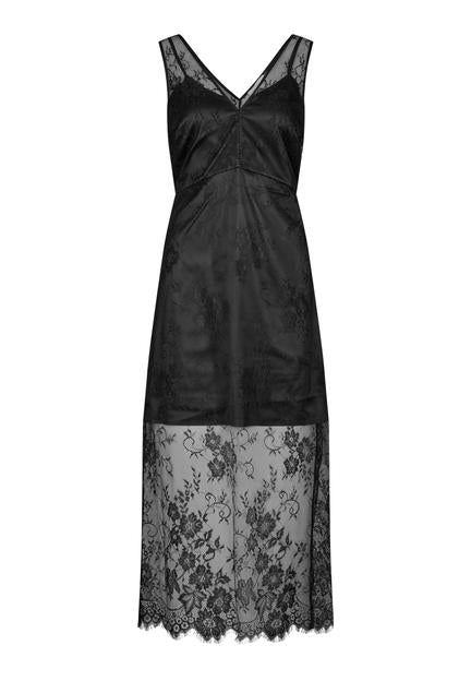 Teba Lace Dress fra Dea Kudibal. En elegant kjole med feminin silhuett og lekre blondedetaljer. Kjolen har dyp V-utringning, smale skulderstropper og en flatterende omslagseffekt i livet som fremhever figuren. Det gjennomsiktige blondestoffet gir et sofistikert uttrykk og skaper en vakker kontrast mot den korte underkjolen. Perfekt til festlige anledninger. Normal i størrelsen.